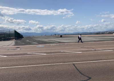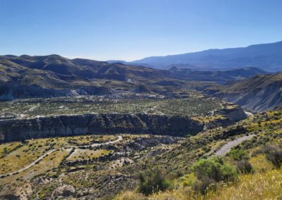 Als we gaan ontbijten in een cafetaría zien we daar ook onze Vlaming weer. De grote tent is stampvol en het is een kabaal van jewelste op de vroege ochtend. We kunnen nog een tafeltje bemachtigen waar we met z’n drieën kunnen eten. We nemen daarna afscheid en hebben deze keer een verschillende bestemming. Het is heel ander weer dan gisteren. De zon schijnt al uitbundig en trekt de temperatuur naar de dubbele cijfers. We fietsen Guadix uit en hebben meteen zicht op de mooi uitgelichte besneeuwde toppen van de Sierra Nevada. Bijna heel de route blijft dit zo. We volgen een weg parallel aan de snelweg. Er zitten veel korte maar heel steile klimmetjes in. Bij de afdaling proberen we vaart te maken voor het volgende klimmetje. We rijden ook enkele graveltrajecten.