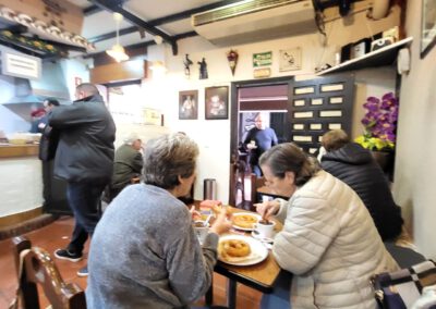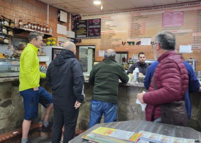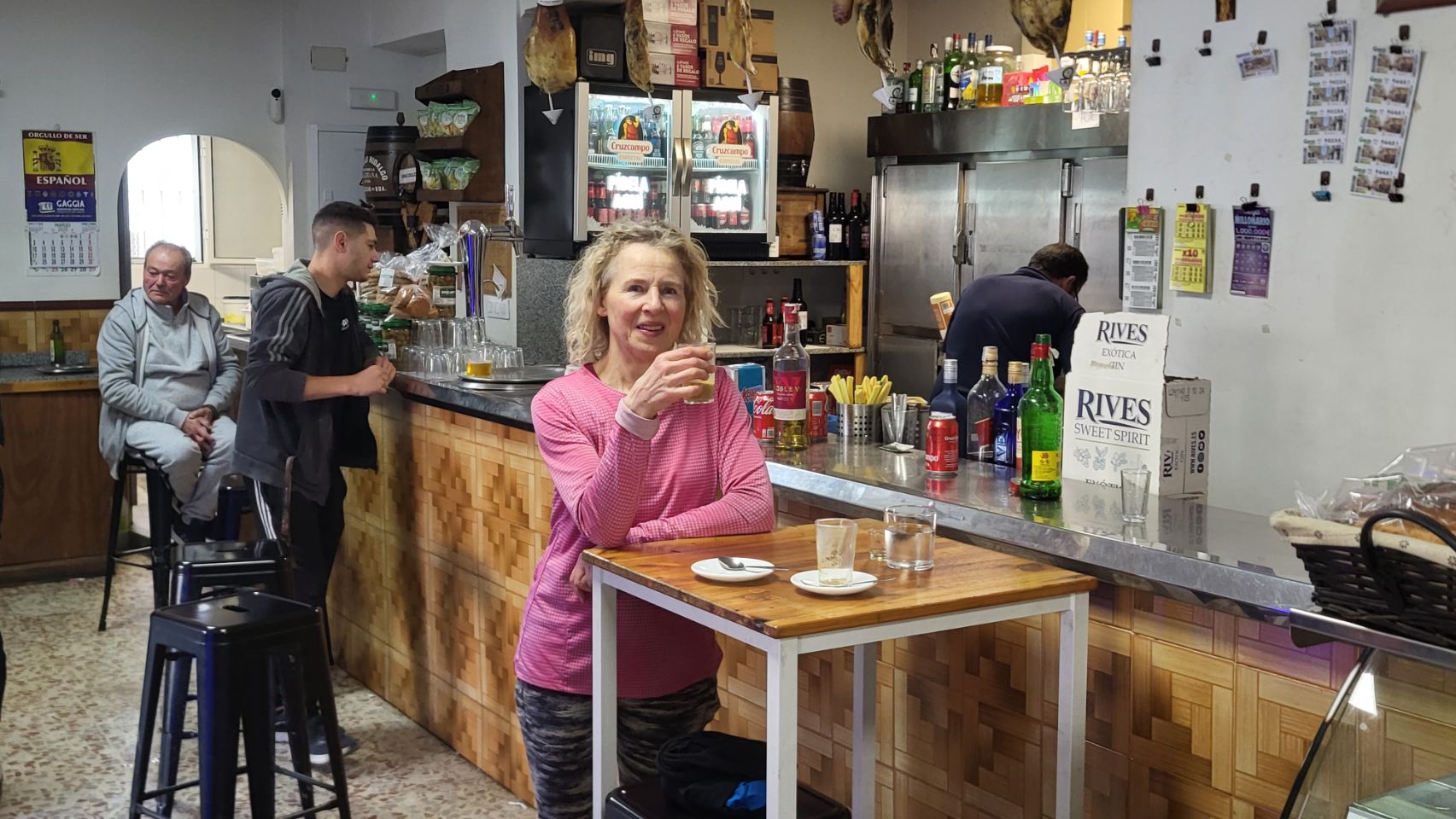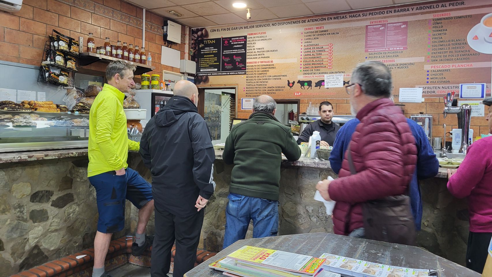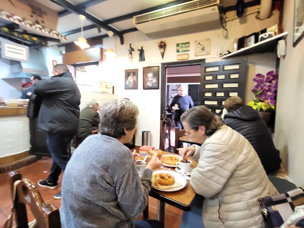 Gisteravond is het niet meer droog geworden en als we wakker worden horen we de regen al weer, of nog steeds (?) kletteren. Maar zodra we vertrekken, is het zowaar droog. Na een paar kilometer stoppen we bij een bar voor een ontbijt. Het is er gezellig druk en lawaaiig. Spanjaarden ontbijten vaak buiten de deur en veel bars bieden dit al vroeg aan. Er is al een uitgebreide keuze op de vroege ochtend, maar tostada con tomate y café con leche is het meest geliefd. Ook churro’s in gespecialiseerde bars zijn een populair ontbijt.