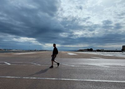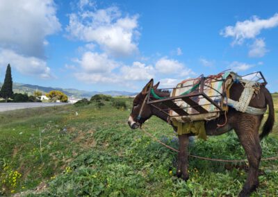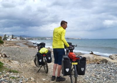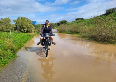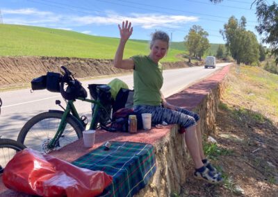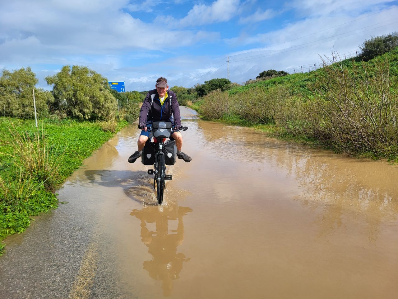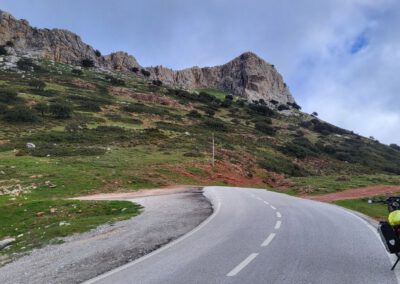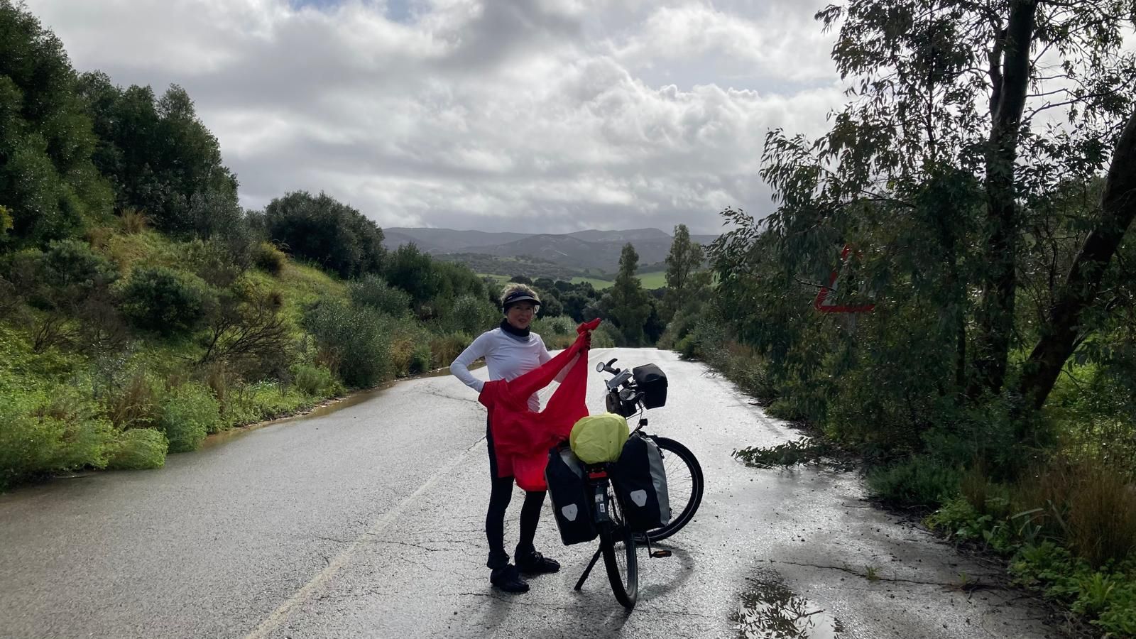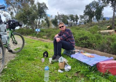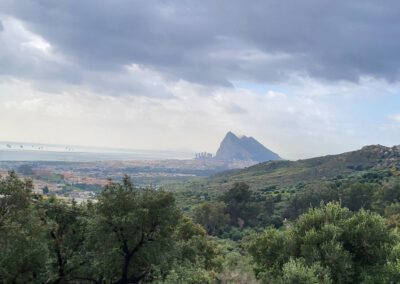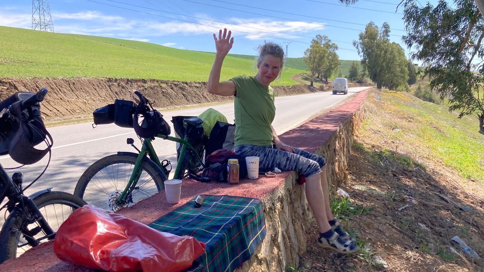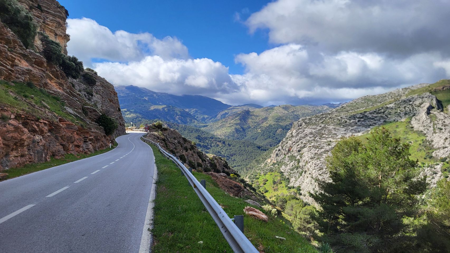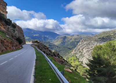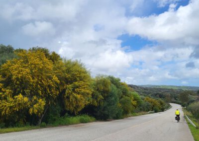 Vandaag gaan we via een gravelroute door de bergen naar Tarifa, de zuidelijkste punt van Spanje, de twee kleine Spaanse enclaves in Marokko niet meegerekend. Het weer is nog steeds onstuimig, maar ook vandaag blijven we grotendeels droog. We genieten van de schitterende omgeving. We zien veel grote roofvogels rond de bergpieken zweven, al moeten we ook vaak naar beneden op het gravelpad turen om de grootste oneffenheden een beetje te ontwijken. We klimmen en dalen, het is bijna nergens vlak.
