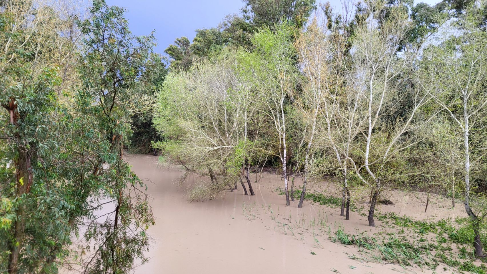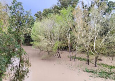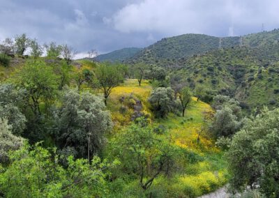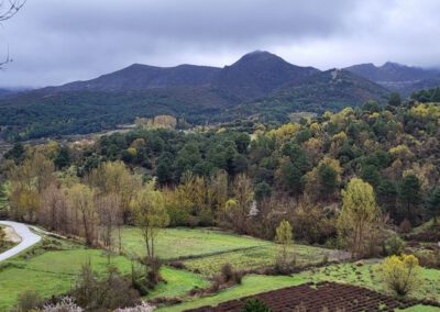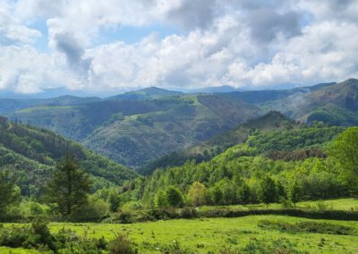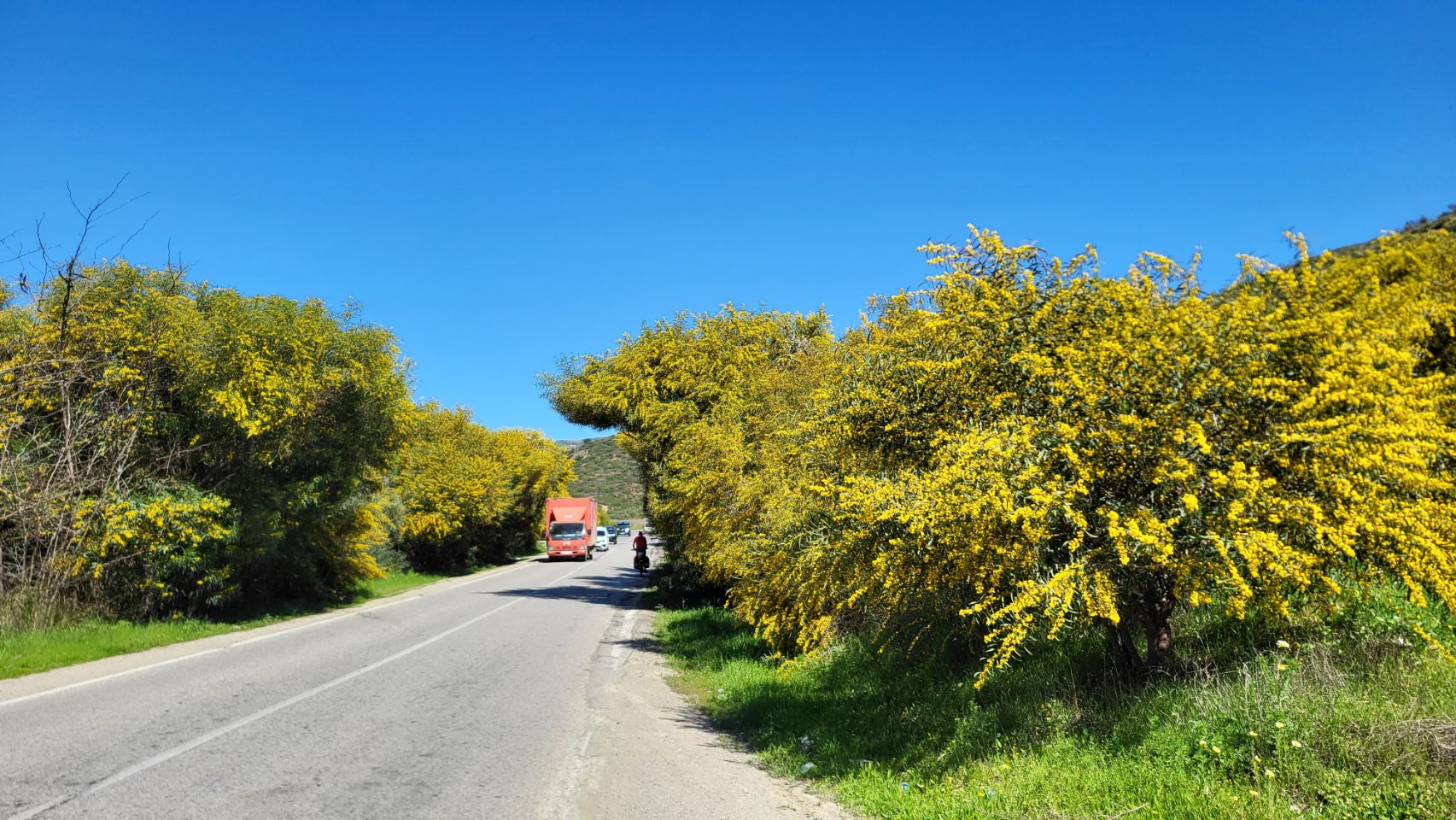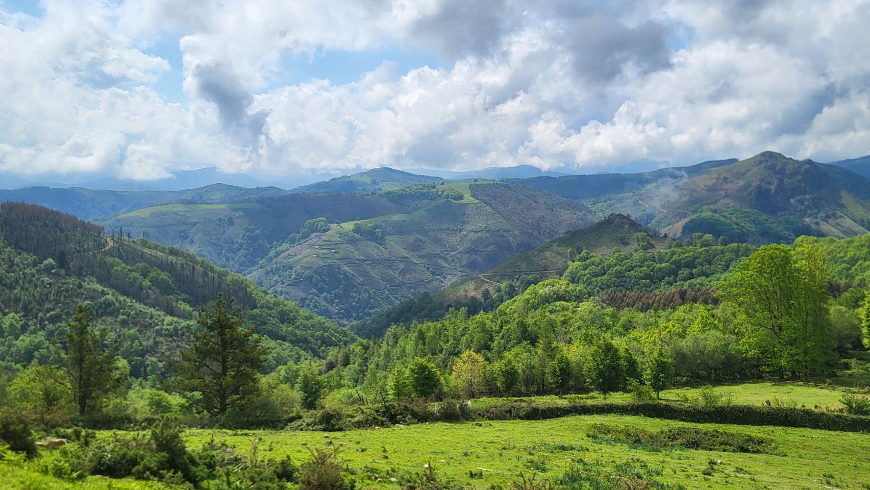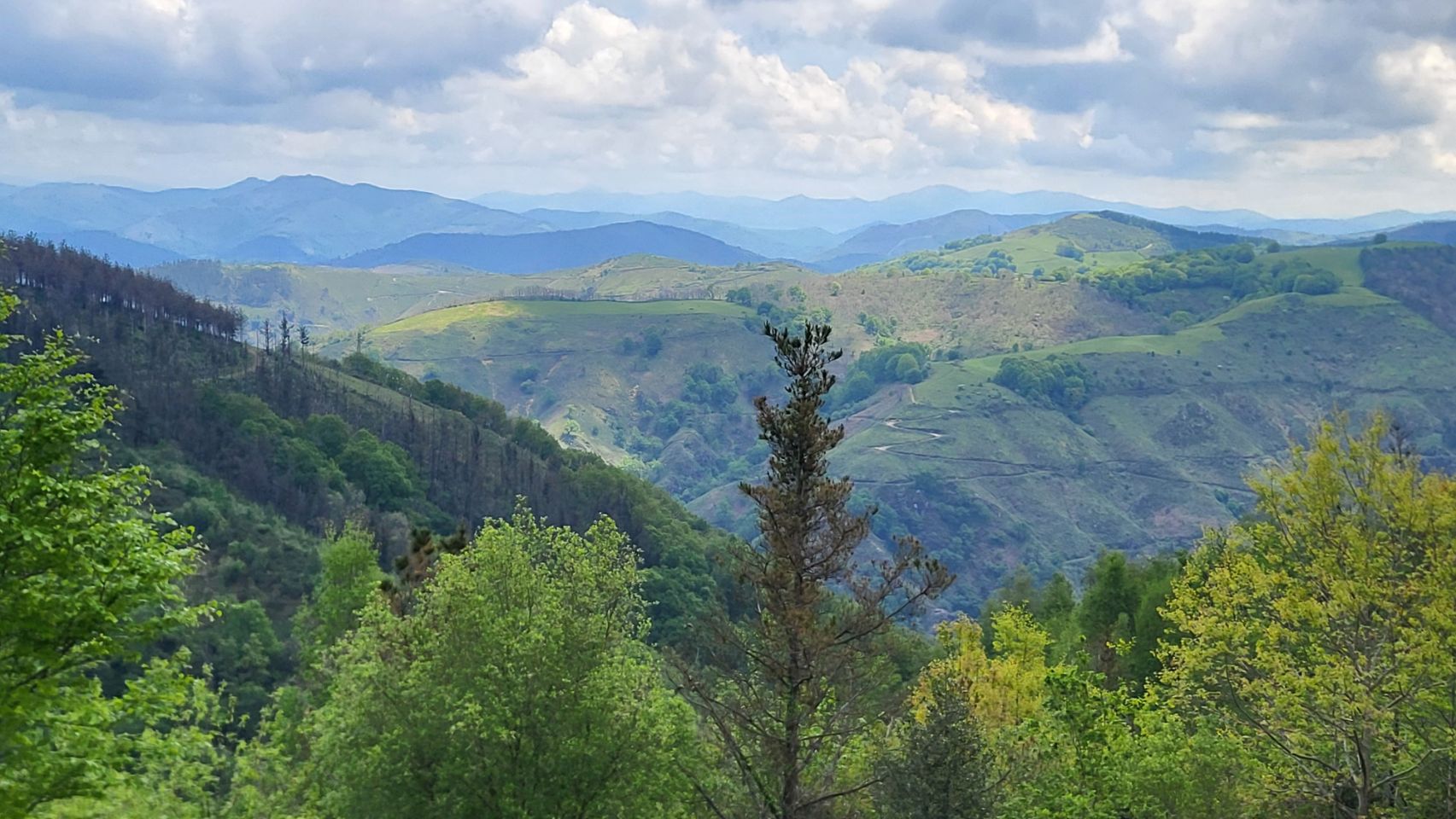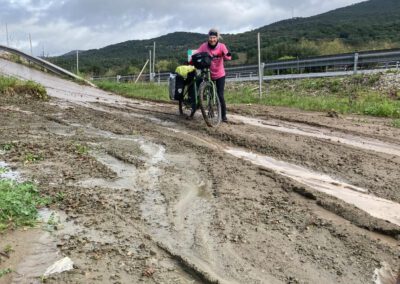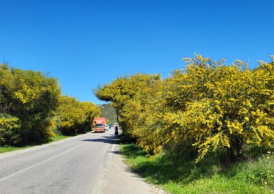 In hoog tempo wordt alles geserveerd en iedereen kwebbelt druk in rap Spaans. Tijdens het ontbijt komt weer een stortbui over, die hebben we mooi gemist. De rest van de dag hebben we zowaar ook geluk. De voorspelde regen valt net niet waar wij fietsen en regelmatig komt zelfs de zon door. De omgeving is erg mooi met beboste heuvels. De mimosa en brem bloeien vrolijk geel langs de weg. Ik blijf nog steken in een kleine landslide en loop vast in de 10 cm dikke modderlaag zodat ik mijn voeten er wel in moet steken om niet om te vallen.