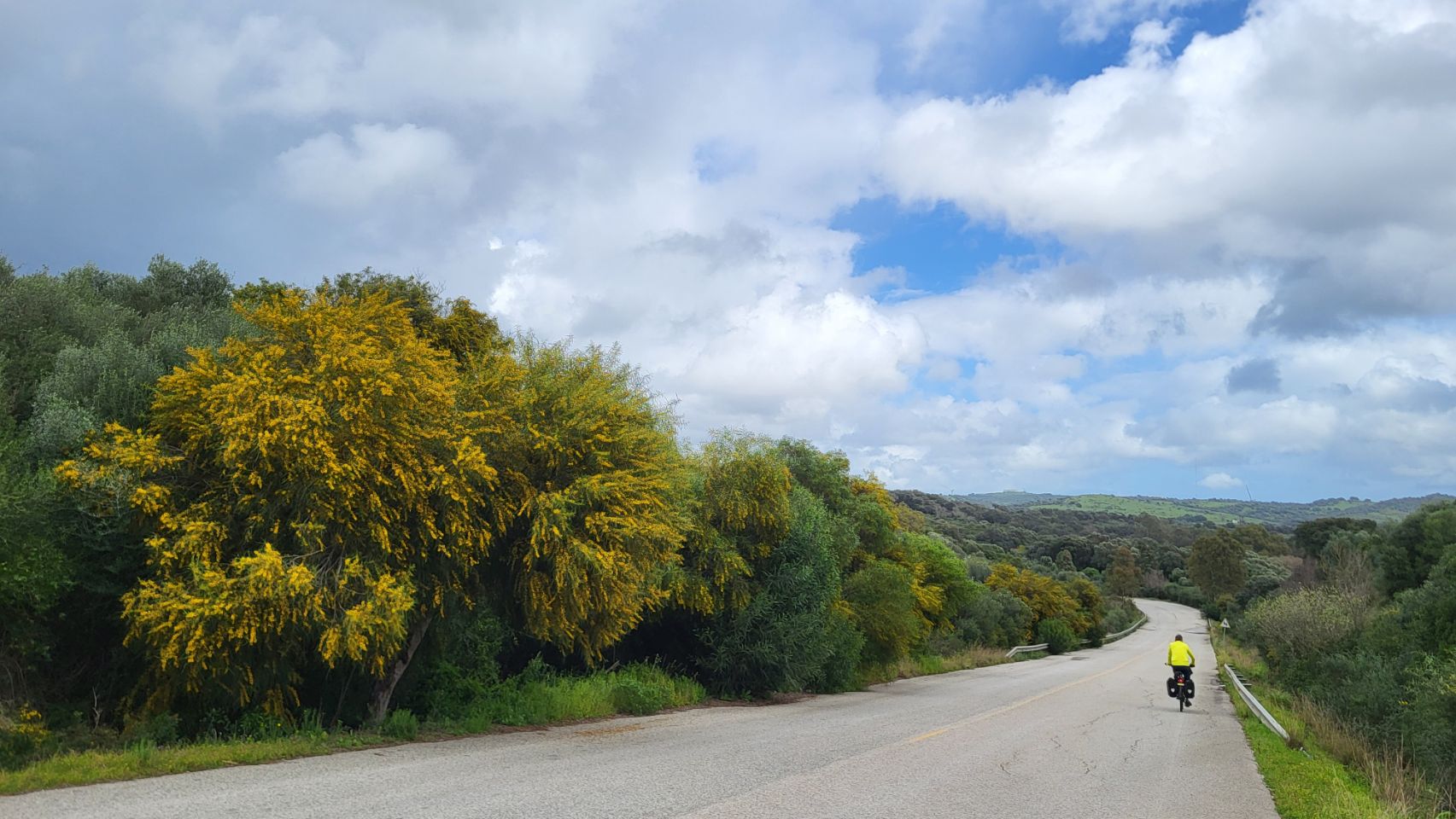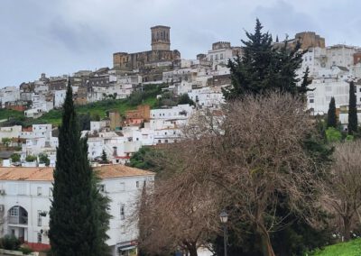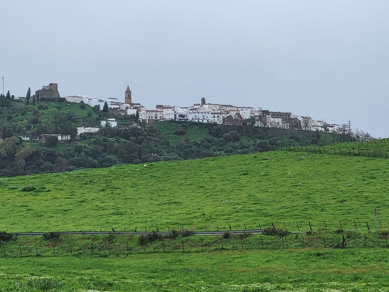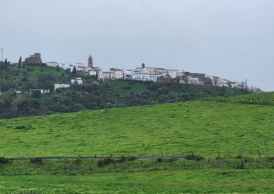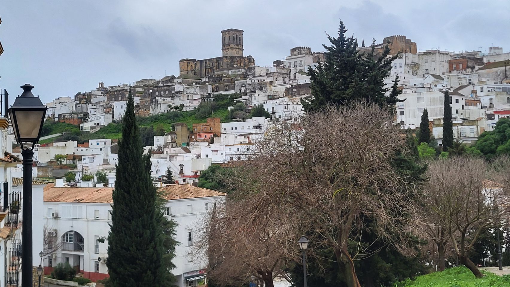 Onze route gaat verder door landbouwgebied. De wind trekt steeds meer aan en vindt, behalve twee eenzame fietsers, weinig obstakels op zijn weg door dit saaie landschap. Tijd voor een luisterboek. Als het landschap later opbubbelt naar heuvels, ziet diezelfde saaie landbouwgrond er toch opeens spannender uit. En er komt nu gelukkig ook meer natuur langs. Ondertussen zwoegen we tegen windkracht 5 en regelmatig een helling. De kilometerteller komt niet meer boven de 13 p.u. uit. Aan het eind van de middag naderen we eindelijk het stadje Arcos de la Frontera waar we een dag zullen onderduiken vanwege de voorspelde stortbuien.