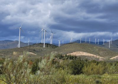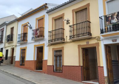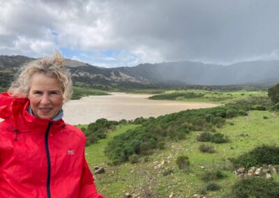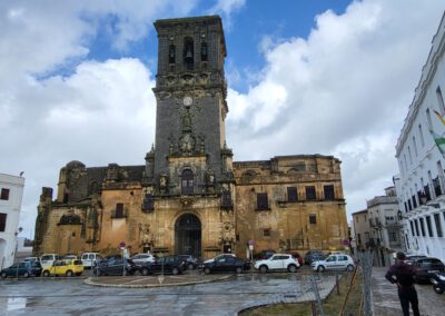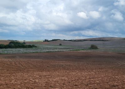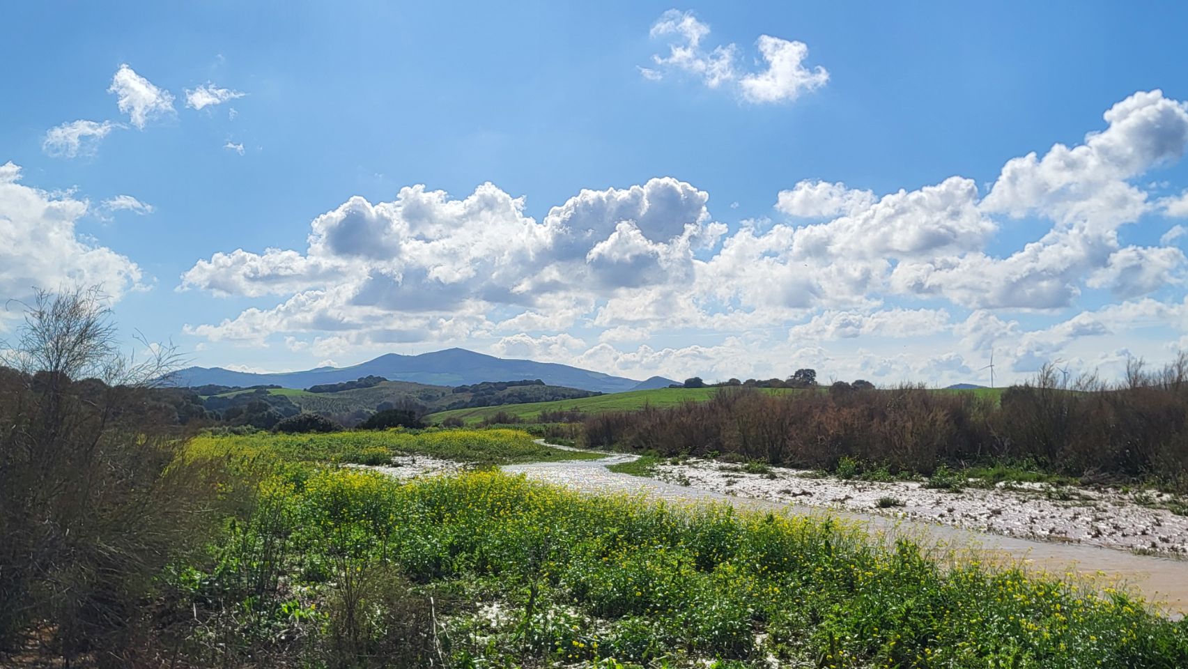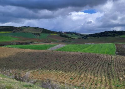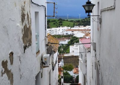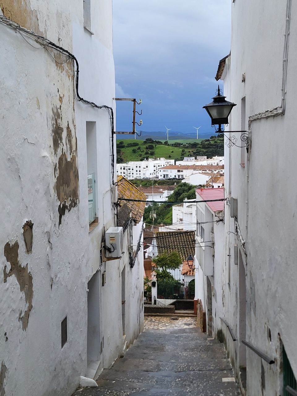Onze route gaat verder door landbouwgebied. De wind trekt steeds meer aan en vindt, behalve twee eenzame fietsers, weinig obstakels op zijn weg door dit saaie landschap. Tijd voor een luisterboek. Als het landschap later opbubbelt naar heuvels, ziet diezelfde saaie landbouwgrond er toch opeens spannender uit. En er komt nu gelukkig ook meer natuur langs. Ondertussen zwoegen we tegen windkracht 5 en regelmatig een helling. De kilometerteller komt niet meer boven de 13 p.u. uit. Aan het eind van de middag naderen we eindelijk het stadje Arcos de la Frontera waar we een dag zullen onderduiken vanwege de voorspelde stortbuien.
