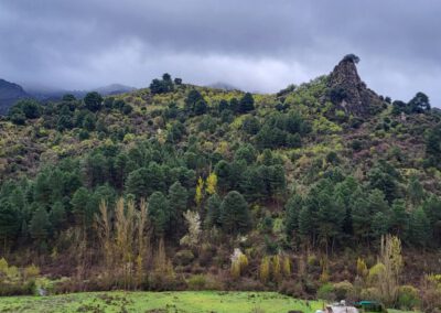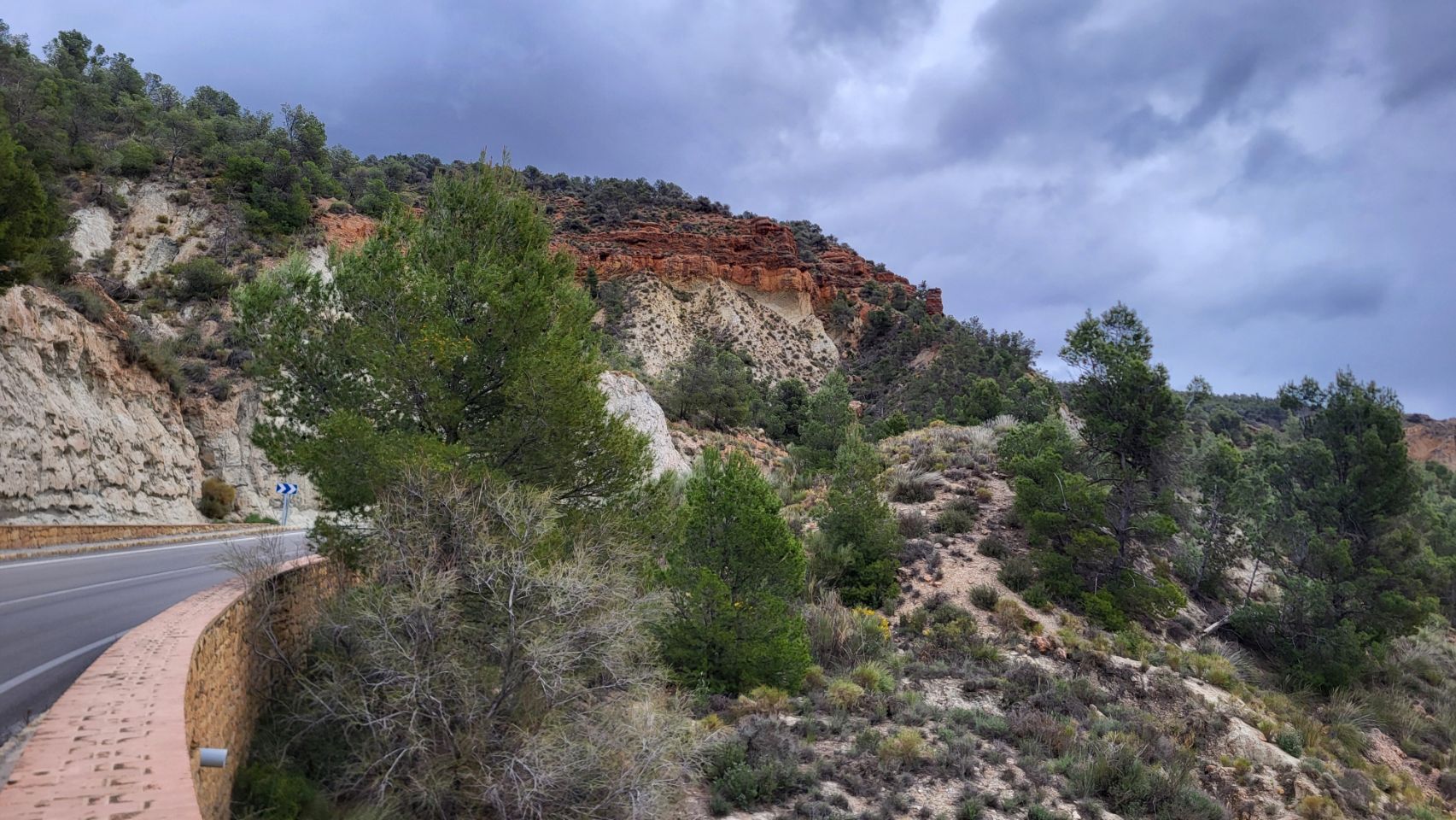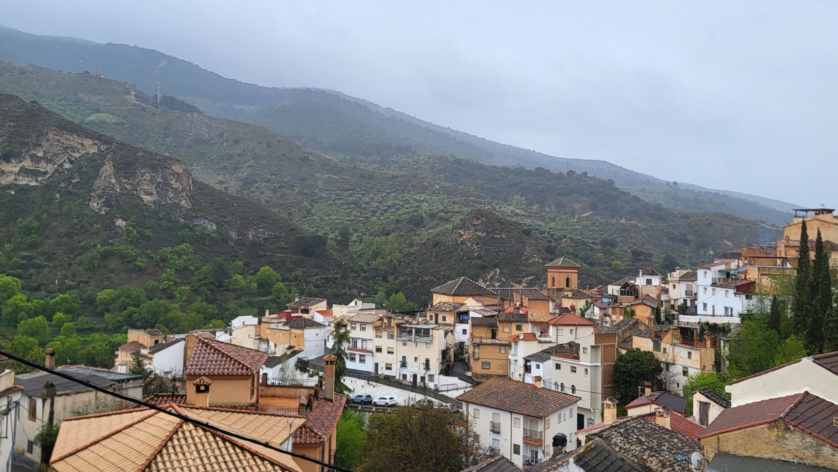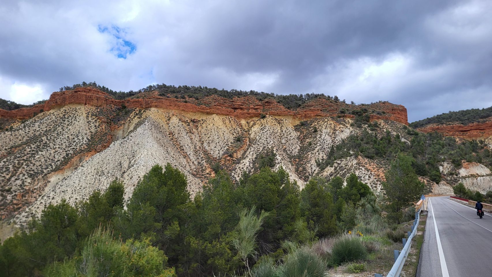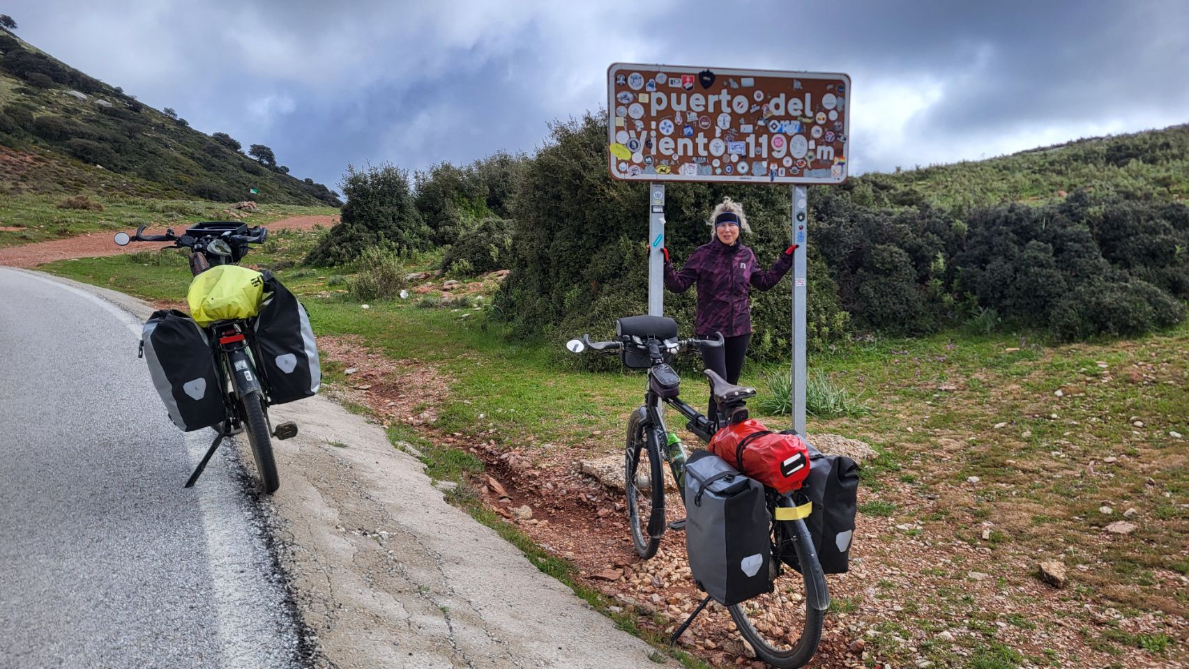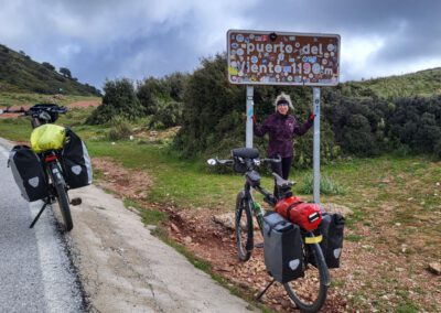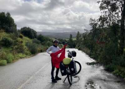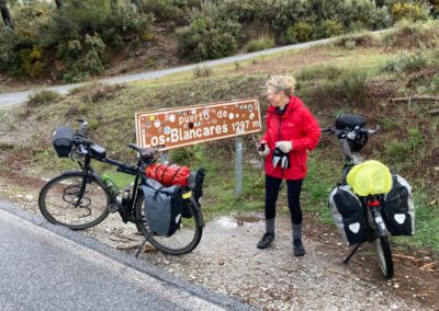 Het is 6 graden buiten en het regent. We treuzelen bij het ontbijt tot het droog is, of lijkt. We hebben een prachtige route in het vooruitzicht langs de Sierra Nevada. Helaas hullen de bergen zich in de wolken. We maken 895 hoogtemeters vandaag en het hoogste punt is bijna 1300 meter. Terwijl we klimmen warmen we lekker op, maar hoe hoger hoe kouder en natter het wordt. Toch is de omgeving te mooi om ons hier druk om te maken en we kijken vol verwondering om ons heen.