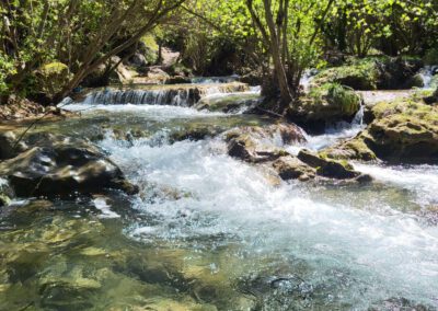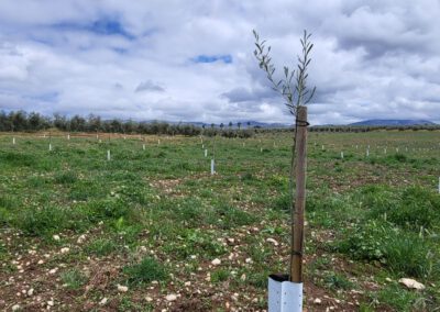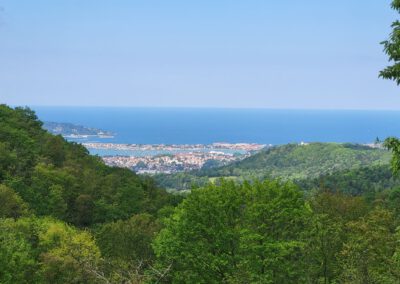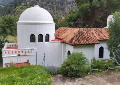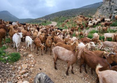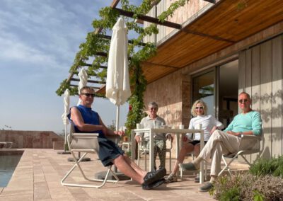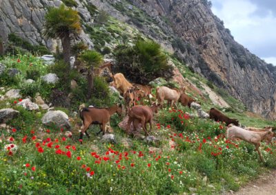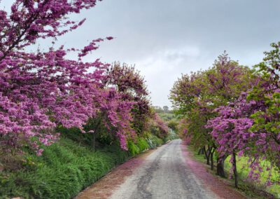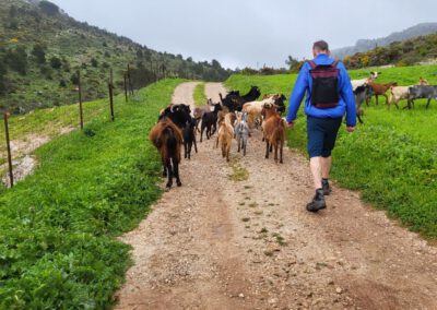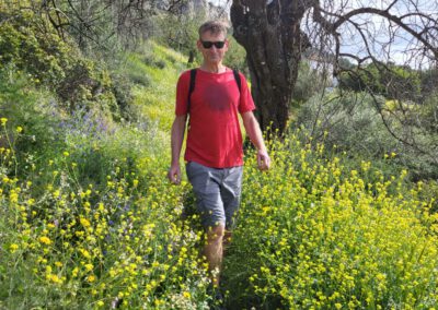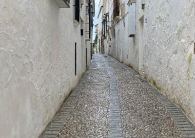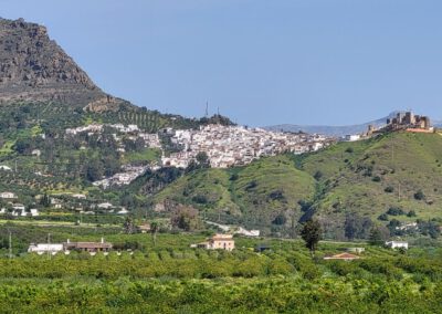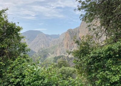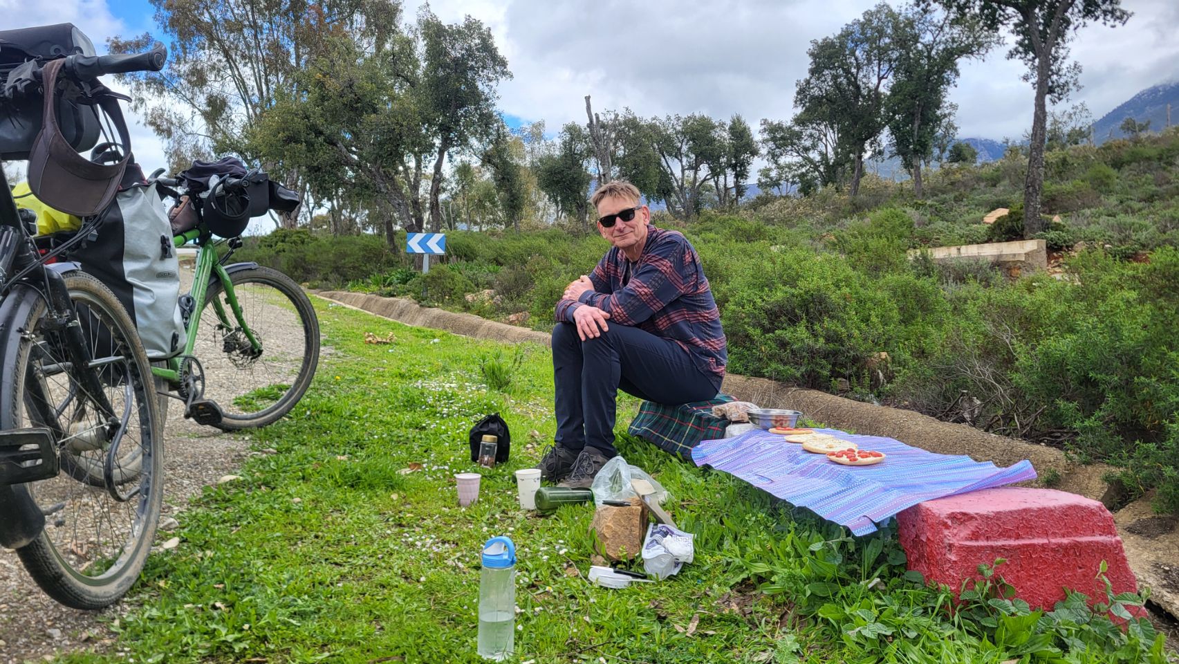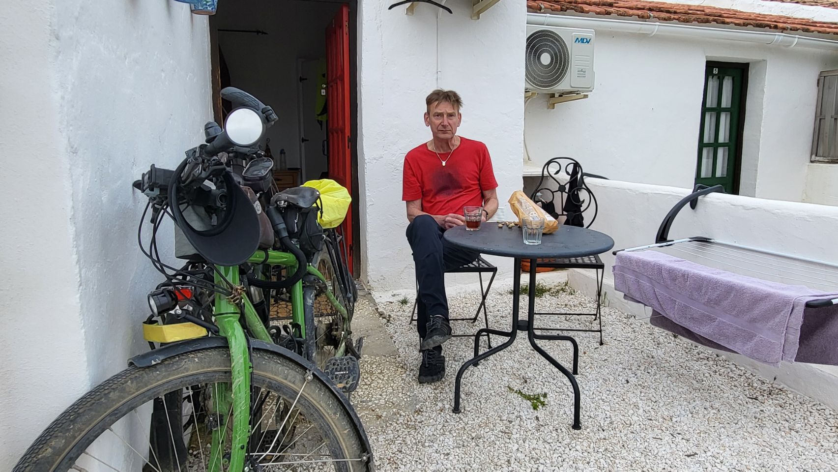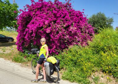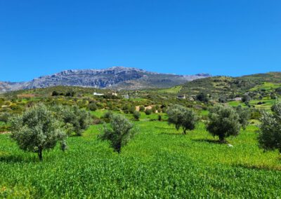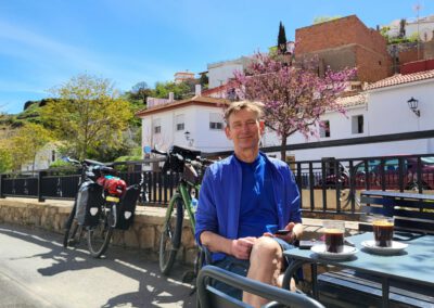 Het is lekker fietsweer. De route gaat voornamelijk door een bergachtig gebied met vele olijfgaarden. We zien olijfbomen in alle leeftijden. Net aangeplante sprietjes tot honderden jaren oude knoesten. Wel bijzonder als je olijven oogst van oude bomen waar je verre voorouders ze al van plukten. We passeren diverse dorpjes met witte huizen, met de voor deze regio karakteristieke kleine balkonnetjes met zwartmetalen hekwerk. Je kan er slechts op staan, te klein voor een stoel. Ik zie voor mij hoe ze hier in de lockdowns van de pandemie aan het eind van de middag, in plaats van naar de pleintjes te kunnen gaan, allemaal op hun balkonnetjes hun drukke gesprekken voerden.