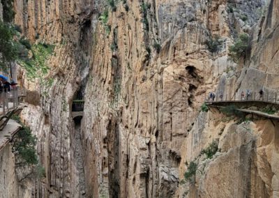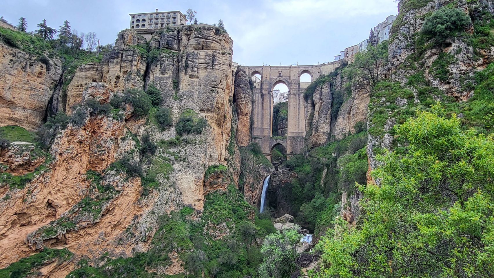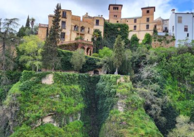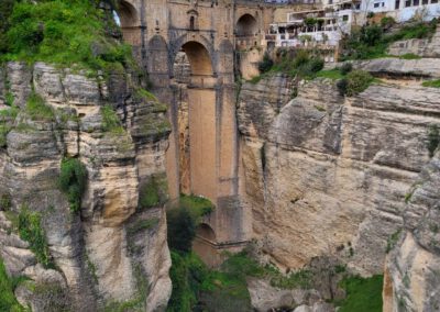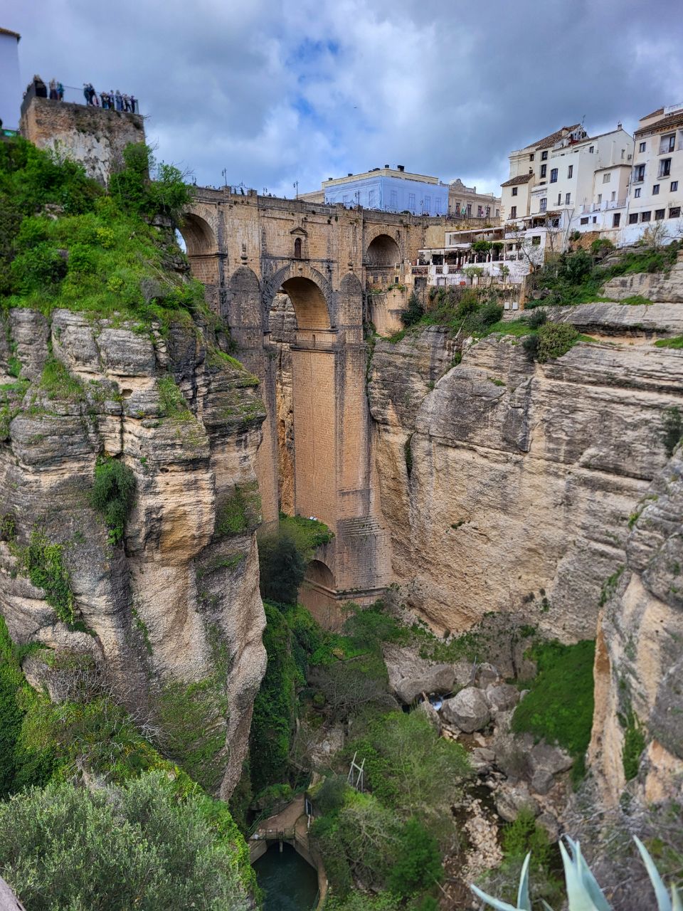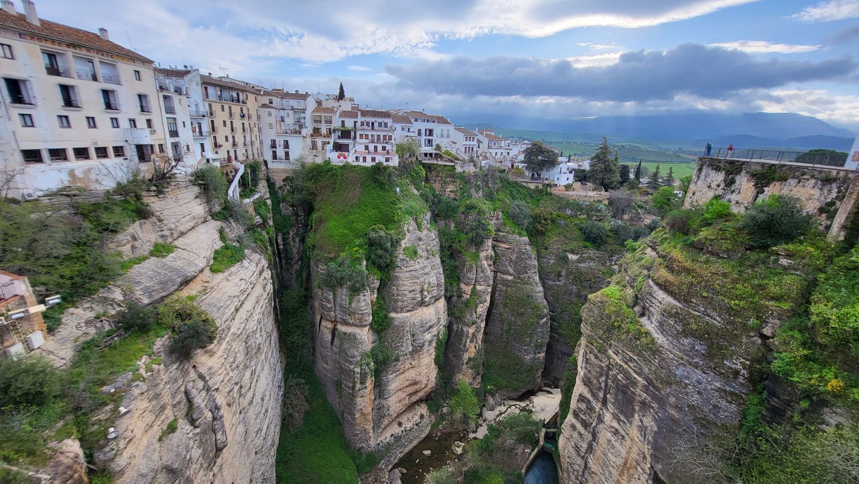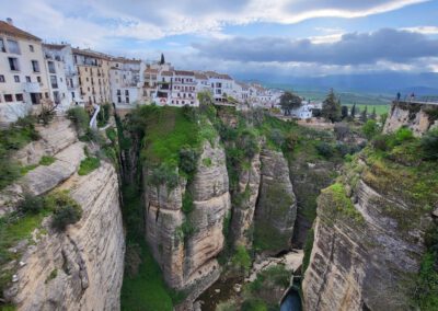 Ronda is al een heel oude nederzetting en werd de hoofdstad van Andalucië en een belangrijke handelsstad in de tijd van de Moren. In de 15e eeuw werden de Moren verdreven door de Christenen. Als we vanaf deze kant de kloof bekijken, zien we dat er aan de kloofwand een hangend looppad wordt gemaakt. Een soort Caminito de Rey, maar dan in Ronda. Het is hier al heel toeristisch en straks kan je dus ook niet meer de kloof in kijken zonder een optocht van toeristen te zien.
