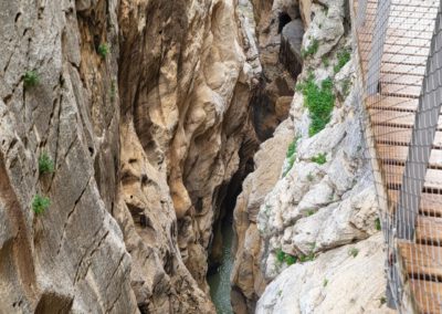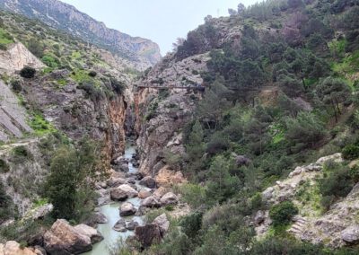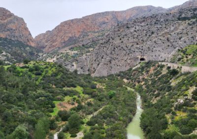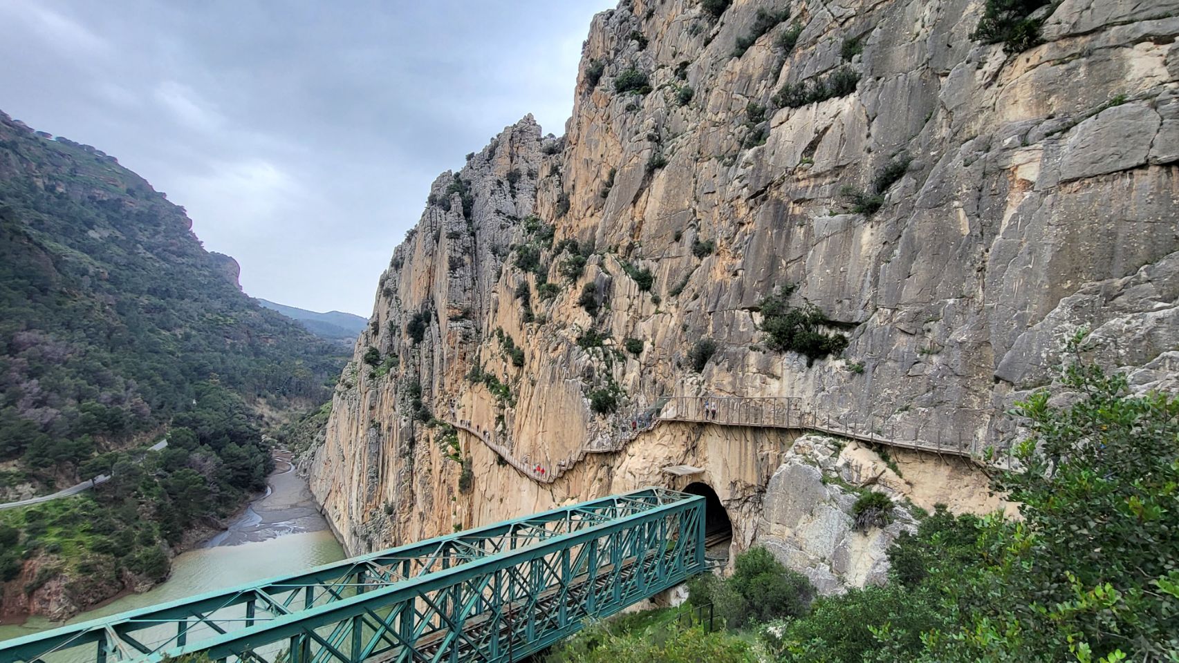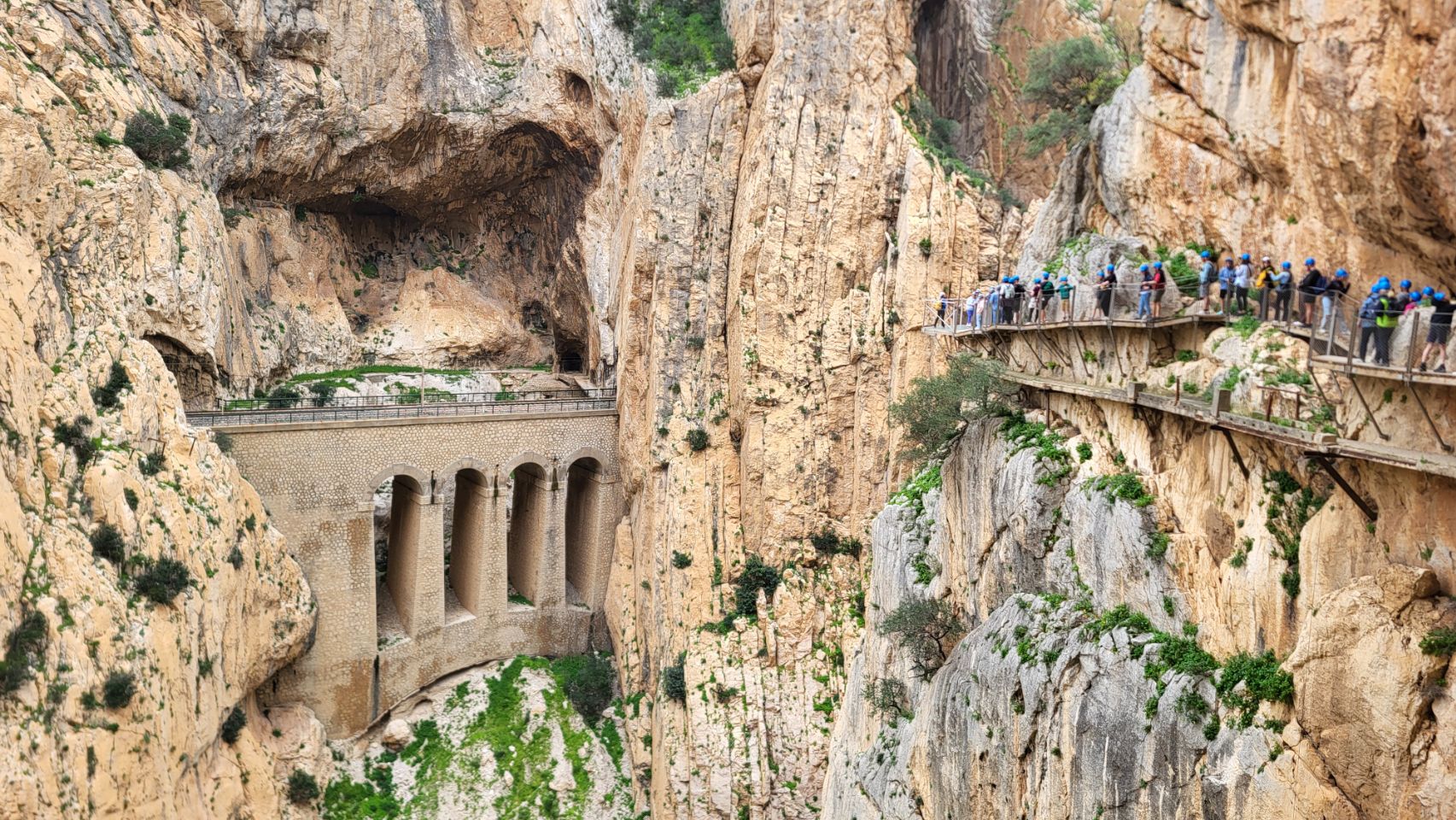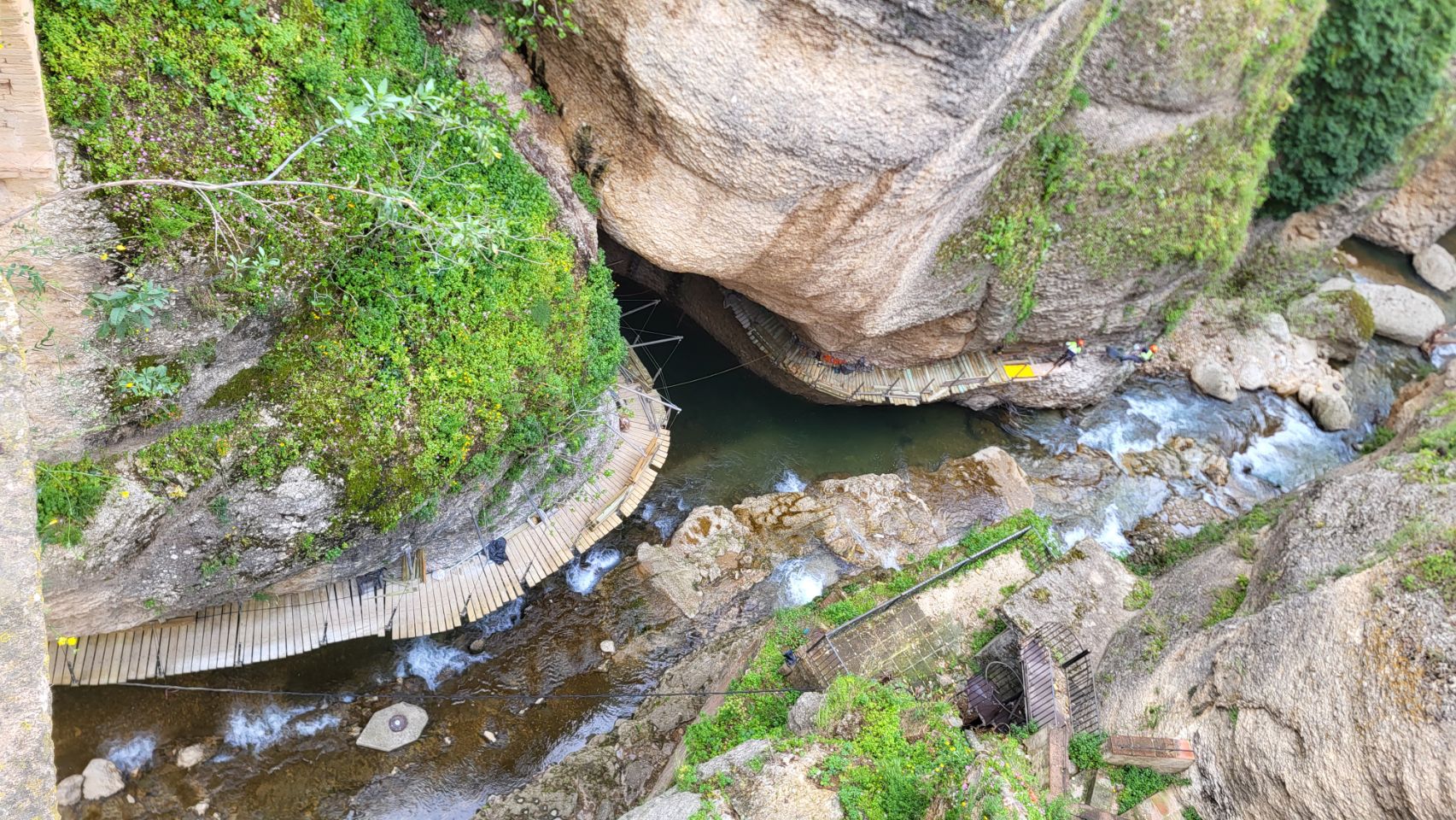 Ronda is al een heel oude nederzetting en werd de hoofdstad van Andalucië en een belangrijke handelsstad in de tijd van de Moren. In de 15e eeuw werden de Moren verdreven door de Christenen. Als we vanaf deze kant de kloof bekijken, zien we dat er aan de kloofwand een hangend looppad wordt gemaakt. Een soort Caminito de Rey, maar dan in Ronda. Het is hier al heel toeristisch en straks kan je dus ook niet meer de kloof in kijken zonder een optocht van toeristen te zien.
