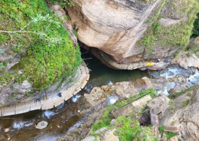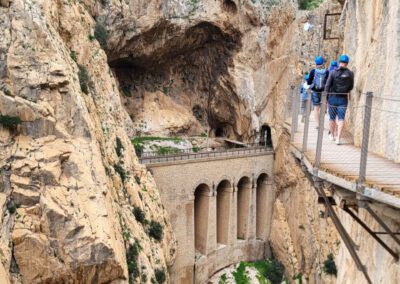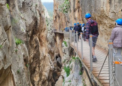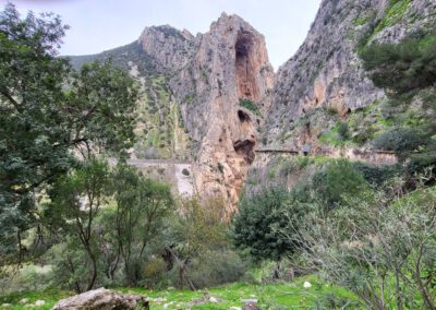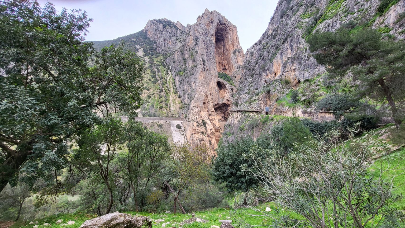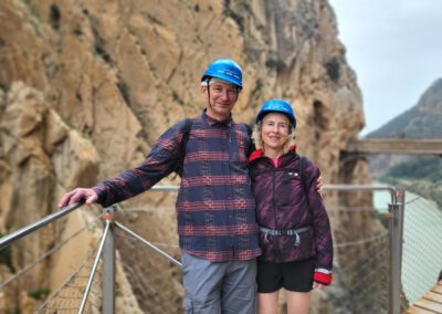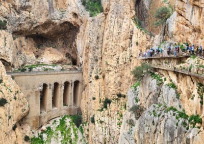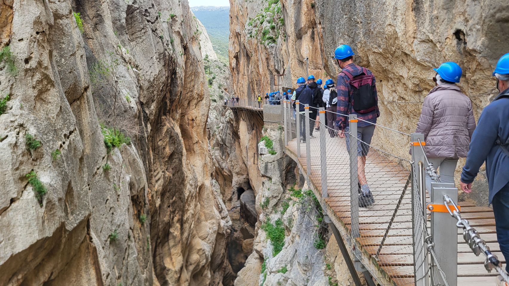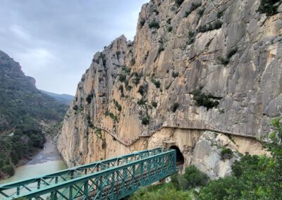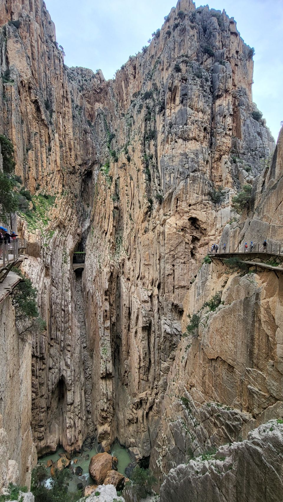 Ronda is al een heel oude nederzetting en werd de hoofdstad van Andalucië en een belangrijke handelsstad in de tijd van de Moren. In de 15e eeuw werden de Moren verdreven door de Christenen. Als we vanaf deze kant de kloof bekijken, zien we dat er aan de kloofwand een hangend looppad wordt gemaakt. Een soort Caminito de Rey, maar dan in Ronda. Het is hier al heel toeristisch en straks kan je dus ook niet meer de kloof in kijken zonder een optocht van toeristen te zien.