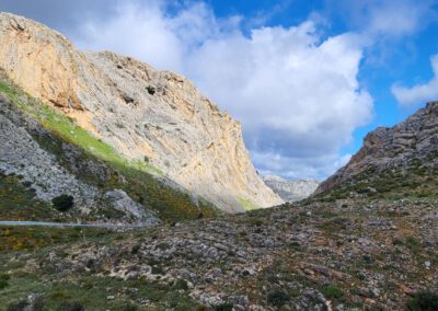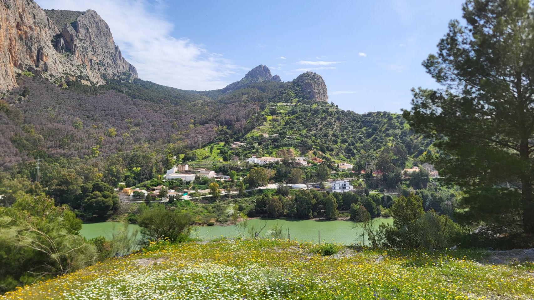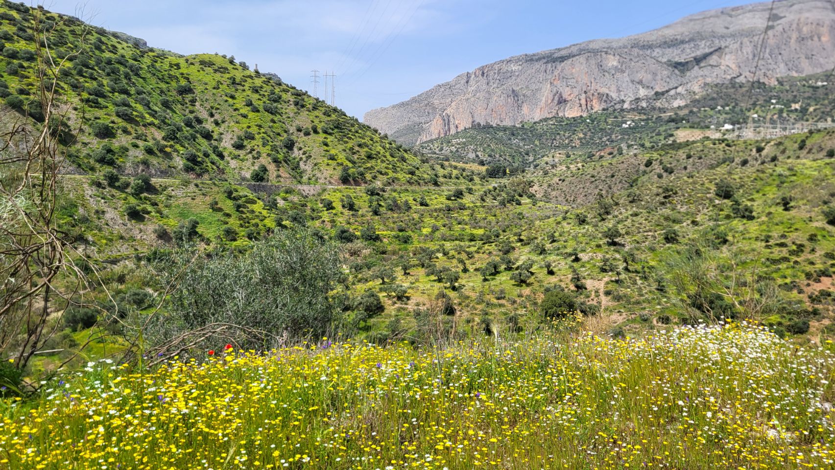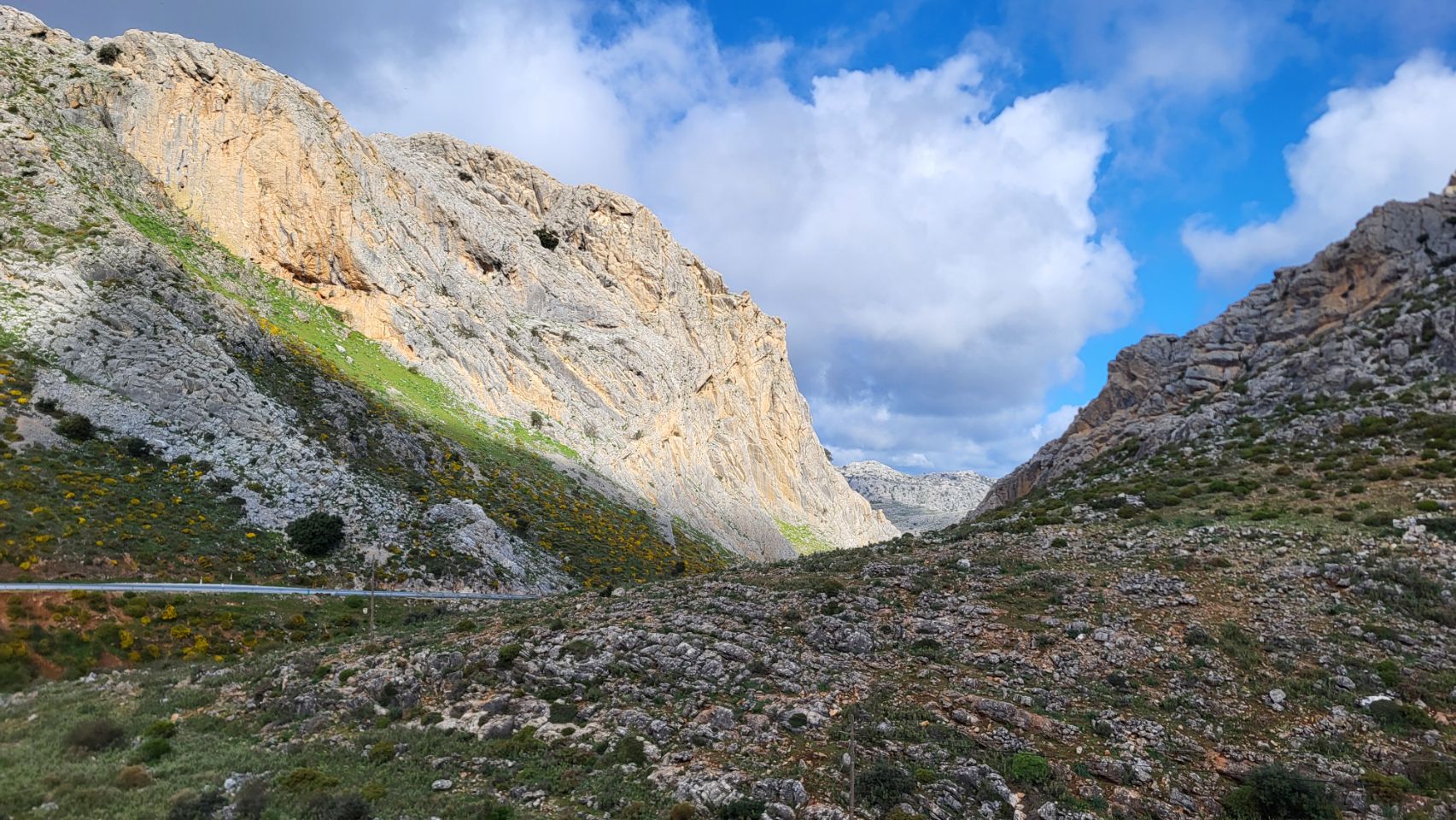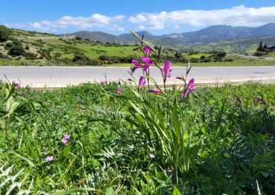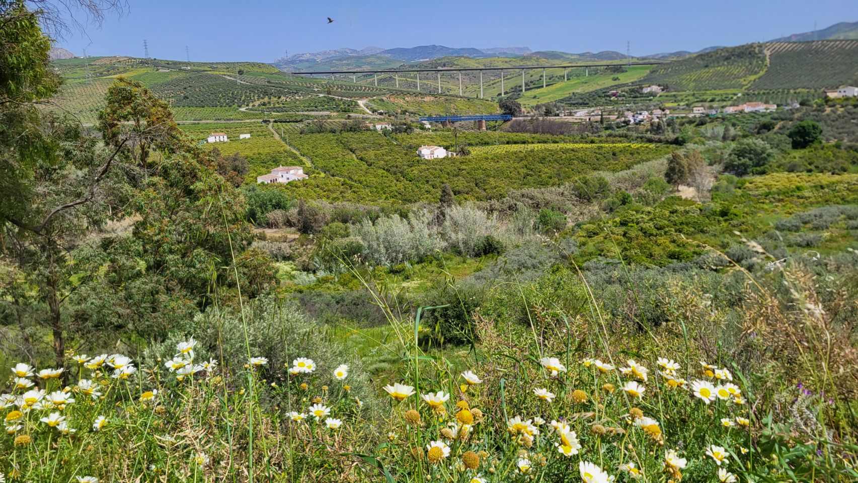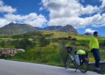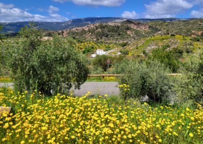 En dan komen we er achter dat we bij Ronda de verkeerde weg ingeslagen zijn. Deze loopt ook oostwaarts maar dan een stuk meer naar het zuiden. We berekenen een nieuwe route om toch bij Antequera uit te komen, want het hotel is al geboekt. Onze route van 75 km met 800 hoogtemeters wordt nu een heftige 100 km met 1200 hoogtemeters. Een dagrecord voor ons, dit hebben we op nog geen fietsreis gedaan. De zon schijnt nu volop en het landschap is indrukwekkend mooi. Het is nagenoeg onbewoond, groen, ruige bergen en veel bloemen. Onze nieuwe route loopt langs Sierra de las Nieves en gelukkig krijgen we dus heel veel moois voor de extra kilometers en klimwerk.