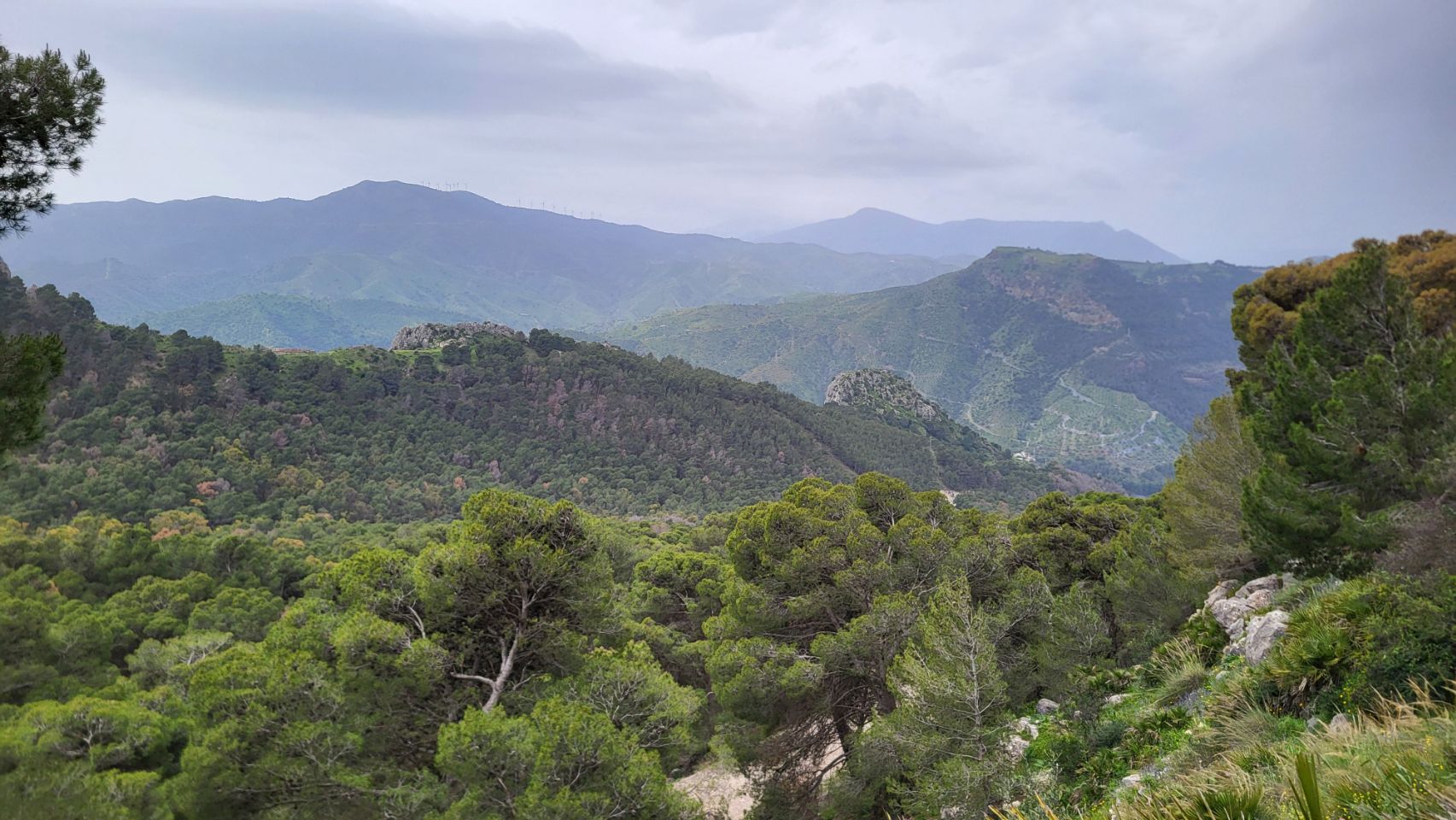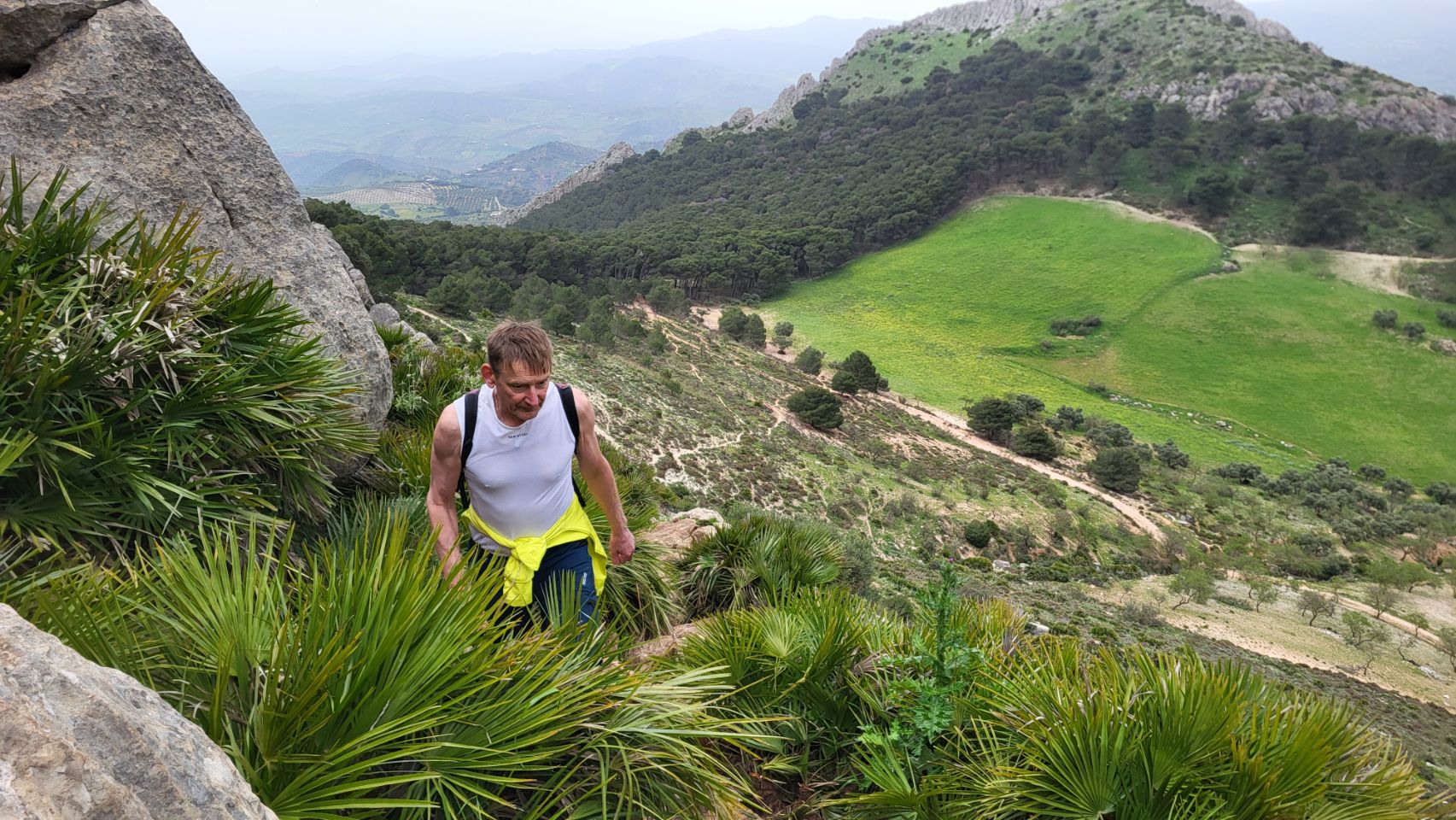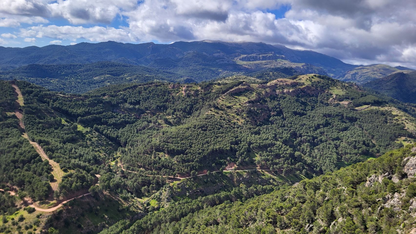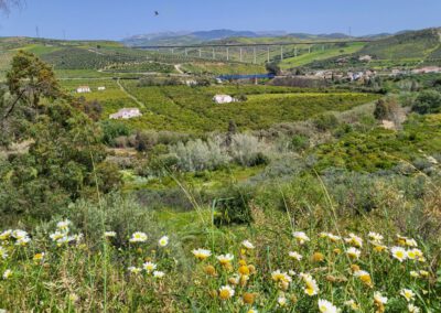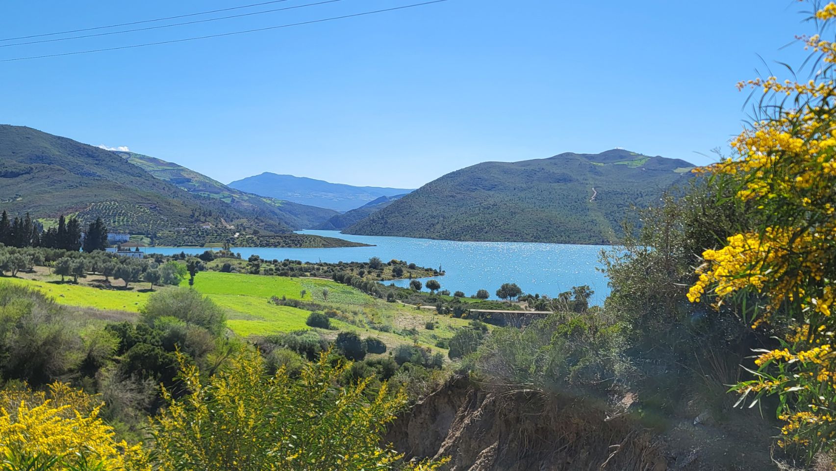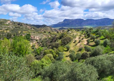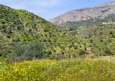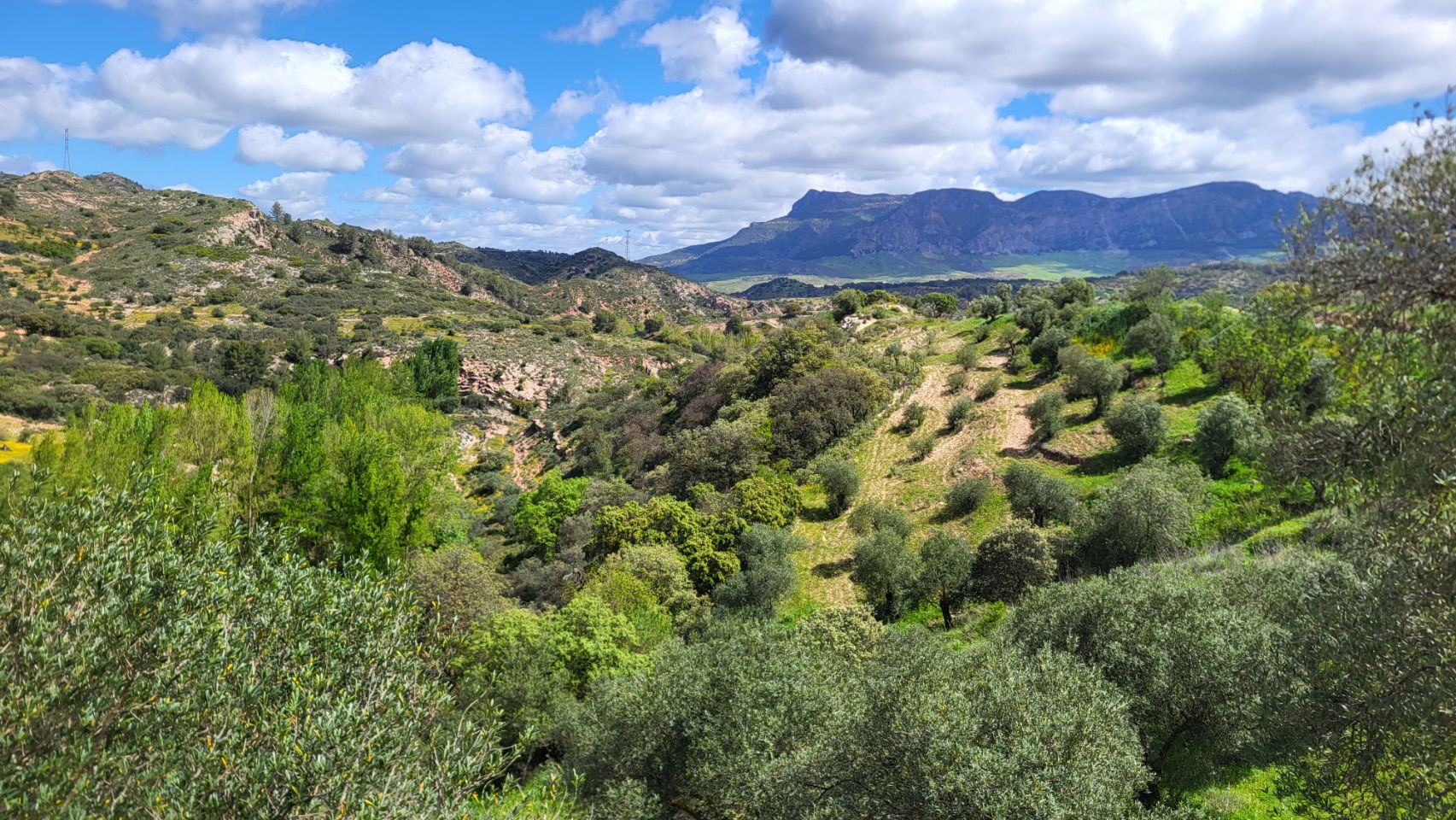 En dan komen we er achter dat we bij Ronda de verkeerde weg ingeslagen zijn. Deze loopt ook oostwaarts maar dan een stuk meer naar het zuiden. We berekenen een nieuwe route om toch bij Antequera uit te komen, want het hotel is al geboekt. Onze route van 75 km met 800 hoogtemeters wordt nu een heftige 100 km met 1200 hoogtemeters. Een dagrecord voor ons, dit hebben we op nog geen fietsreis gedaan. De zon schijnt nu volop en het landschap is indrukwekkend mooi. Het is nagenoeg onbewoond, groen, ruige bergen en veel bloemen. Onze nieuwe route loopt langs Sierra de las Nieves en gelukkig krijgen we dus heel veel moois voor de extra kilometers en klimwerk.