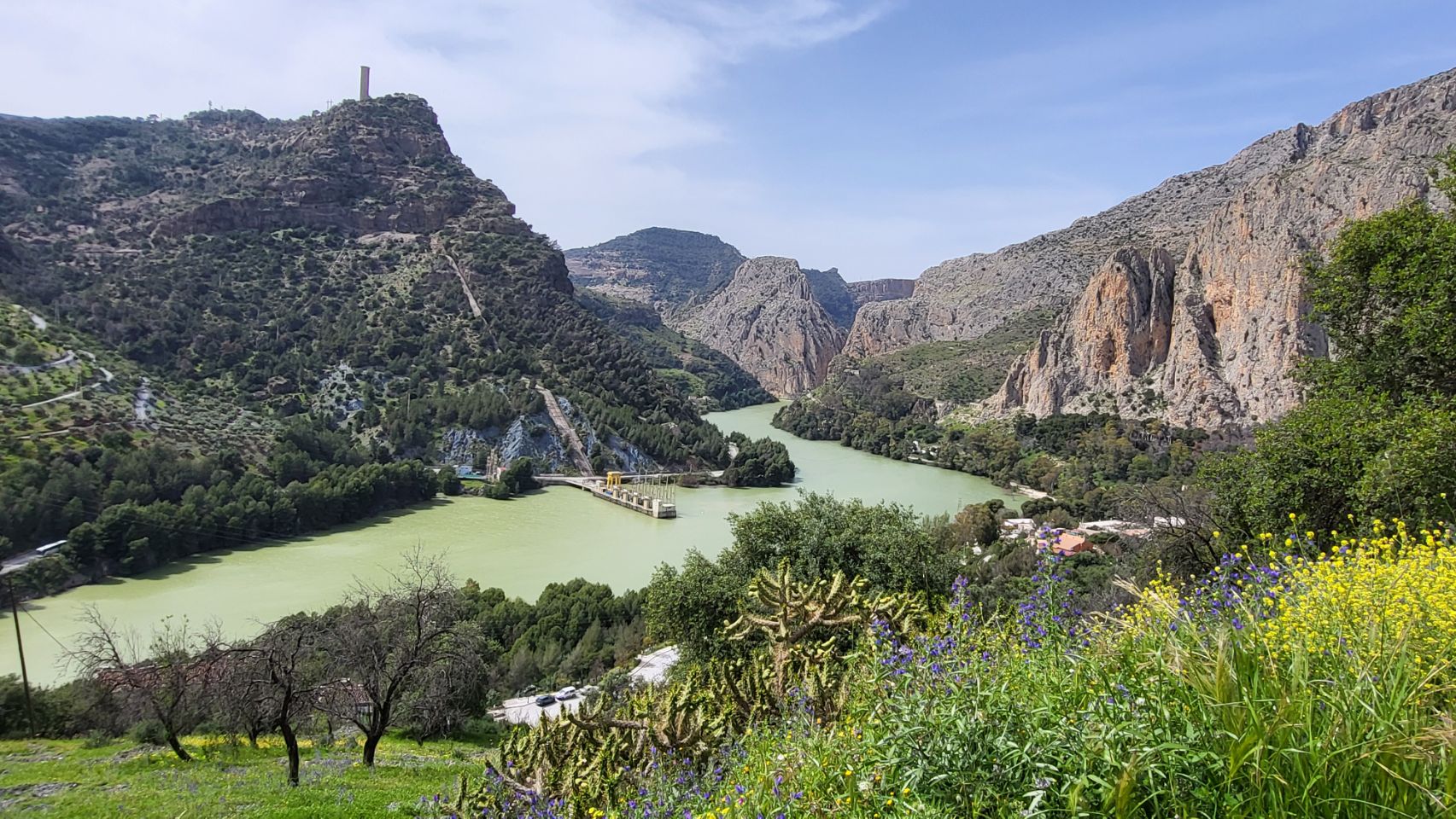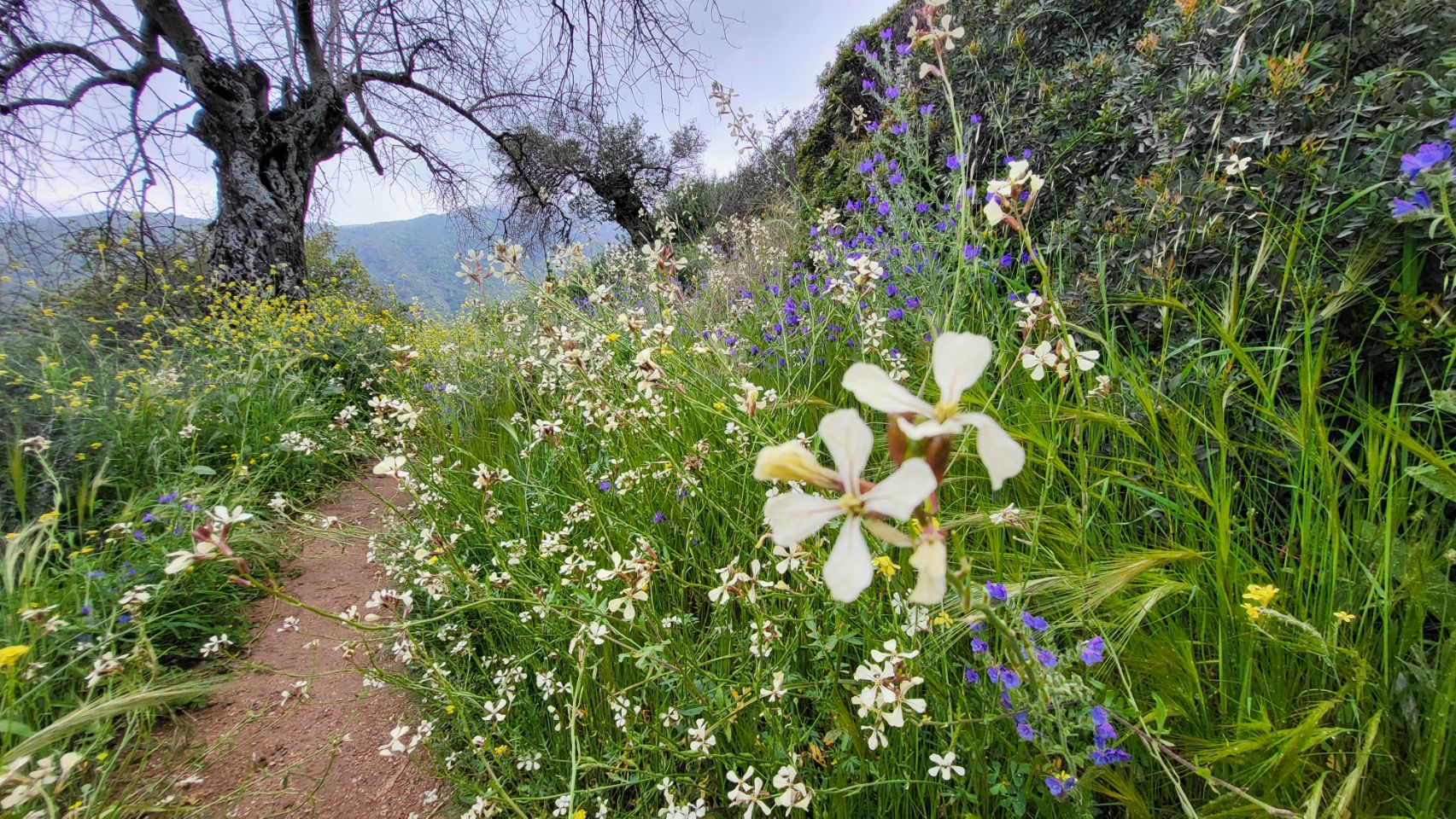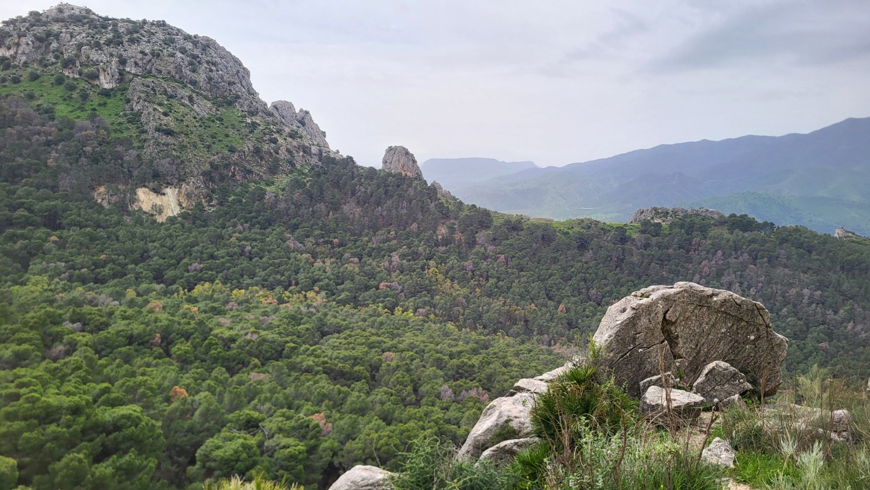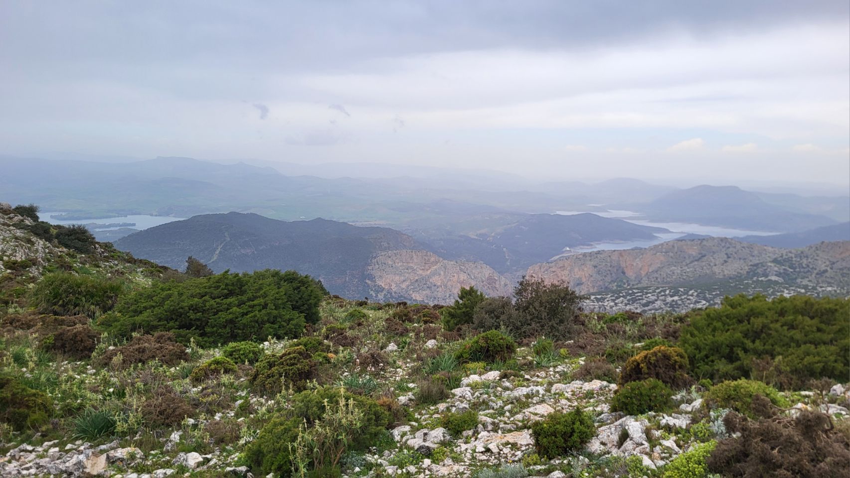 En dan komen we er achter dat we bij Ronda de verkeerde weg ingeslagen zijn. Deze loopt ook oostwaarts maar dan een stuk meer naar het zuiden. We berekenen een nieuwe route om toch bij Antequera uit te komen, want het hotel is al geboekt. Onze route van 75 km met 800 hoogtemeters wordt nu een heftige 100 km met 1200 hoogtemeters. Een dagrecord voor ons, dit hebben we op nog geen fietsreis gedaan. De zon schijnt nu volop en het landschap is indrukwekkend mooi. Het is nagenoeg onbewoond, groen, ruige bergen en veel bloemen. Onze nieuwe route loopt langs Sierra de las Nieves en gelukkig krijgen we dus heel veel moois voor de extra kilometers en klimwerk.