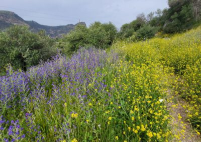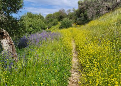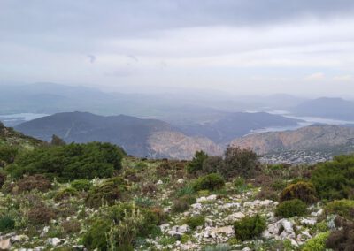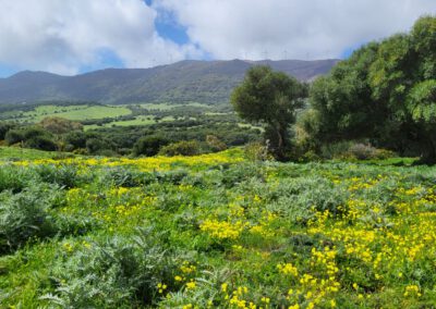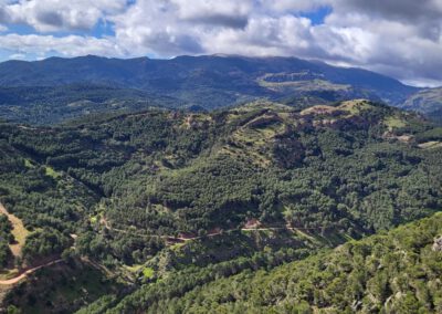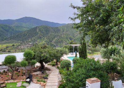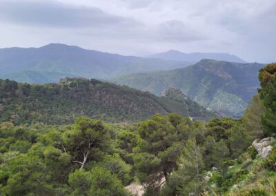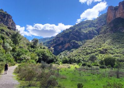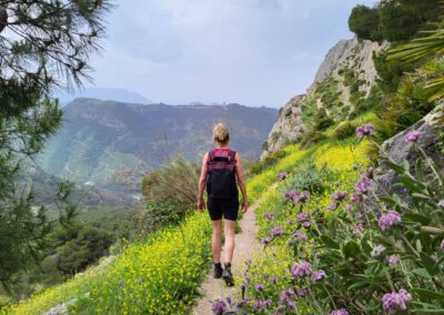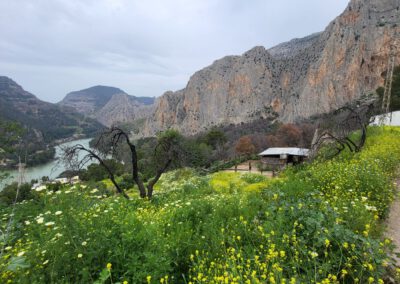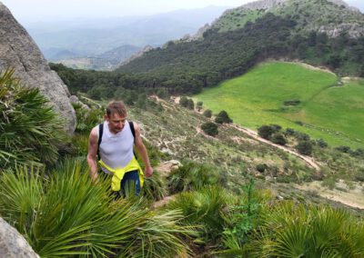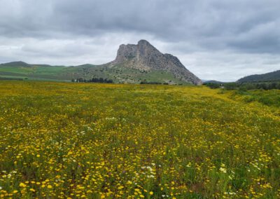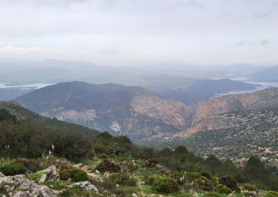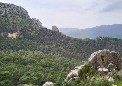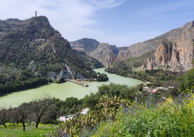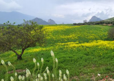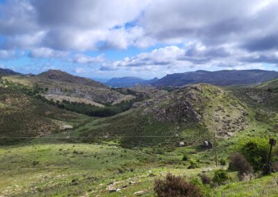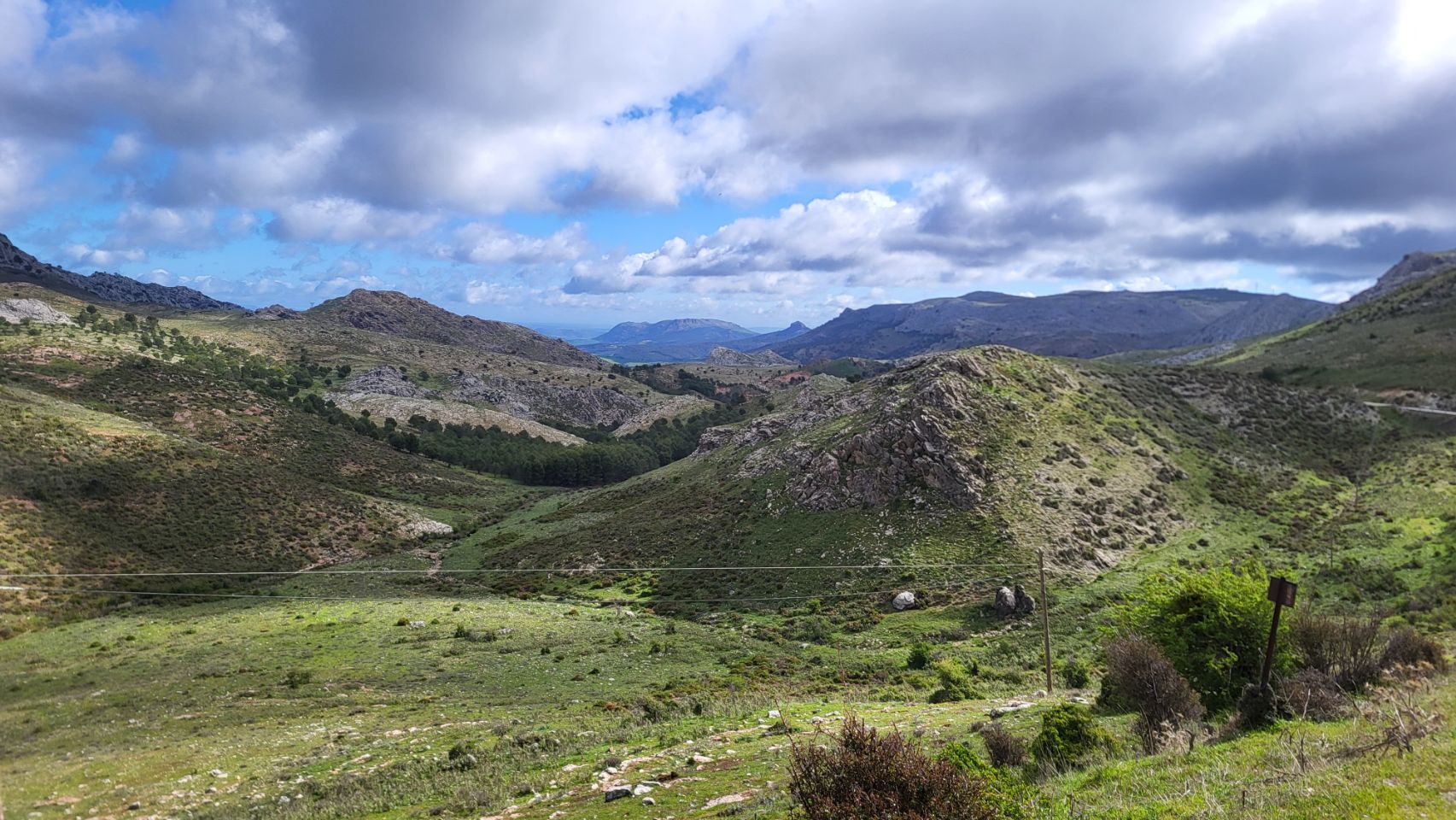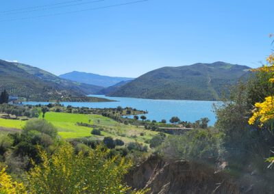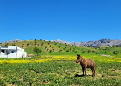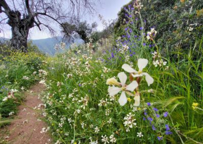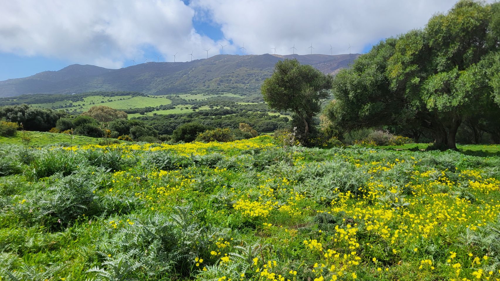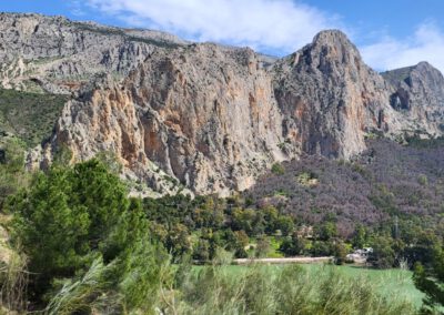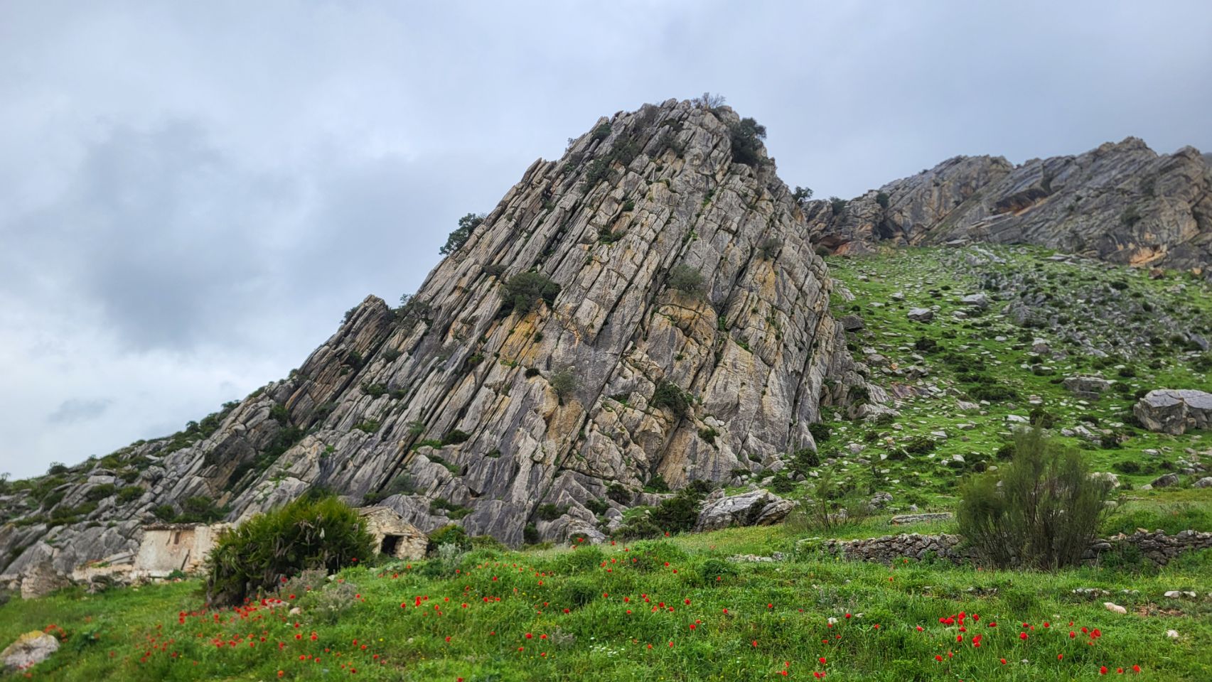 En dan komen we er achter dat we bij Ronda de verkeerde weg ingeslagen zijn. Deze loopt ook oostwaarts maar dan een stuk meer naar het zuiden. We berekenen een nieuwe route om toch bij Antequera uit te komen, want het hotel is al geboekt. Onze route van 75 km met 800 hoogtemeters wordt nu een heftige 100 km met 1200 hoogtemeters. Een dagrecord voor ons, dit hebben we op nog geen fietsreis gedaan. De zon schijnt nu volop en het landschap is indrukwekkend mooi. Het is nagenoeg onbewoond, groen, ruige bergen en veel bloemen. Onze nieuwe route loopt langs Sierra de las Nieves en gelukkig krijgen we dus heel veel moois voor de extra kilometers en klimwerk.