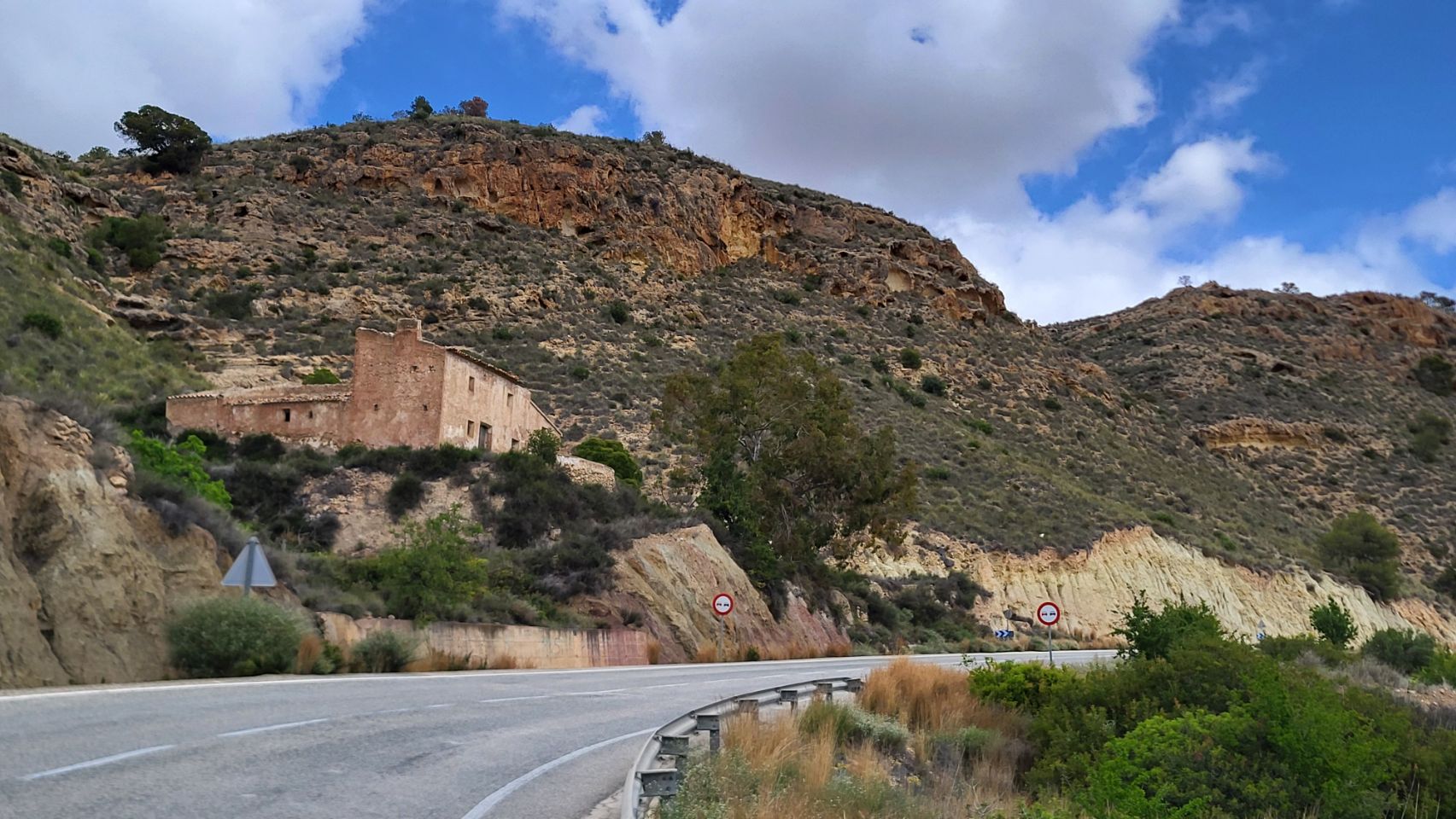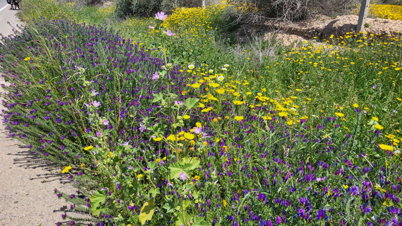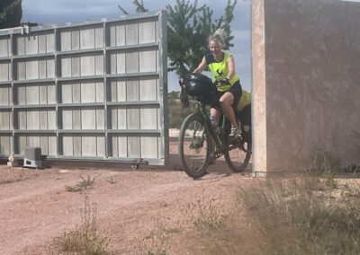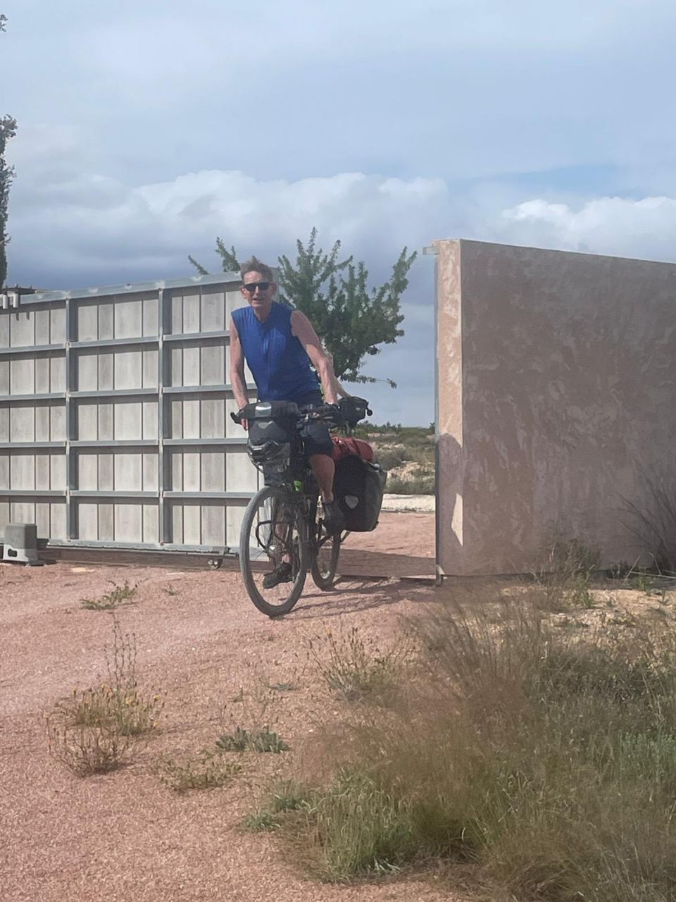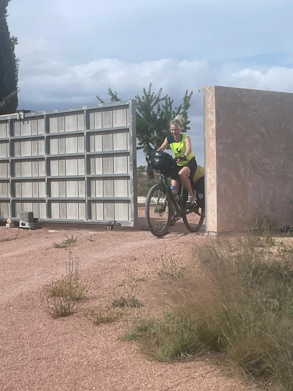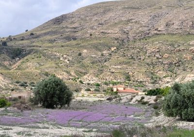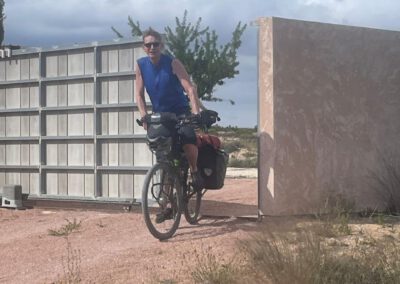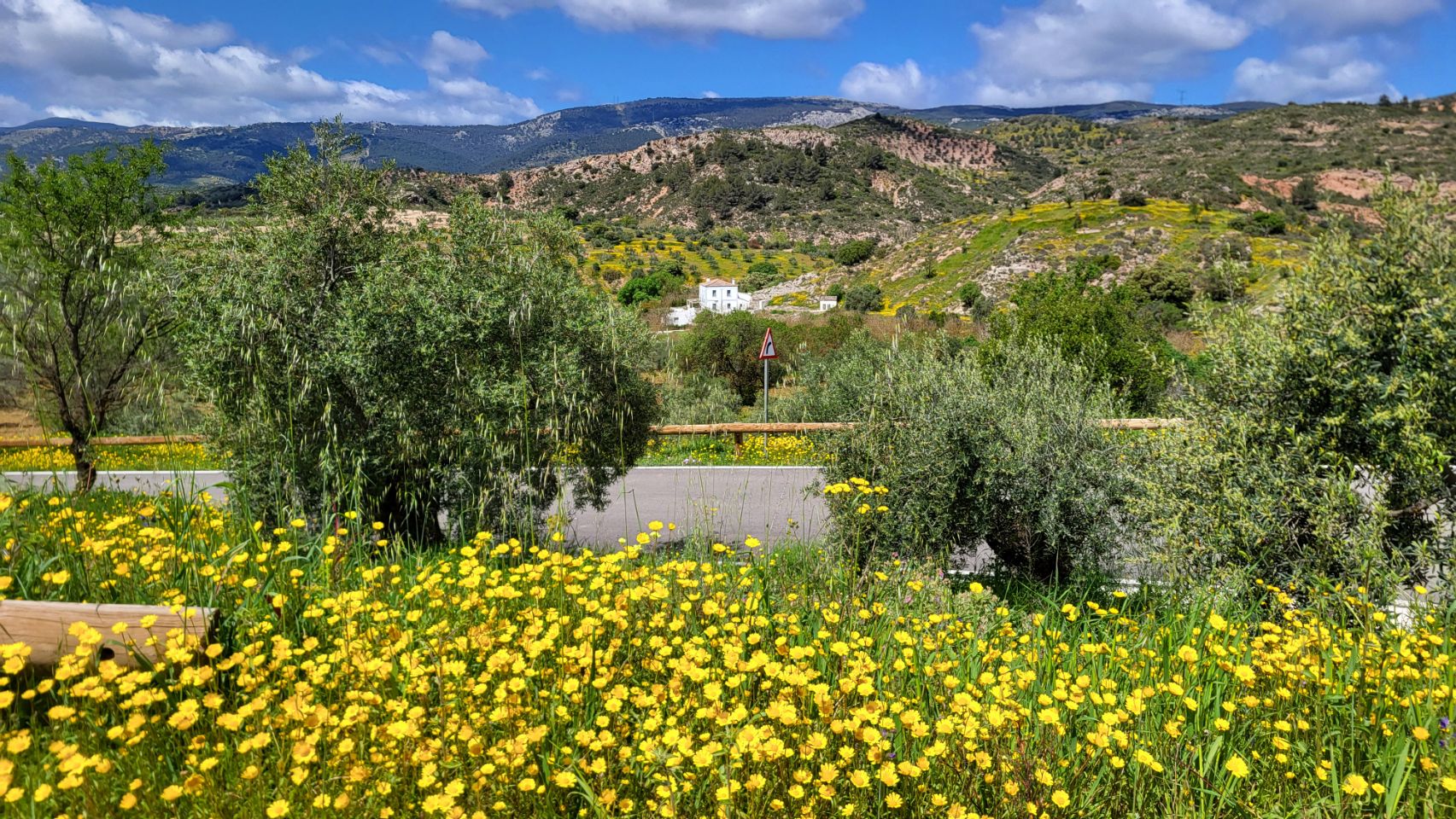 De uitzichten zijn prachtig. We zien bergen, windmolenparken, zonneparken, waarvan een van 7 vierkante kilometer, amandelbomen en veel bloemen. Als we door een bergdorpje komen dan moeten we door héél steile steegjes. Helaas krijgen we in de middag tegenwind en zijn de laatste kilometers zwaar. We komen pas 18:30 uur aan in het parterrehuisje dat we vannacht hebben. Er is een keuken waar we pasta met broccoli koken. En er is een wasmachine, dus een uur later hangt heel de woonkamer vol drogende was aan een lange lijn.