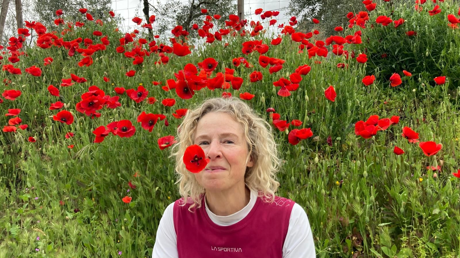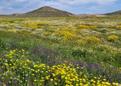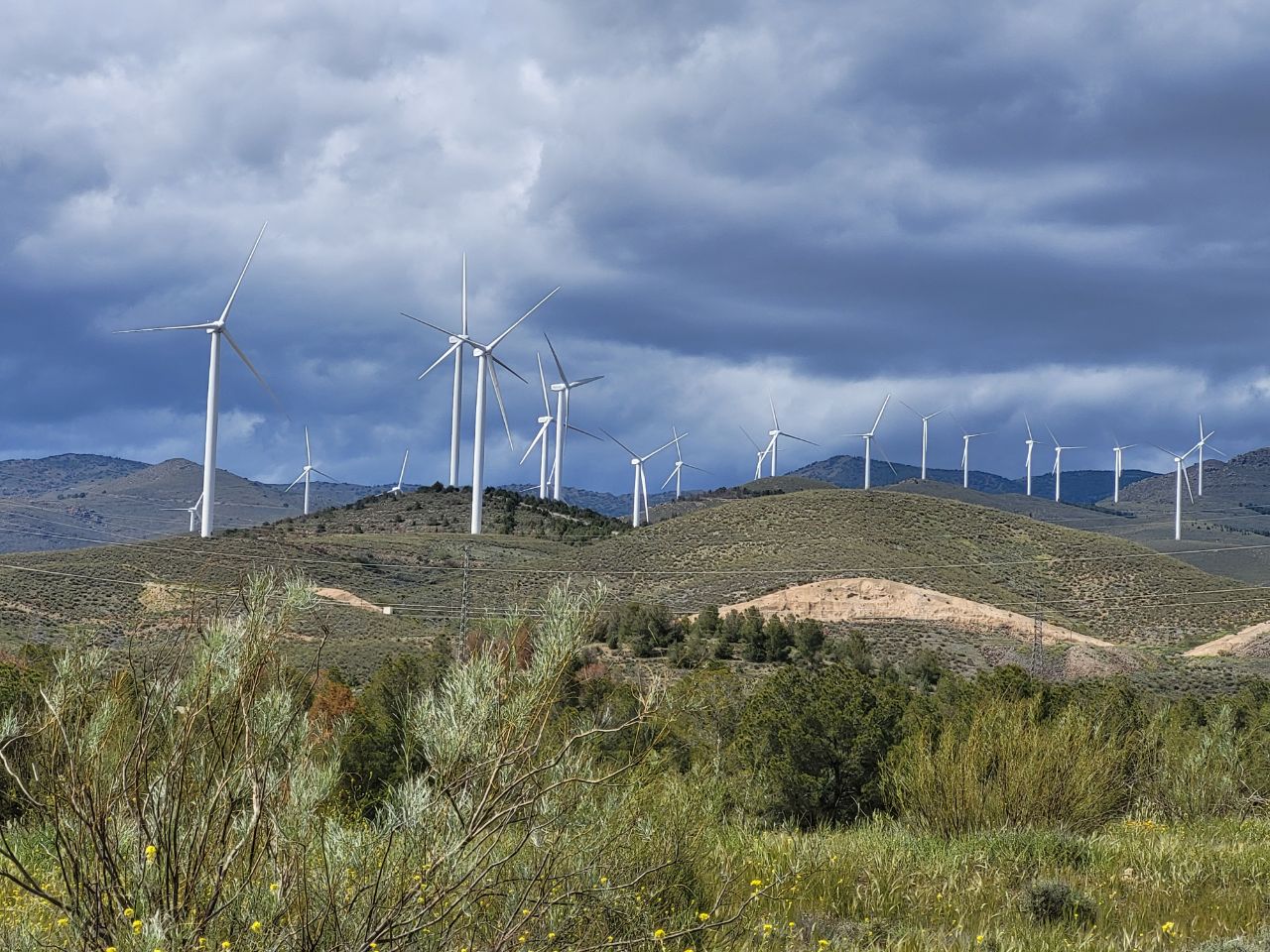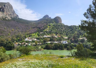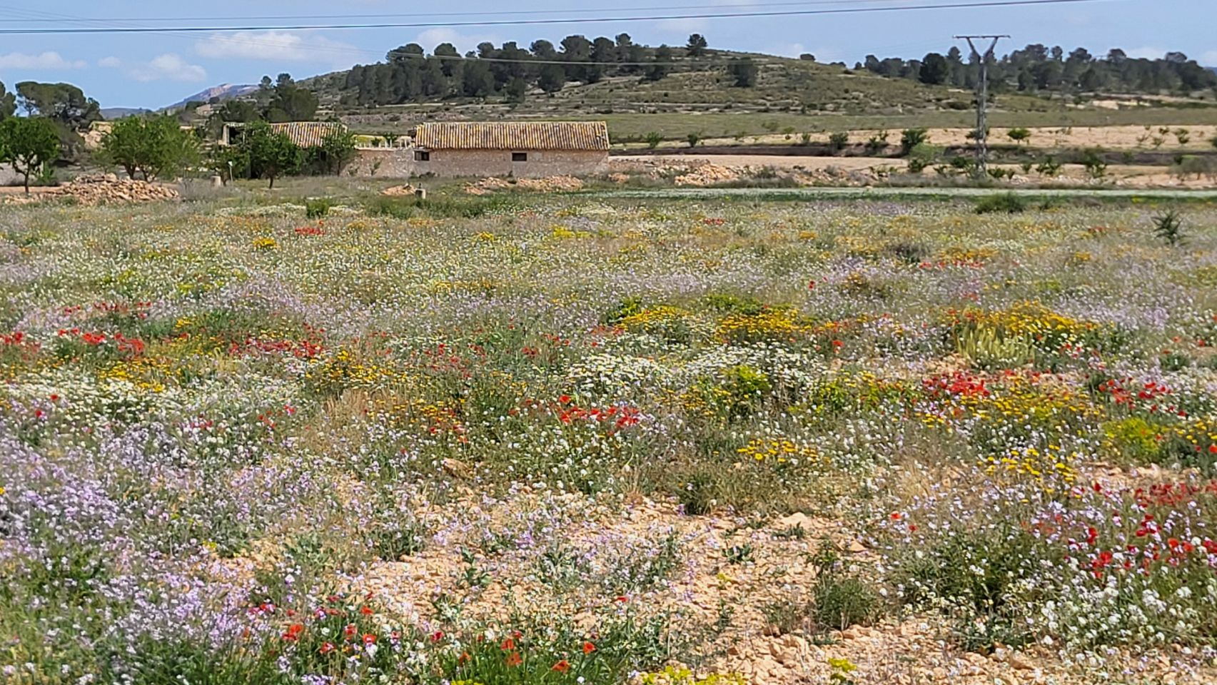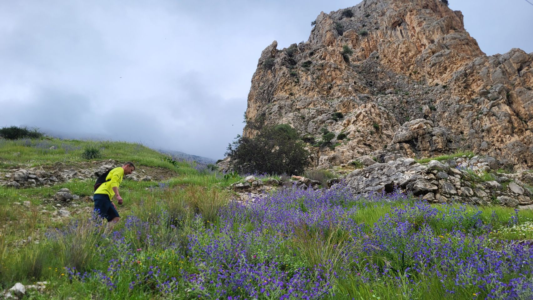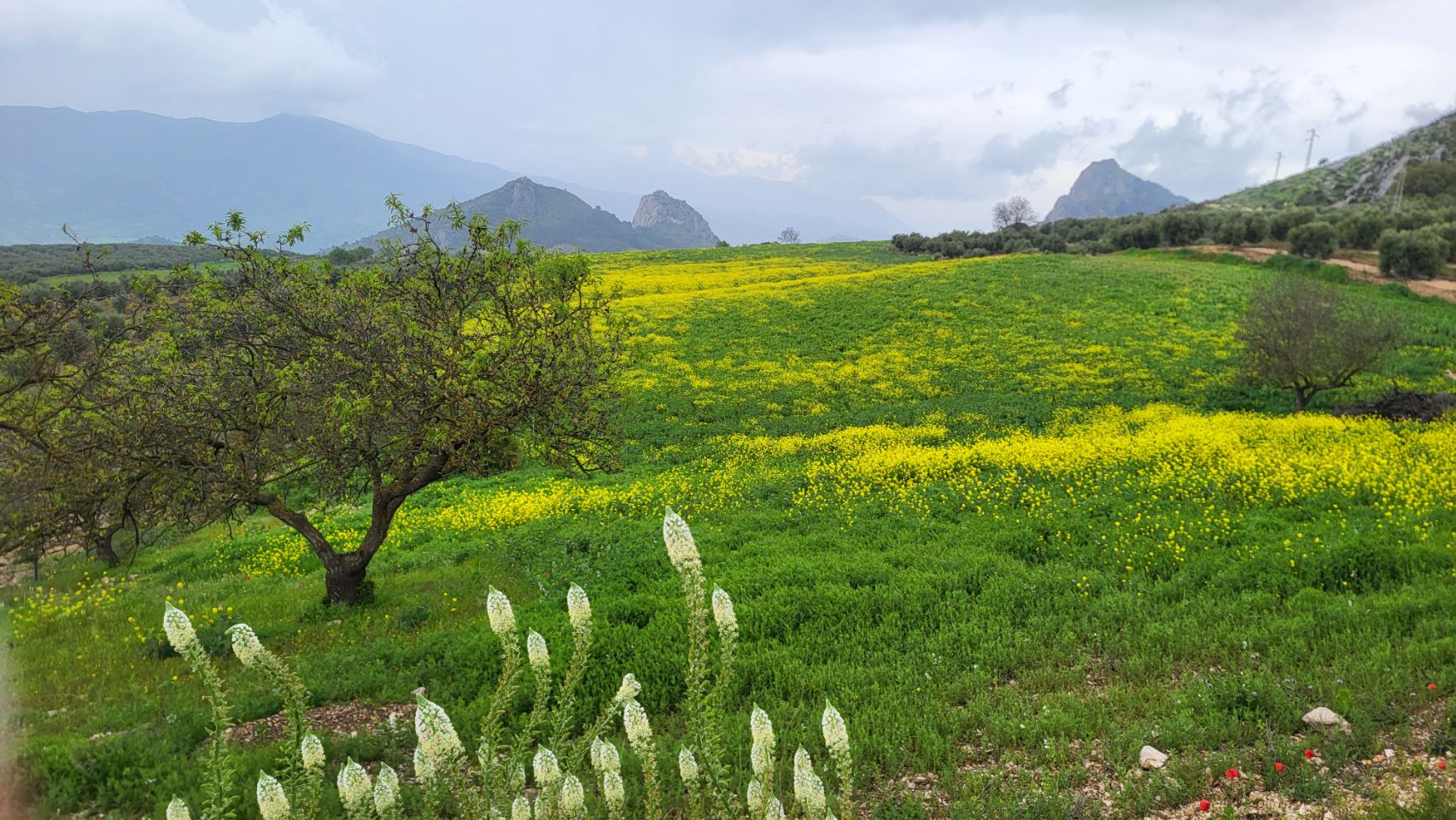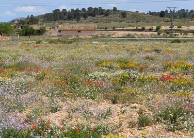 De uitzichten zijn prachtig. We zien bergen, windmolenparken, zonneparken, waarvan een van 7 vierkante kilometer, amandelbomen en veel bloemen. Als we door een bergdorpje komen dan moeten we door héél steile steegjes. Helaas krijgen we in de middag tegenwind en zijn de laatste kilometers zwaar. We komen pas 18:30 uur aan in het parterrehuisje dat we vannacht hebben. Er is een keuken waar we pasta met broccoli koken. En er is een wasmachine, dus een uur later hangt heel de woonkamer vol drogende was aan een lange lijn.