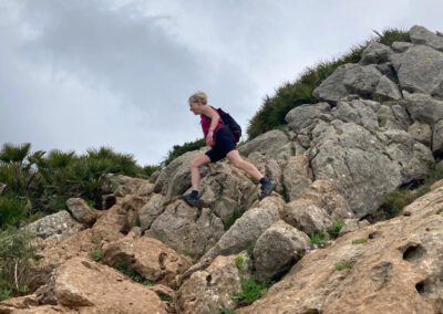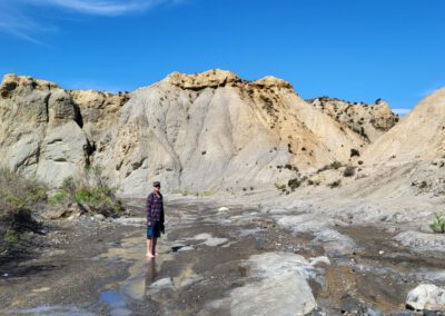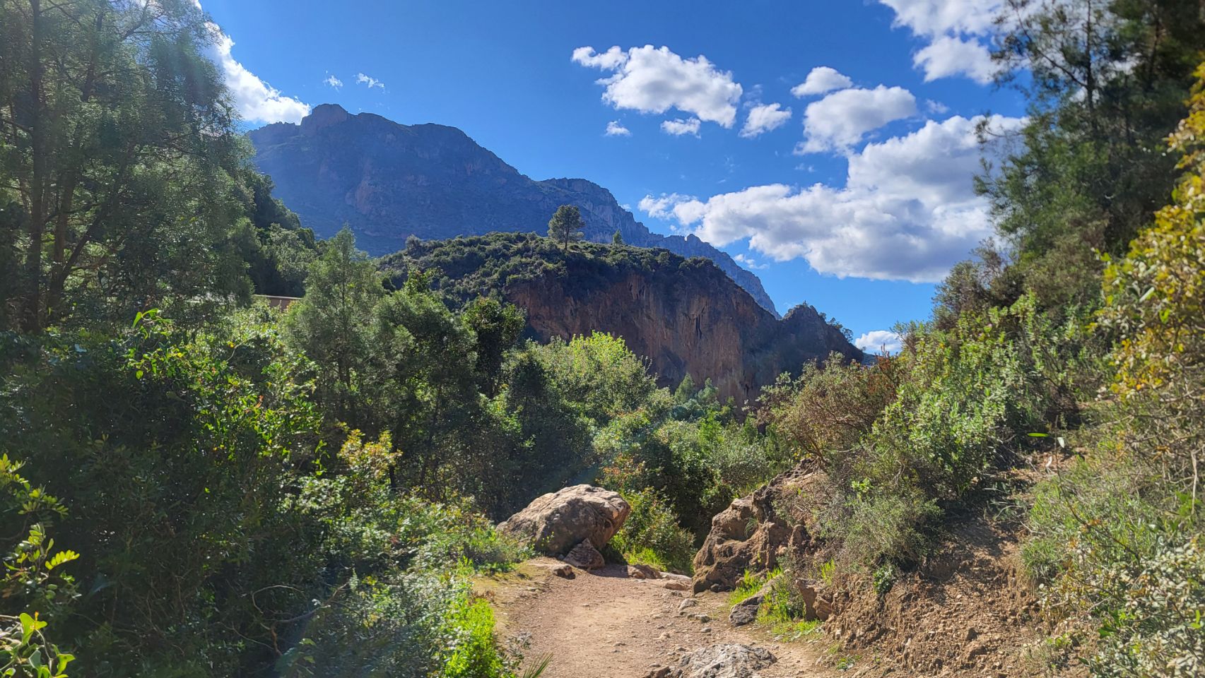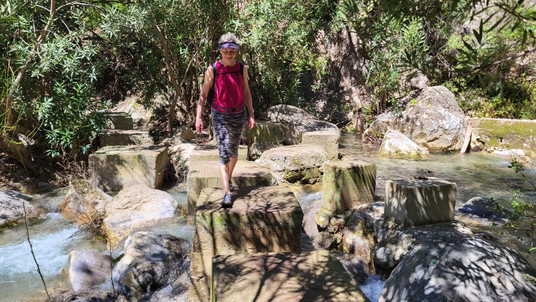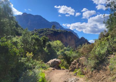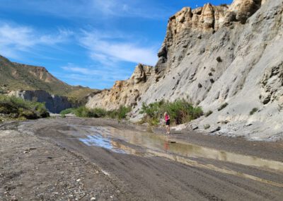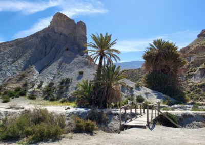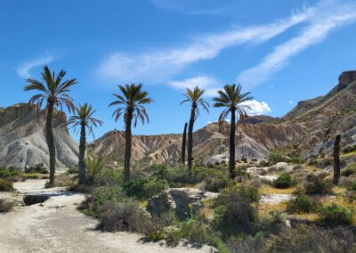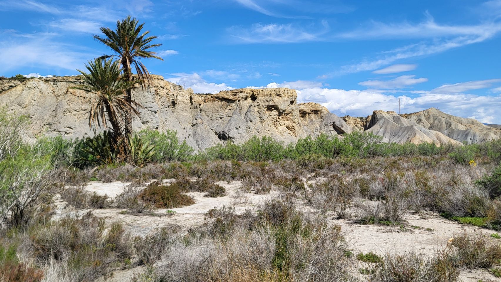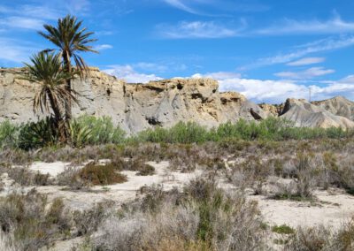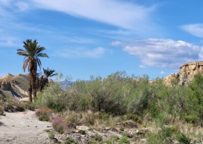 We zitten hier meteen op een hiketrail door de ramblas. Je ziet veel ramblas in het zuiden van Spanje. Dat zijn droge rivierbeddingen waar alleen water doorheen stroomt als het veel geregend heeft. De wandeling is meteen spectaculair. De zandstenen rotsen zijn hoog en in mooie vormen geslepen door weer en wind. De zon, palmbomen en een enkele cactus maken het plaatje af. We dolen twee uur rond. De zon is heerlijk, niet te warm en door het mooie licht kan ik bijna niet stoppen met fotograferen.