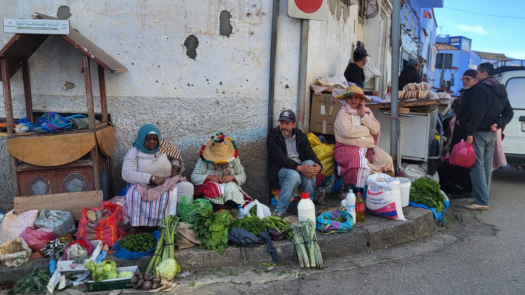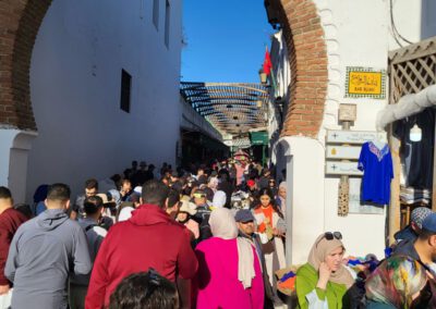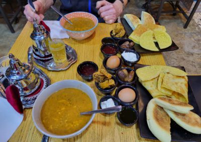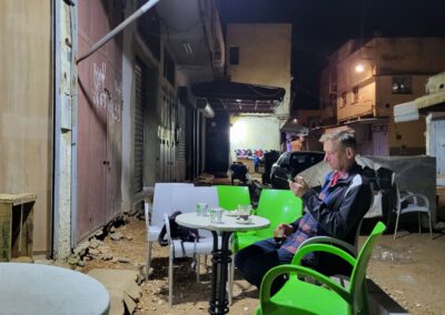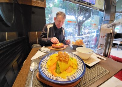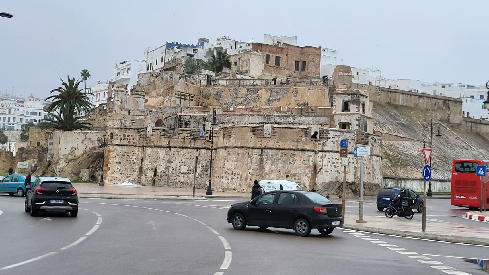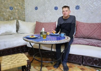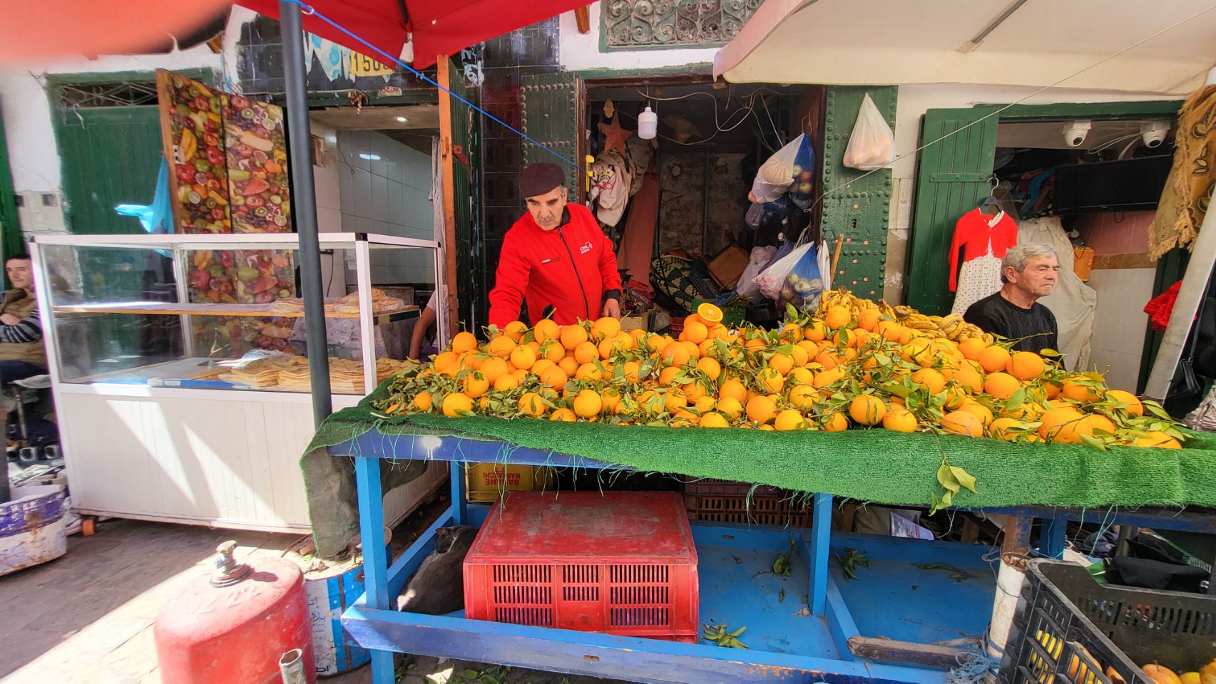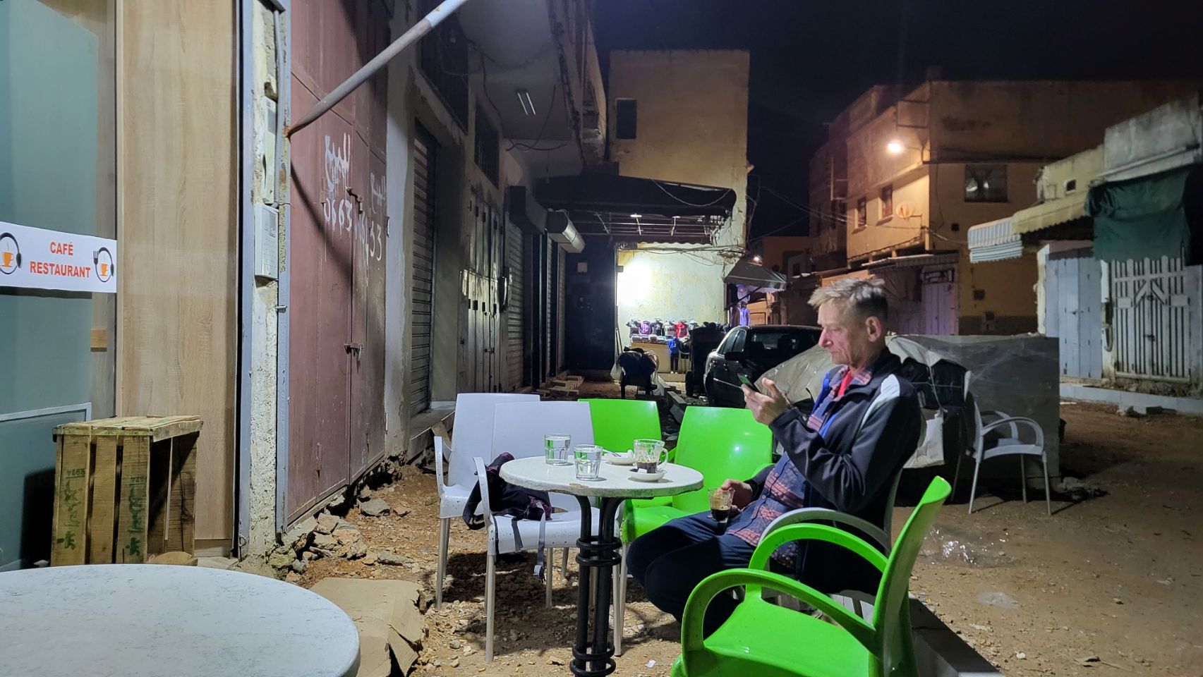 Eenmaal van de boot na de laatste paspoortcontrole moeten we nog door een haag van douaniers. Ze bonken een beetje op onze tassen en vragen of we een drone bij ons hebben. Nee, deze keer niet. En dan fietsen we Marokko in onder een grijze druilerige lucht. Onderweg naar ons hotel stoppen we om wat te eten. Onze eerste tajine en koeskoes smaken heerlijk. Als Willem een vino tinto bestelt wordt hij meewarig aangekeken door de ober. Thee dan misschien…? Na het inchecken gaan we de stad verkennen. Er heerst een gezellige chaos en er wordt allerlei lekkers ingekocht voor straks, als het vasten wordt verbroken na zonsondergang.