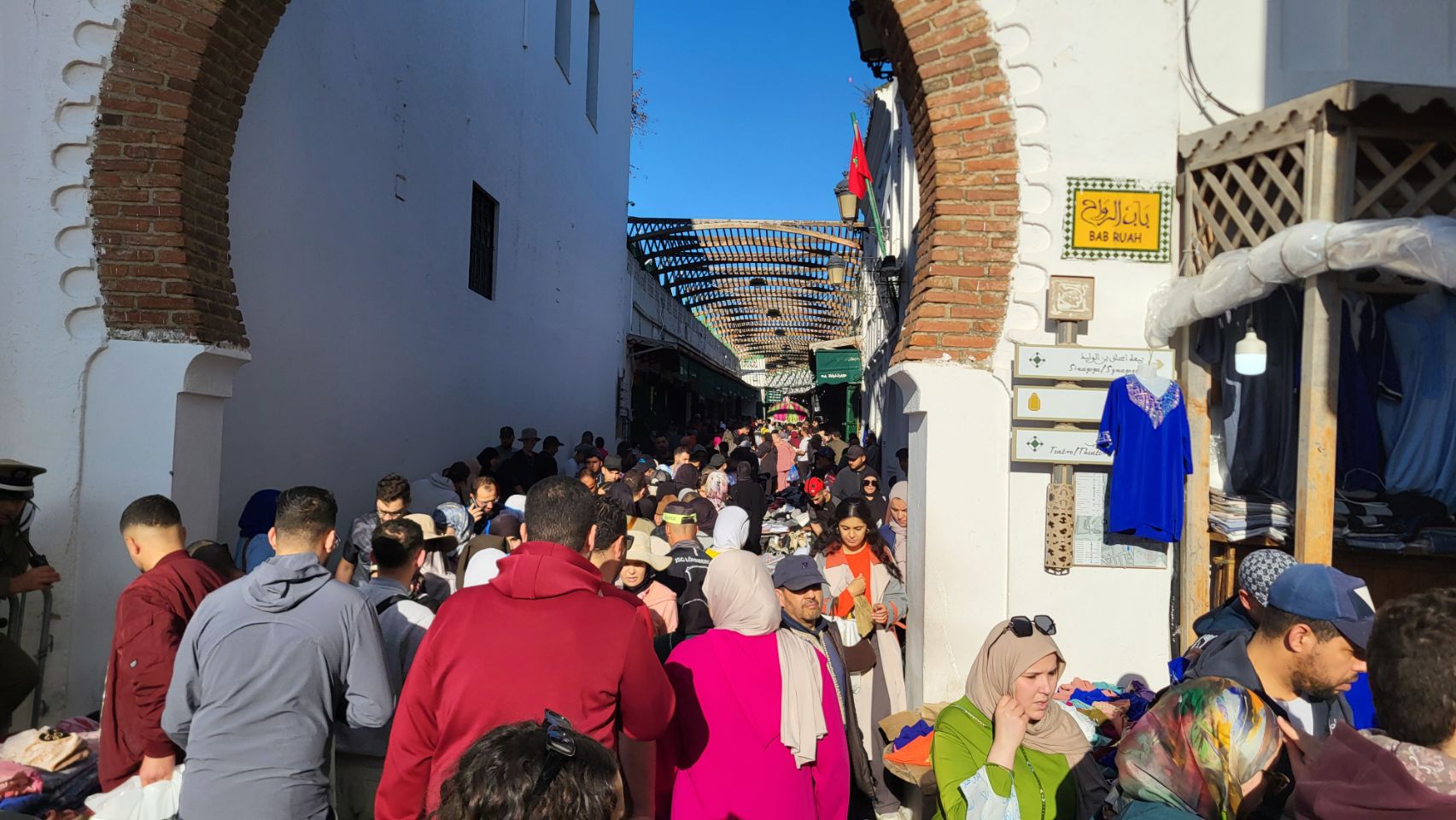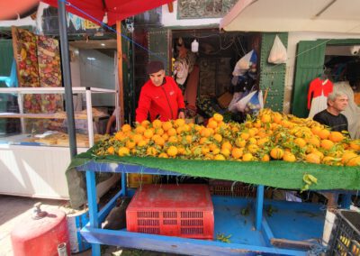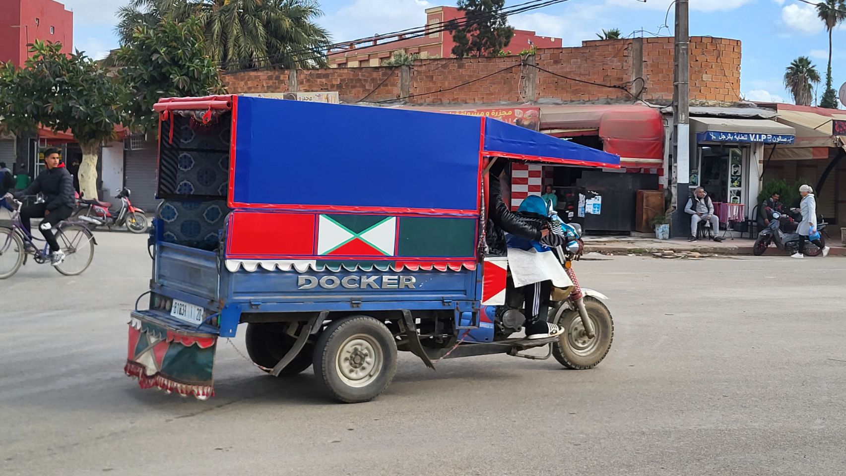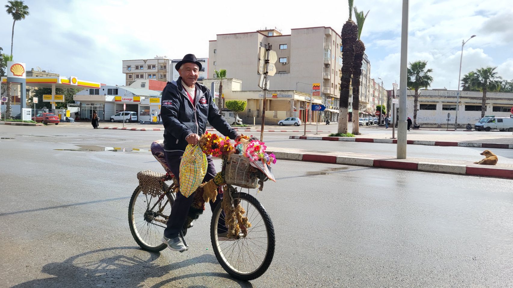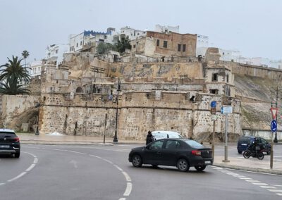 Eenmaal van de boot na de laatste paspoortcontrole moeten we nog door een haag van douaniers. Ze bonken een beetje op onze tassen en vragen of we een drone bij ons hebben. Nee, deze keer niet. En dan fietsen we Marokko in onder een grijze druilerige lucht. Onderweg naar ons hotel stoppen we om wat te eten. Onze eerste tajine en koeskoes smaken heerlijk. Als Willem een vino tinto bestelt wordt hij meewarig aangekeken door de ober. Thee dan misschien…? Na het inchecken gaan we de stad verkennen. Er heerst een gezellige chaos en er wordt allerlei lekkers ingekocht voor straks, als het vasten wordt verbroken na zonsondergang.