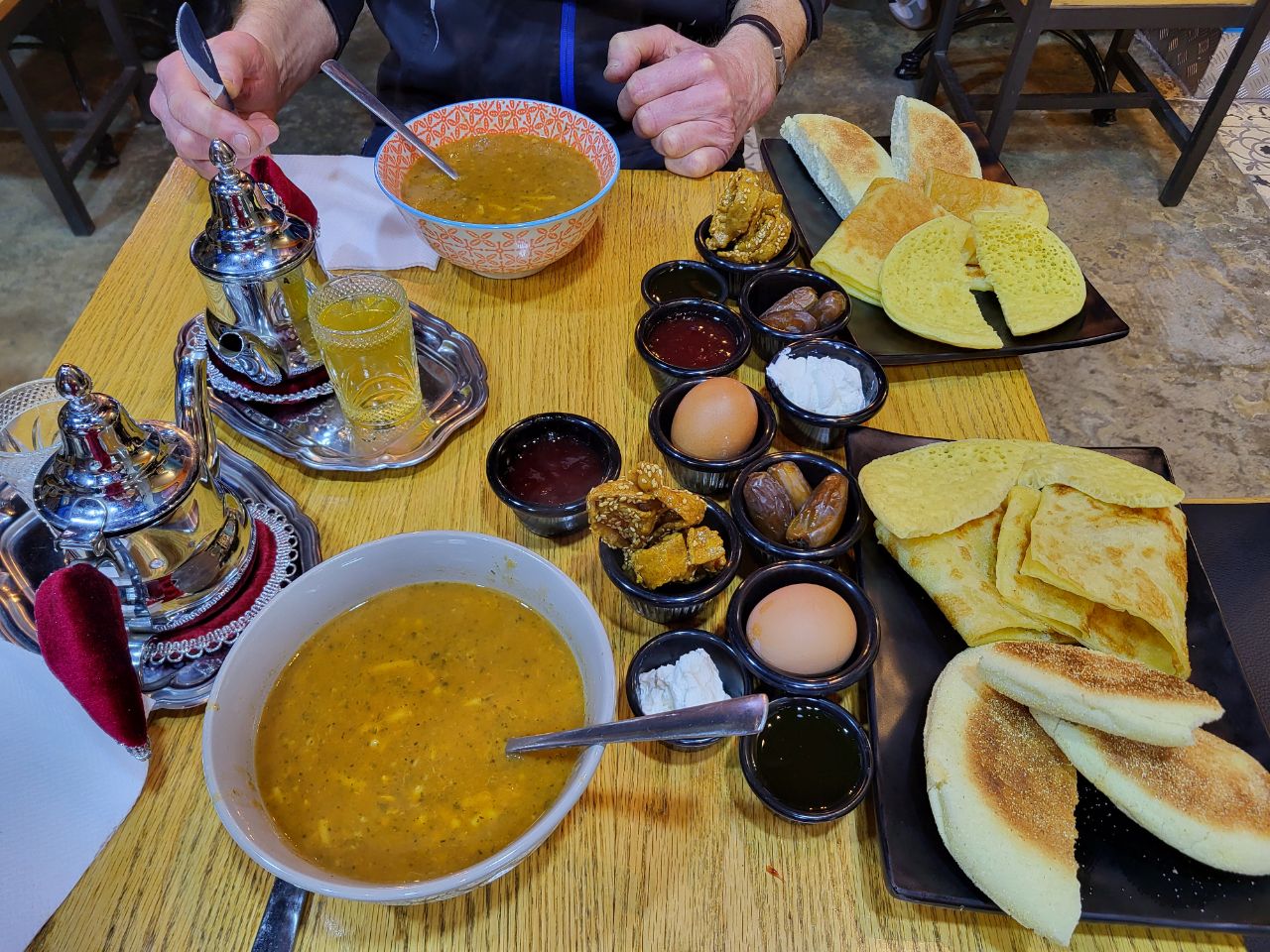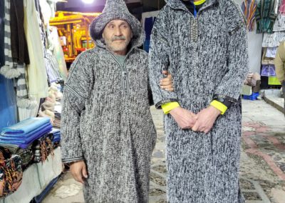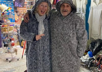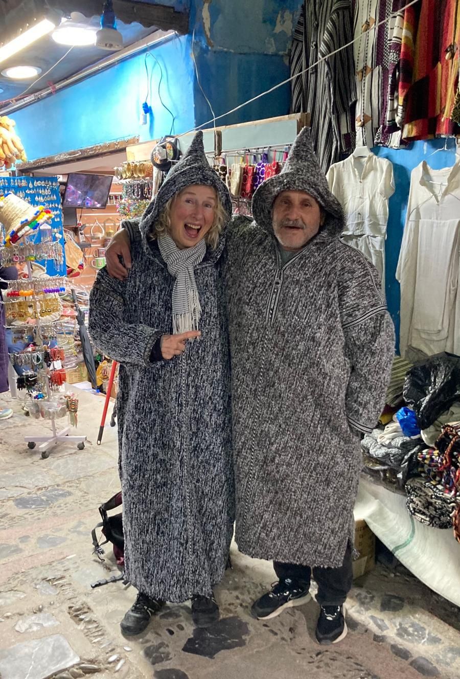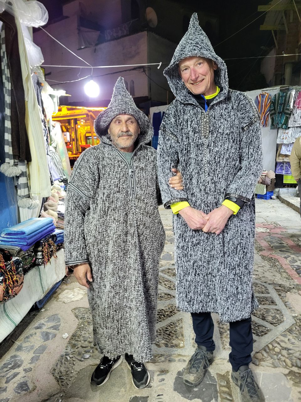 Zoals elke avond beginnen we met een heerlijke Harirasoep om op te warmen. Als we terug lopen naar de riad zwicht Willem voor zo’n lekker warme schapenwollen djellaba, waar alle mannen hier in lopen. Ik pas hem ook dus deze gaan we zeker thuis ook dragen in de winter. Maar nog wel even meeslepen die extra kilo op de fiets…