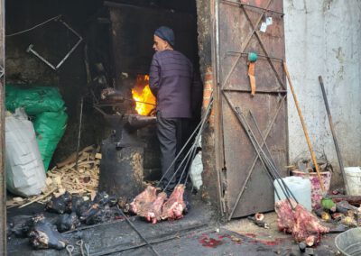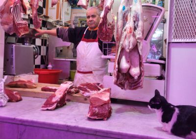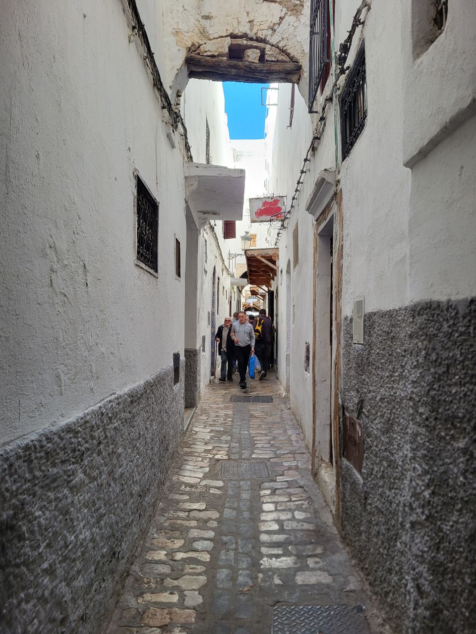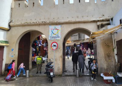 Vanmorgen extreem vroeg worden we wakker van de gebeden die uit de moskeespeaker komen. Het komt boven het gekletter van de regen uit, dus we draaien ons nog maar eens om. Geen haast vandaag, we blijven in Tanger. We ontbijten buiten de deur en lopen daarna door richting de Medina. Onderweg zien we in een straat een hele rij minuscuul kleine werkplaatsjes, niet groter dan enkele vierkante meters. Er wordt metaal bewerkt, gerepareerd en er zijn enkele zaakjes waar een stapel schapenpoten en koppen liggen. Deze worden aan stalen pennen gespiesd en vervolgens in een vuur zwart geroosterd. Ze zijn voor de koeskoes en tajines.