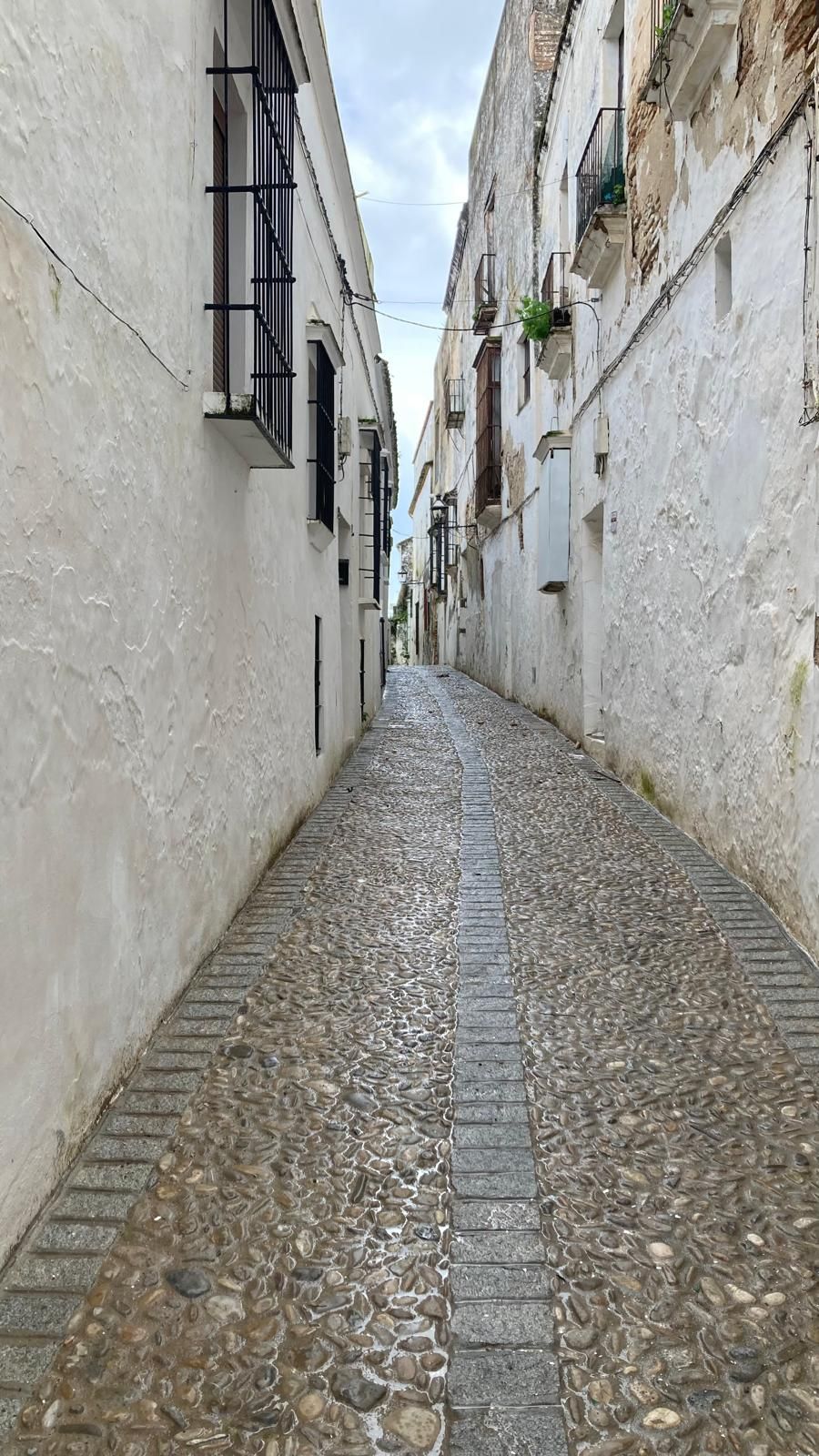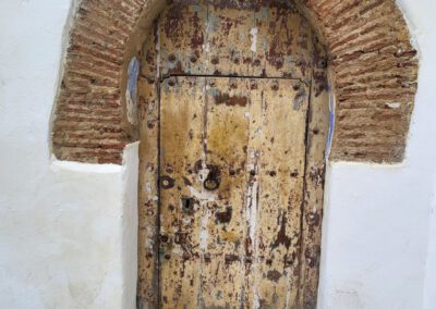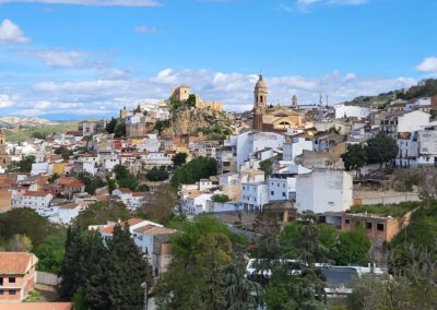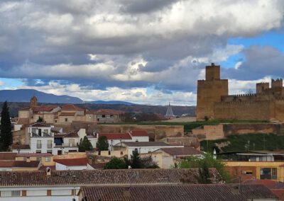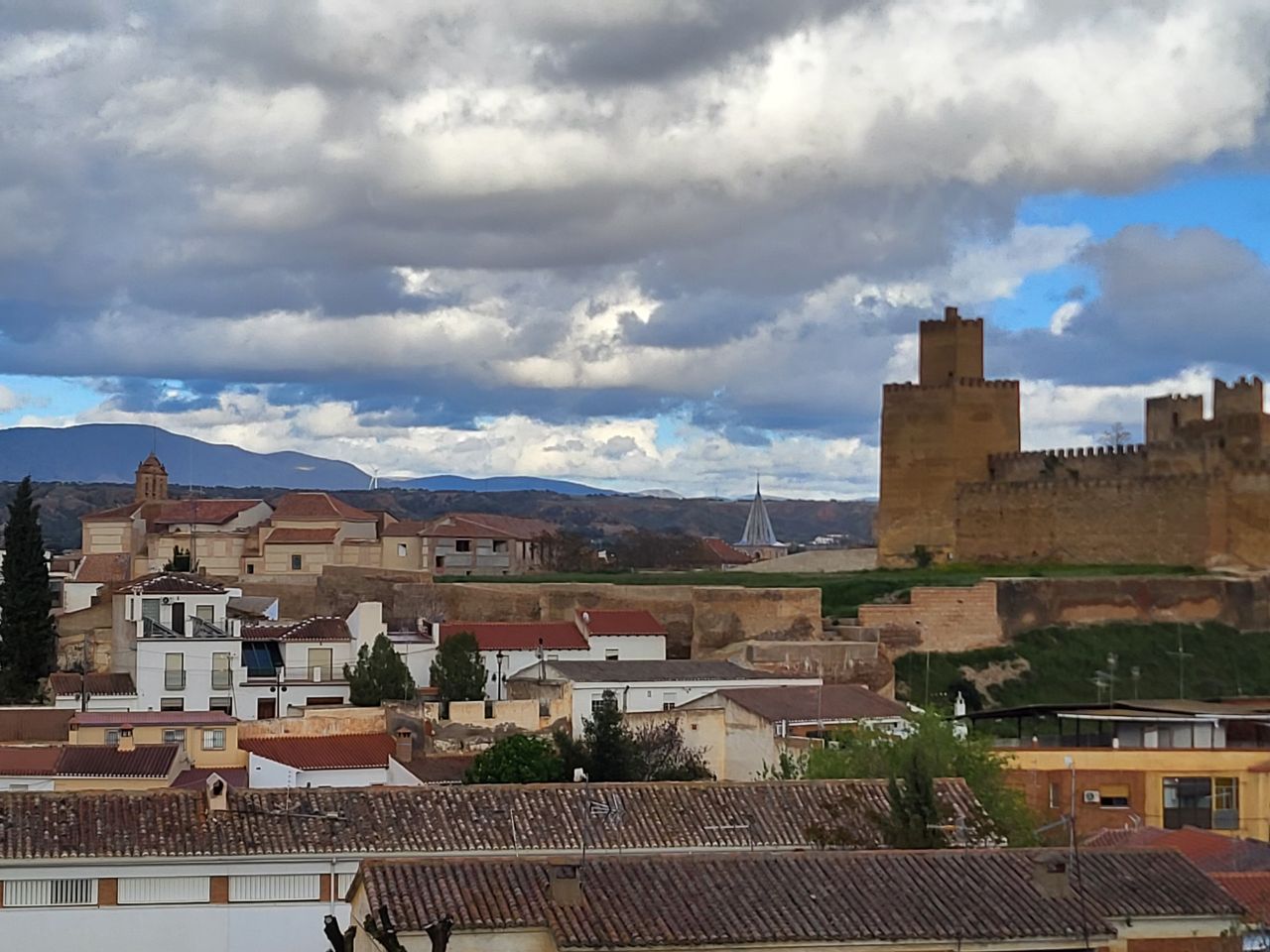 Als we wakker worden, komt de regen met bakken uit de lucht bij harde windstoten. Als het een beetje is bedaard, halen we een ontbijtje in de supermarkt en eten op de kamer. We hebben een prachtige mozaïeken binnenplaats in het hostal, maar die staat ook blank. ’s Middags trekt het even open en dwalen we door de straatjes naar boven naar het zandstenen Castillo de los Arcos, dat hoog op een rotswand uittorent boven de witte huizen. Terwijl we wat eten breekt de hel weer los. Na al die te droge jaren hebben ze nu hopelijk even een buffertje water.