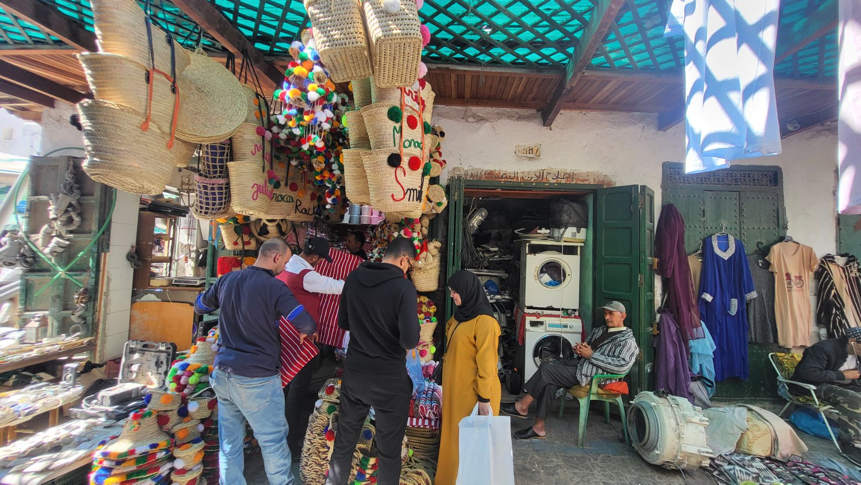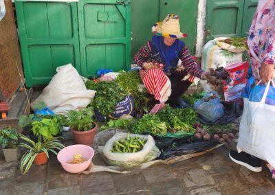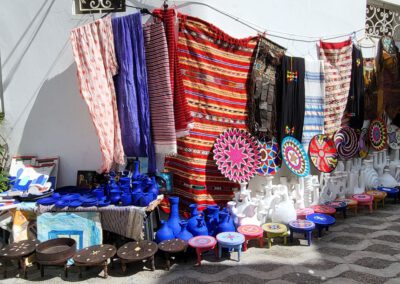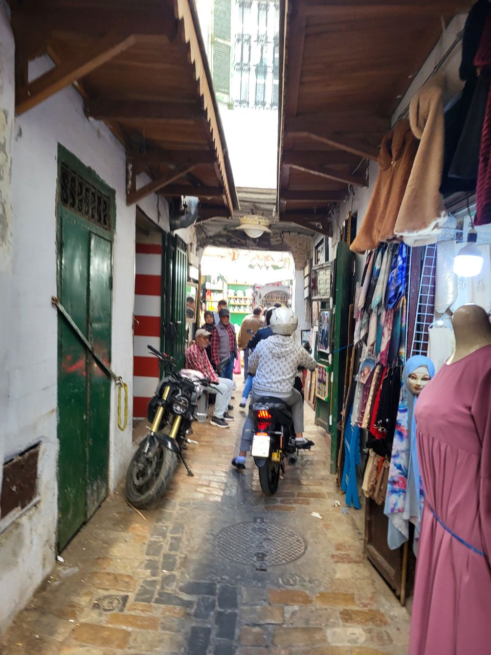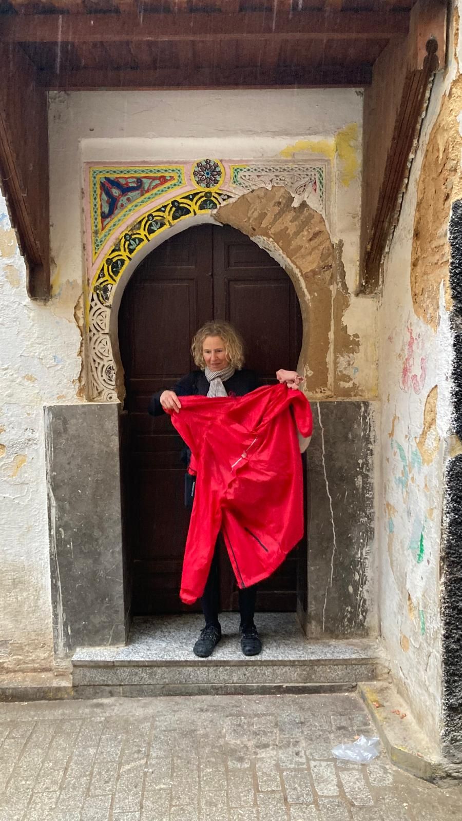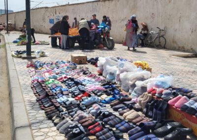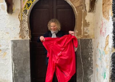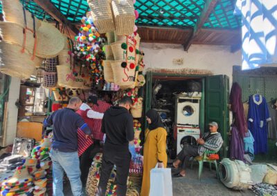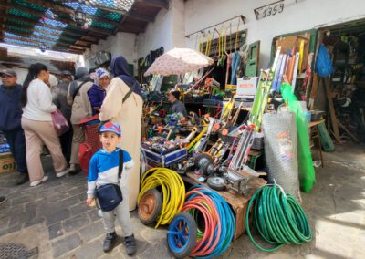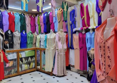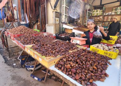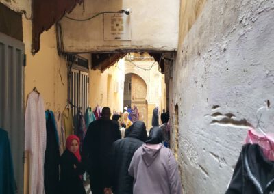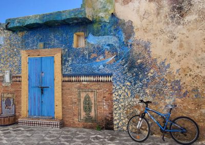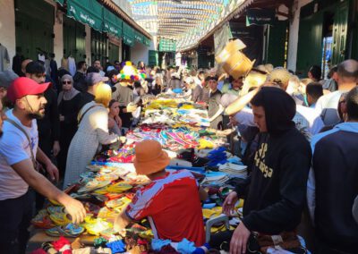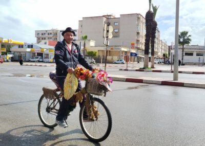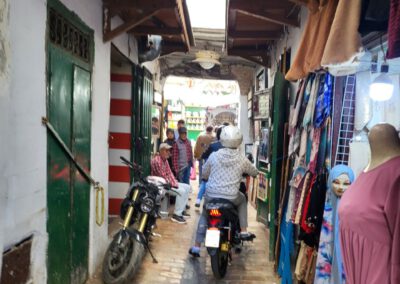 Hier en daar zitten mensen op de stoep met een kleedje koopwaar. Af en toe breekt een stortbui los, waarbij alles in korte tijd kletsnat regent. De medina is leuk om doorheen te struinen. Er zijn veel ateliers waar met de hand stoffen worden geweven voor djellaba’s, kaftans, sjaals, gordijnen, enz. De stoffen zijn echt prachtig en van heel mooie kwaliteit. Alles wordt met de hand in elkaar genaaid en zelfs de uitgebreide borduursels worden met de hand erop gezet. Dit gebeurt door mannen die in kleermakerszit in piepkleine ruimtes in de steegjes zitten. Helaas moeten we alle koopwaar afslaan, we willen voorlopig geen extra bagage in onze fietstassen.