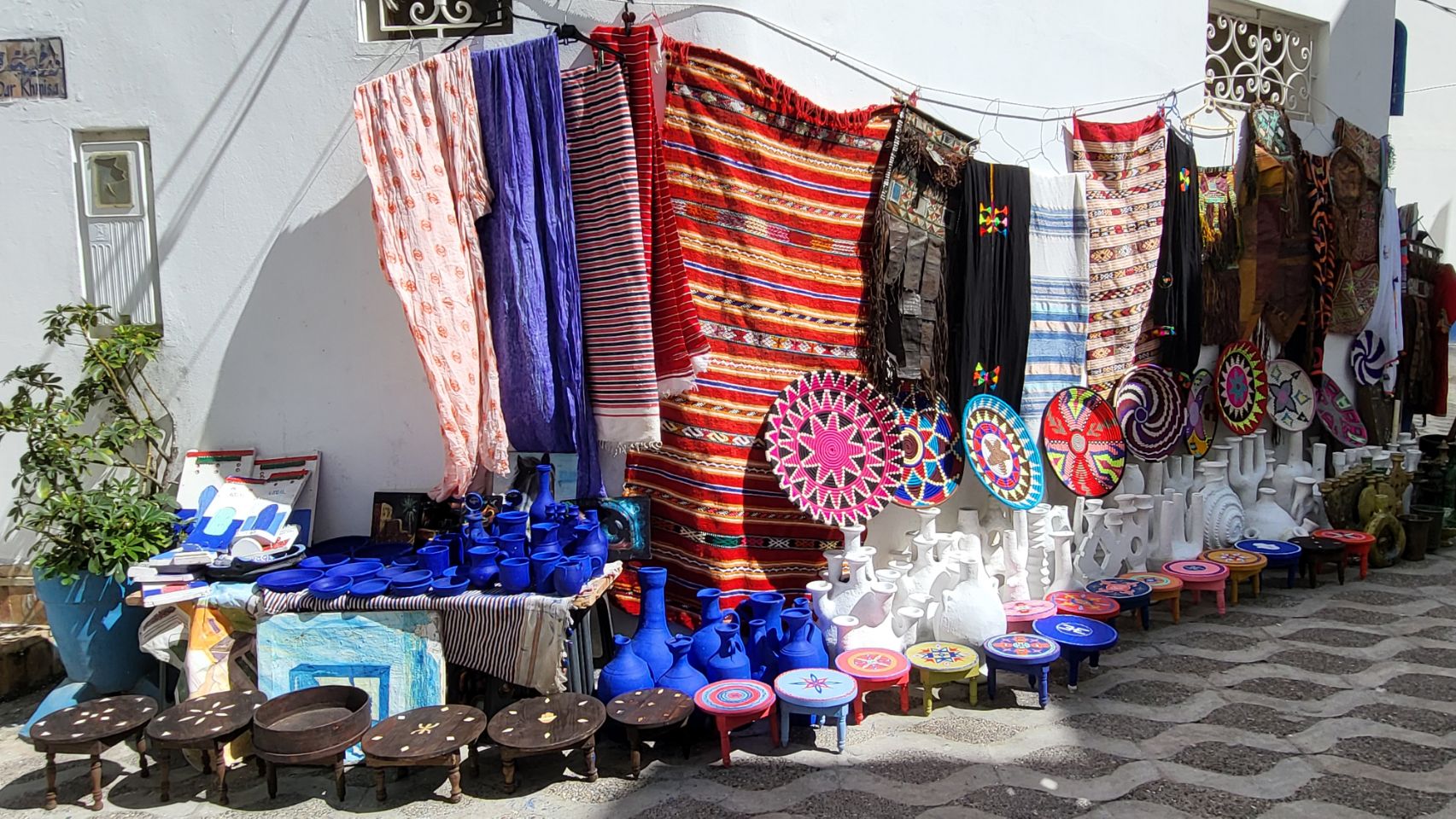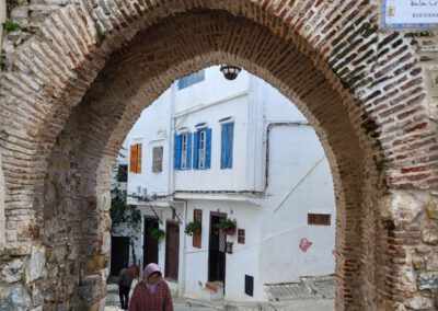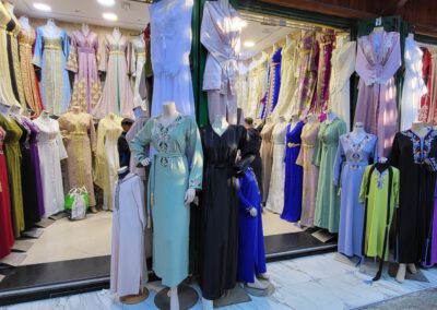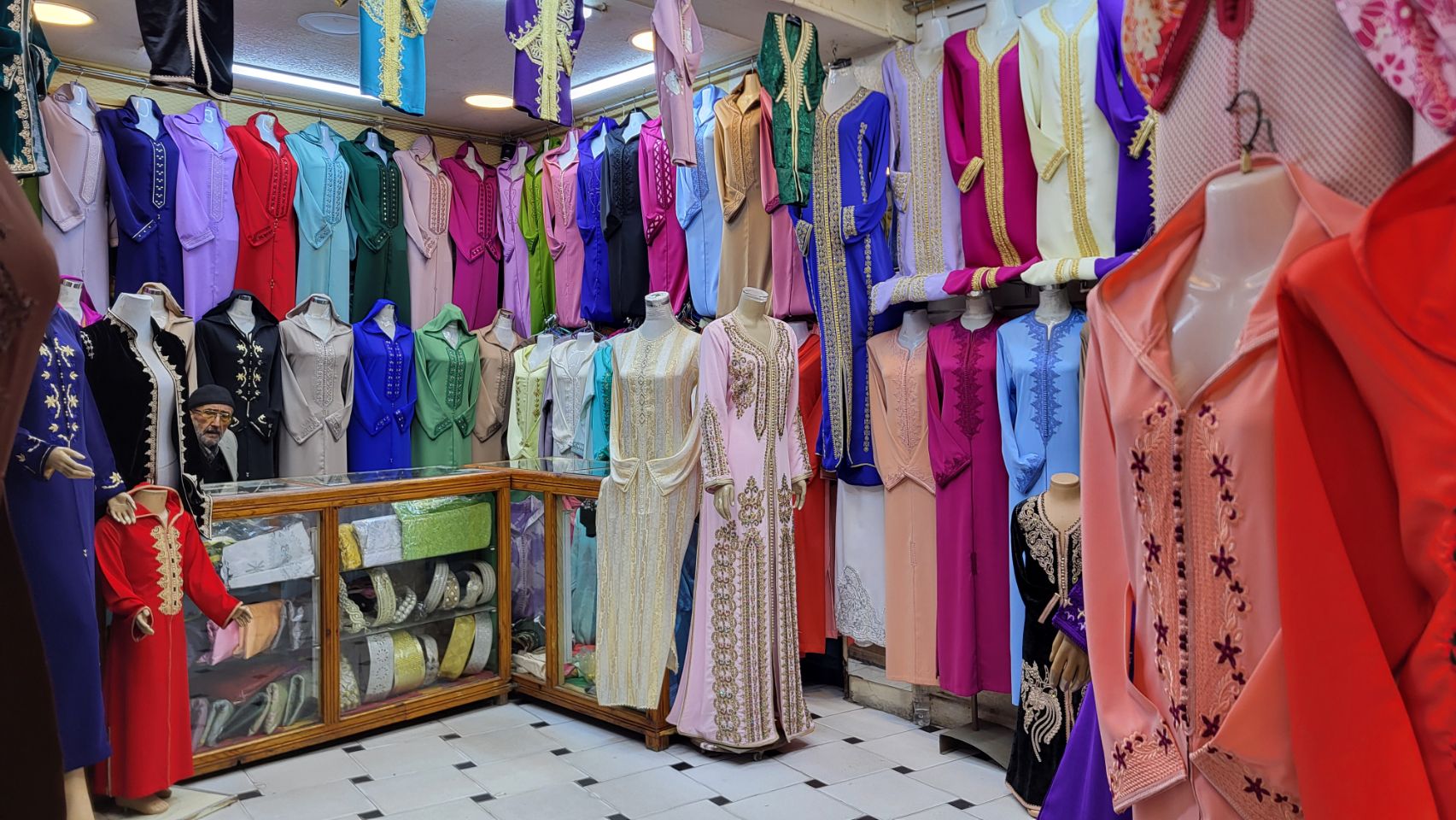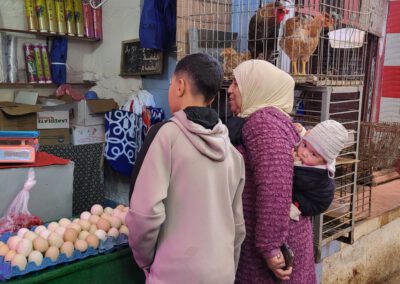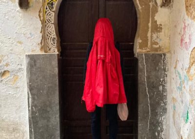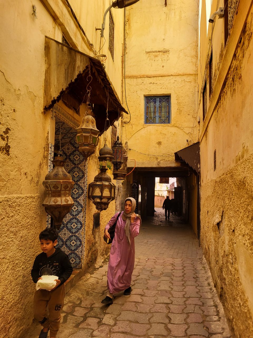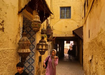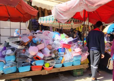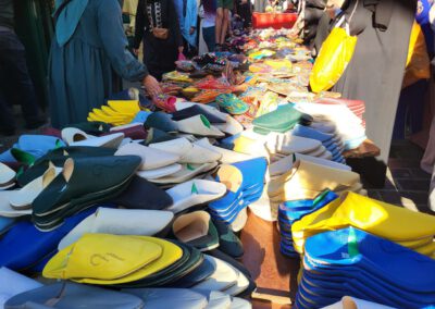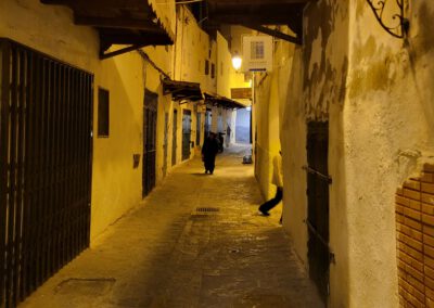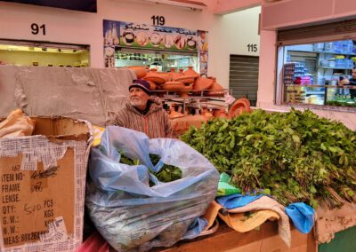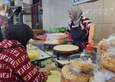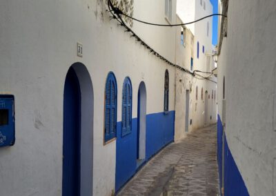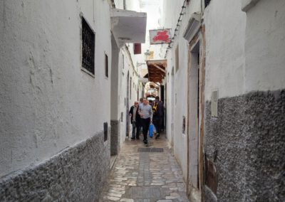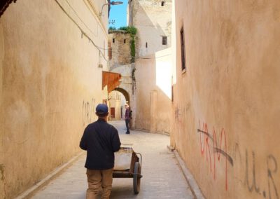 Hier en daar zitten mensen op de stoep met een kleedje koopwaar. Af en toe breekt een stortbui los, waarbij alles in korte tijd kletsnat regent. De medina is leuk om doorheen te struinen. Er zijn veel ateliers waar met de hand stoffen worden geweven voor djellaba’s, kaftans, sjaals, gordijnen, enz. De stoffen zijn echt prachtig en van heel mooie kwaliteit. Alles wordt met de hand in elkaar genaaid en zelfs de uitgebreide borduursels worden met de hand erop gezet. Dit gebeurt door mannen die in kleermakerszit in piepkleine ruimtes in de steegjes zitten. Helaas moeten we alle koopwaar afslaan, we willen voorlopig geen extra bagage in onze fietstassen.