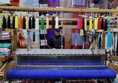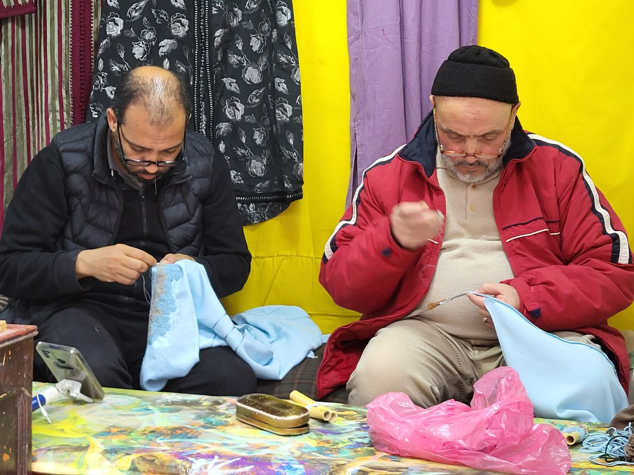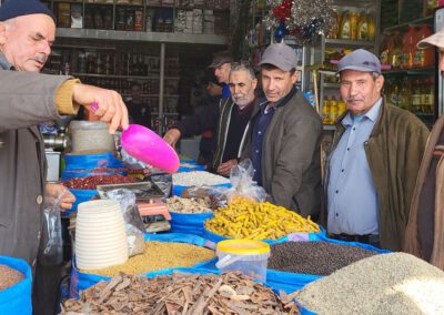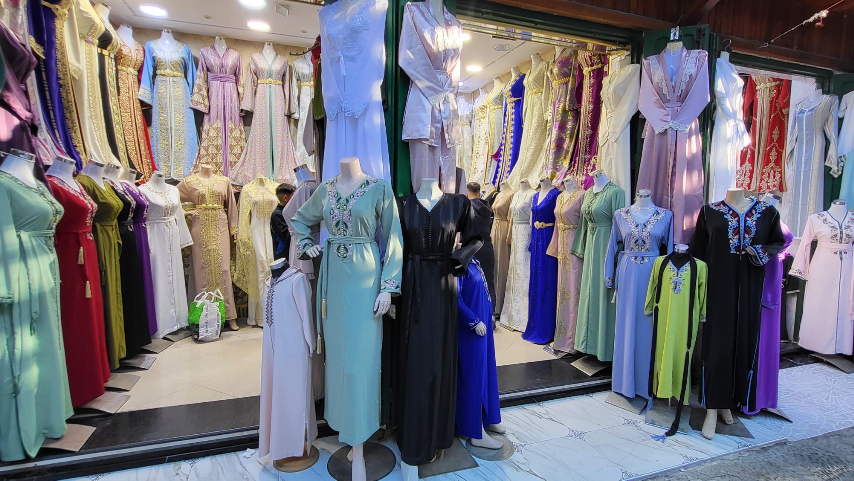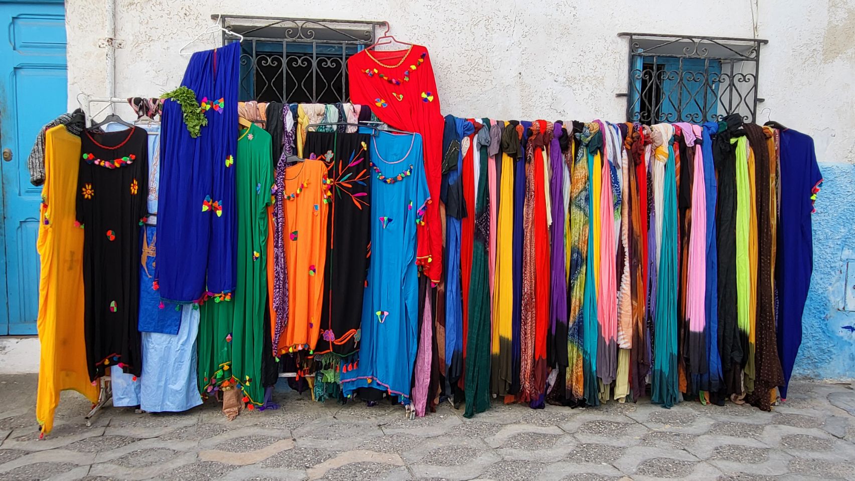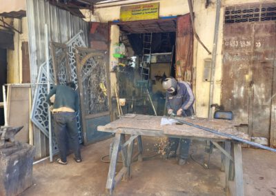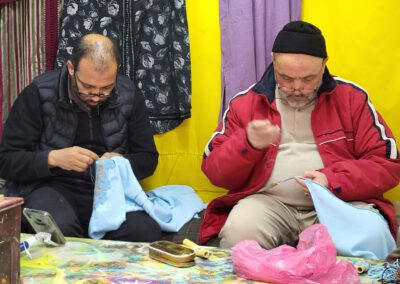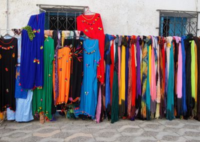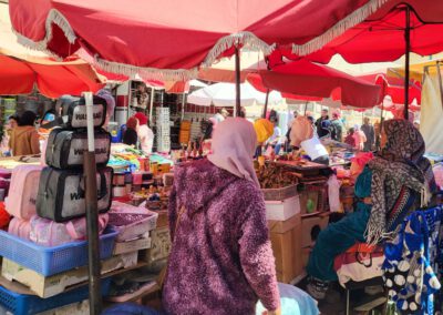 Hier en daar zitten mensen op de stoep met een kleedje koopwaar. Af en toe breekt een stortbui los, waarbij alles in korte tijd kletsnat regent. De medina is leuk om doorheen te struinen. Er zijn veel ateliers waar met de hand stoffen worden geweven voor djellaba’s, kaftans, sjaals, gordijnen, enz. De stoffen zijn echt prachtig en van heel mooie kwaliteit. Alles wordt met de hand in elkaar genaaid en zelfs de uitgebreide borduursels worden met de hand erop gezet. Dit gebeurt door mannen die in kleermakerszit in piepkleine ruimtes in de steegjes zitten. Helaas moeten we alle koopwaar afslaan, we willen voorlopig geen extra bagage in onze fietstassen.