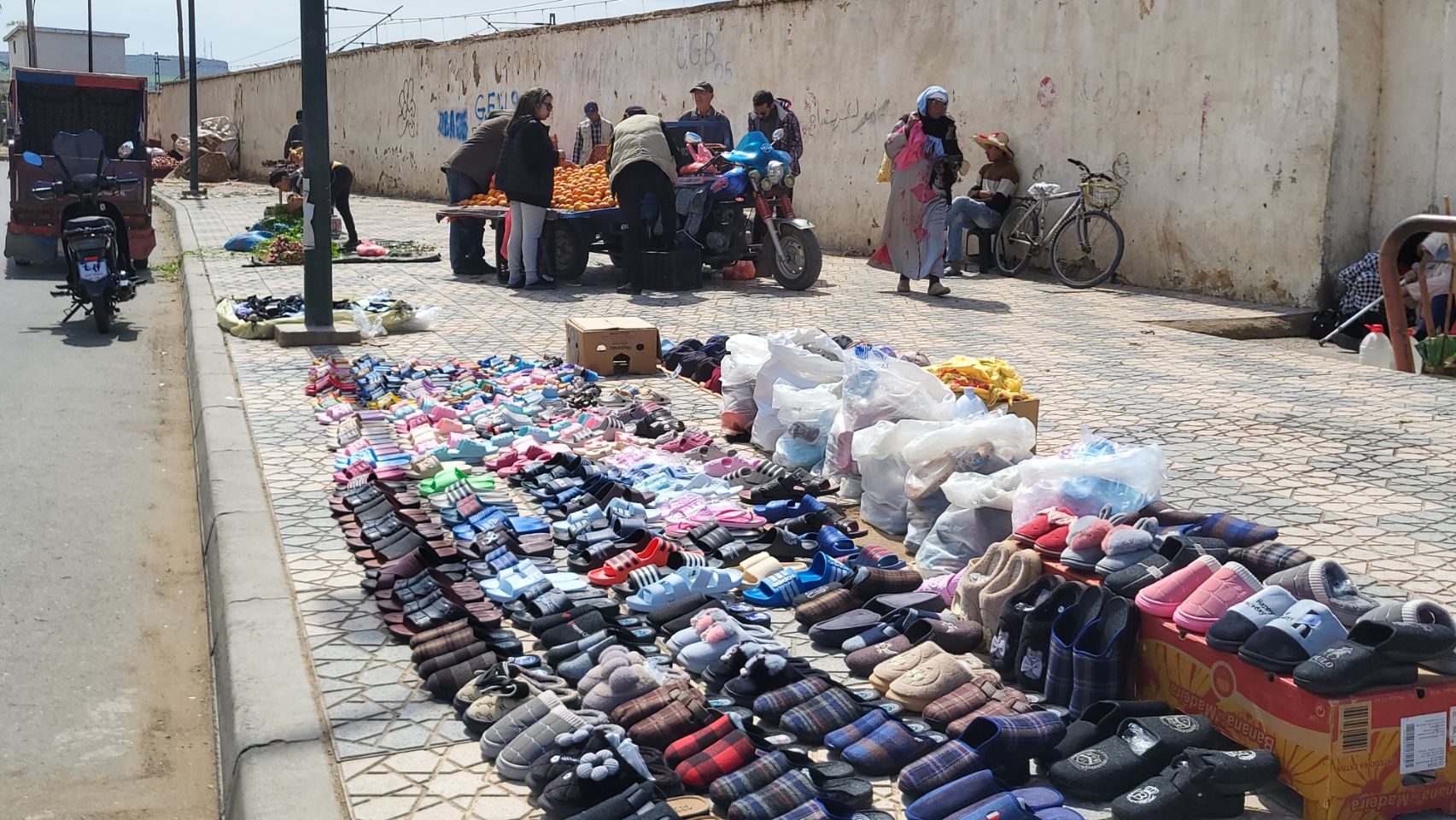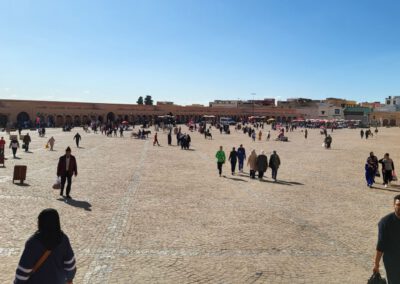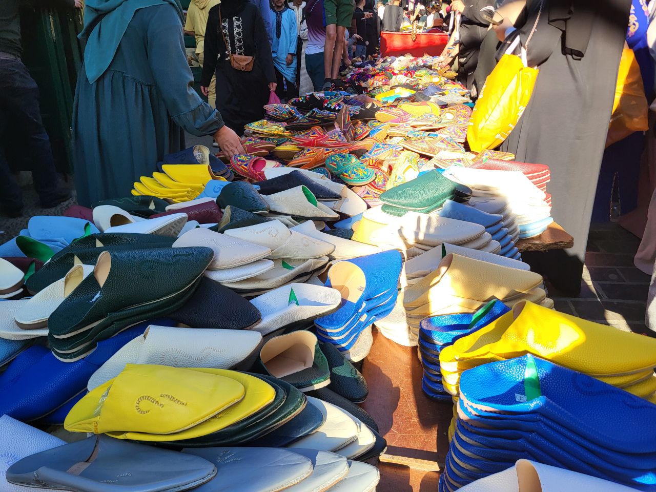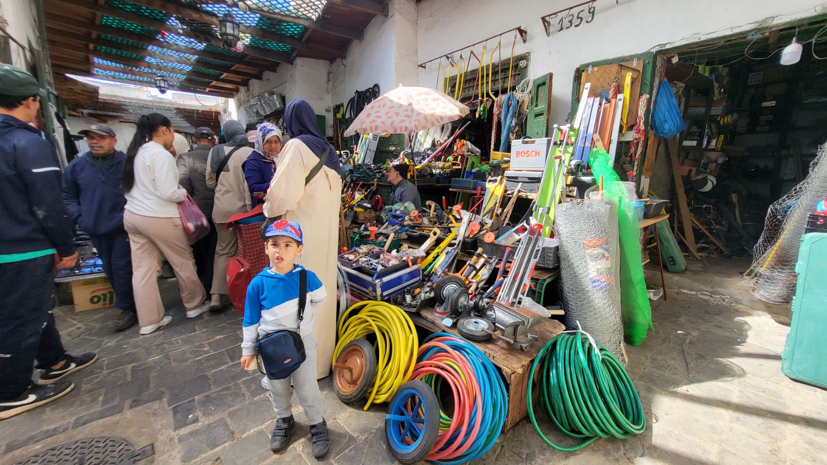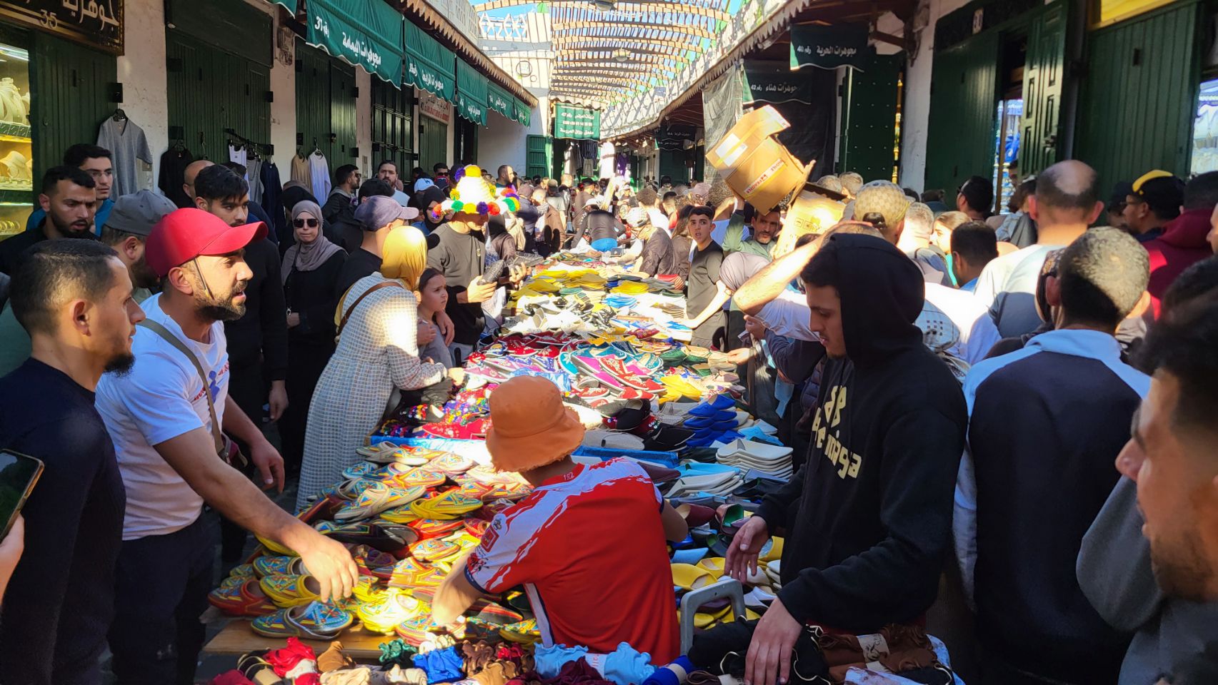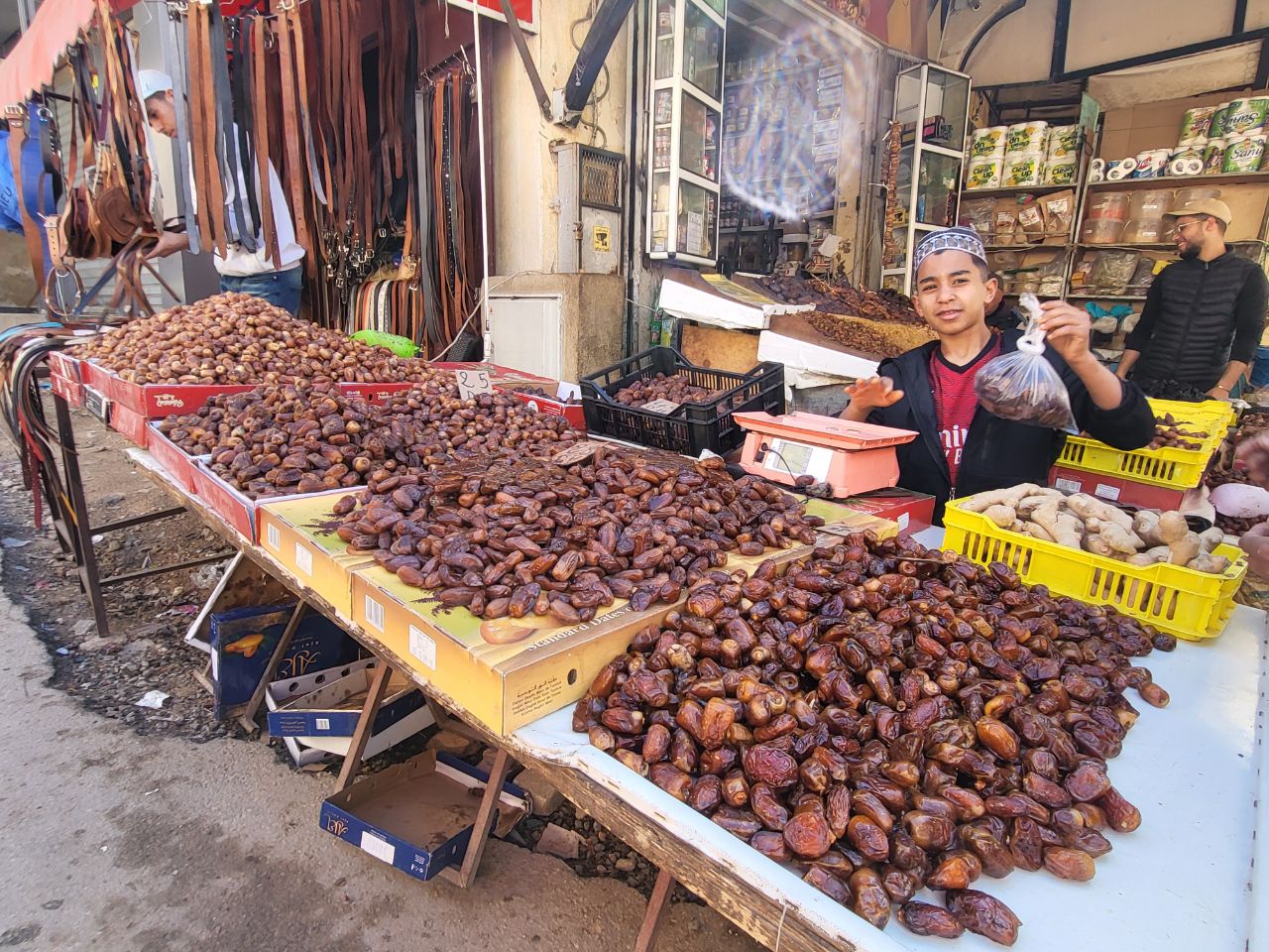 Behalve in de kiosken van de medina verkopen ze ook op de markten in de straten in de omgeving bergen kleding, miljoenen schoenen, keukengerei en verzorgingsproducten. Hoog opgetaste kruiden, groenten en fruit, noten en dadels en veel zoete baksels. En elke dag weer komen er vele mensen op af die struinen door de smalle loopruimtes. We kopen twee stokbroden en twee grote malse avocado’s en eten deze op het dakterras van ons riad als lunch.