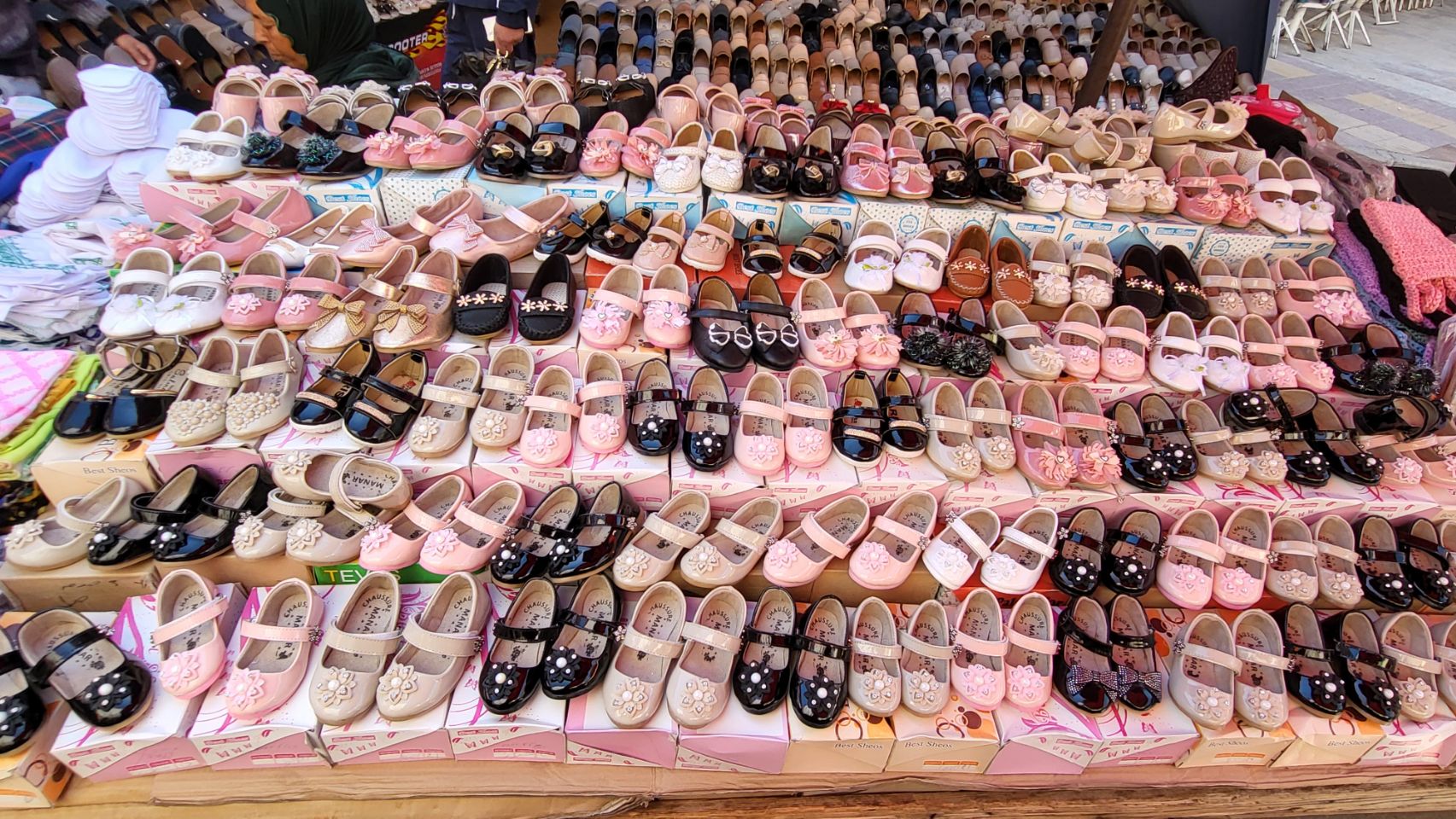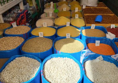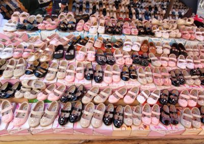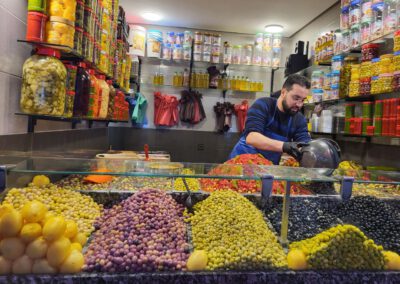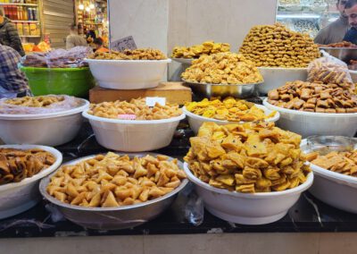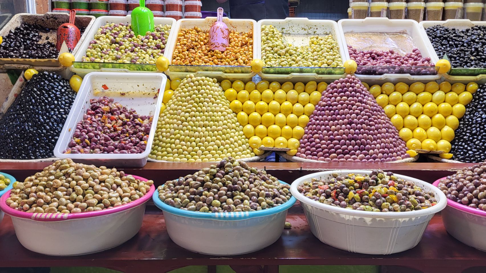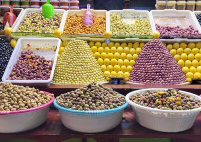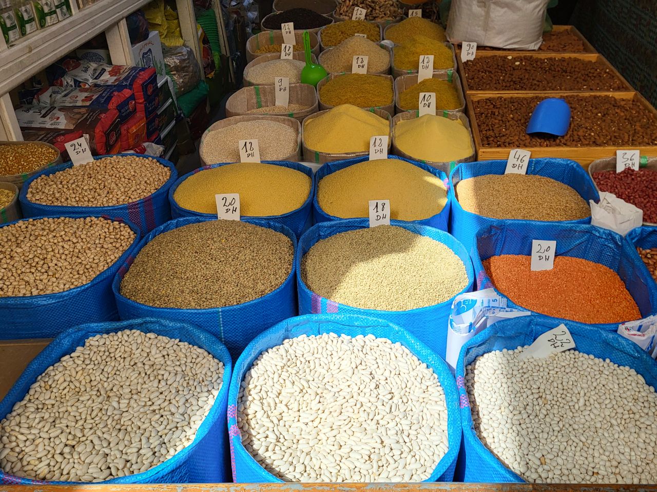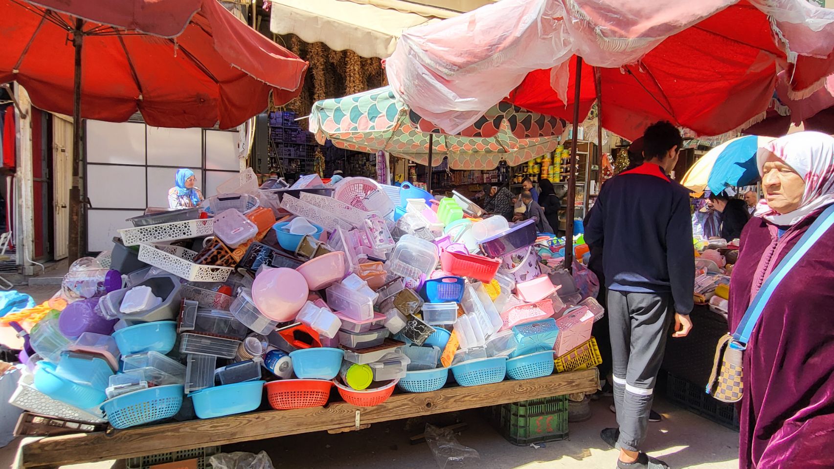 Behalve in de kiosken van de medina verkopen ze ook op de markten in de straten in de omgeving bergen kleding, miljoenen schoenen, keukengerei en verzorgingsproducten. Hoog opgetaste kruiden, groenten en fruit, noten en dadels en veel zoete baksels. En elke dag weer komen er vele mensen op af die struinen door de smalle loopruimtes. We kopen twee stokbroden en twee grote malse avocado’s en eten deze op het dakterras van ons riad als lunch.