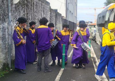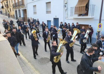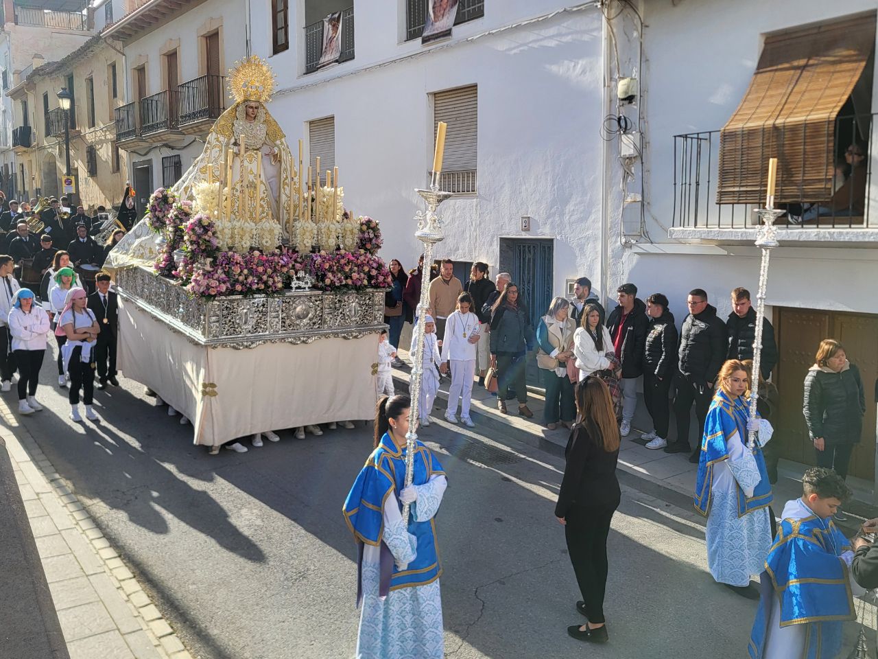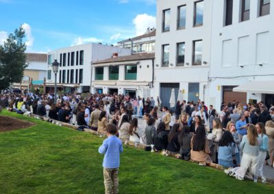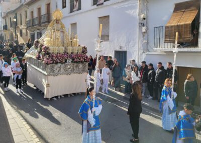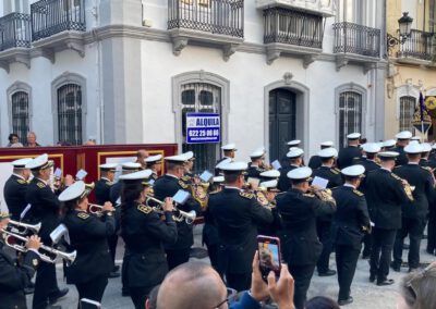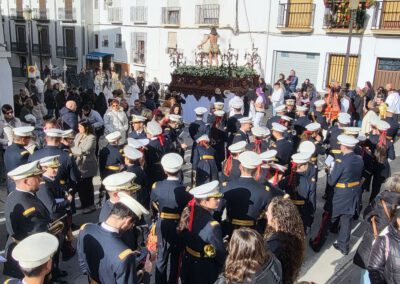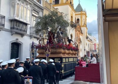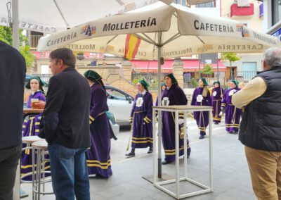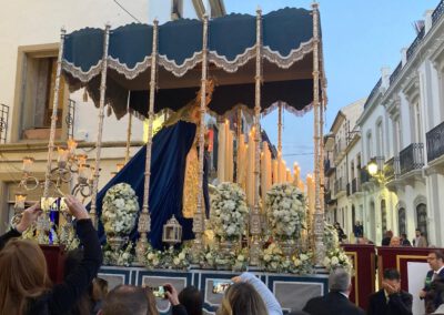 Het is een gezellige boel in Ronda. Spanjaarden op hun paasbest bevolken de straatjes, vandaag is de paasweek, Semana Santa, begonnen. Als we gaan eten komen de processies al langs. Begeleid door indringende stemmige muziek van trommelaars en koperblazers worden enkele grote draagbaren met daarop heilige figuren en kaarsen en bloemstukken door de straten gedragen. Onder zo’n enorm gevaarte zijn tientallen dragers verstopt die gelijktijdig stapje voor stapje voort gaan. Het gevaarte zwabbert mee bij elke stap. Omdat het zo zwaar is, wisselt de groep dragers regelmatig met een verse groep. Voor en achter lopen broederschappen in witte gewaden en zwarte puntmutsen. De optocht gaat langzaam en gaat heel de avond door. We hebben het andere jaren al gezien, maar ook als je niets met het geloof hebt, blijft het toch een indrukwekkende traditie.