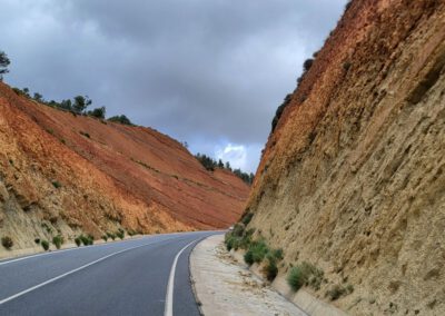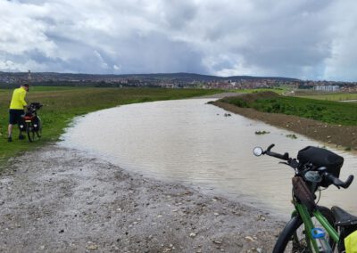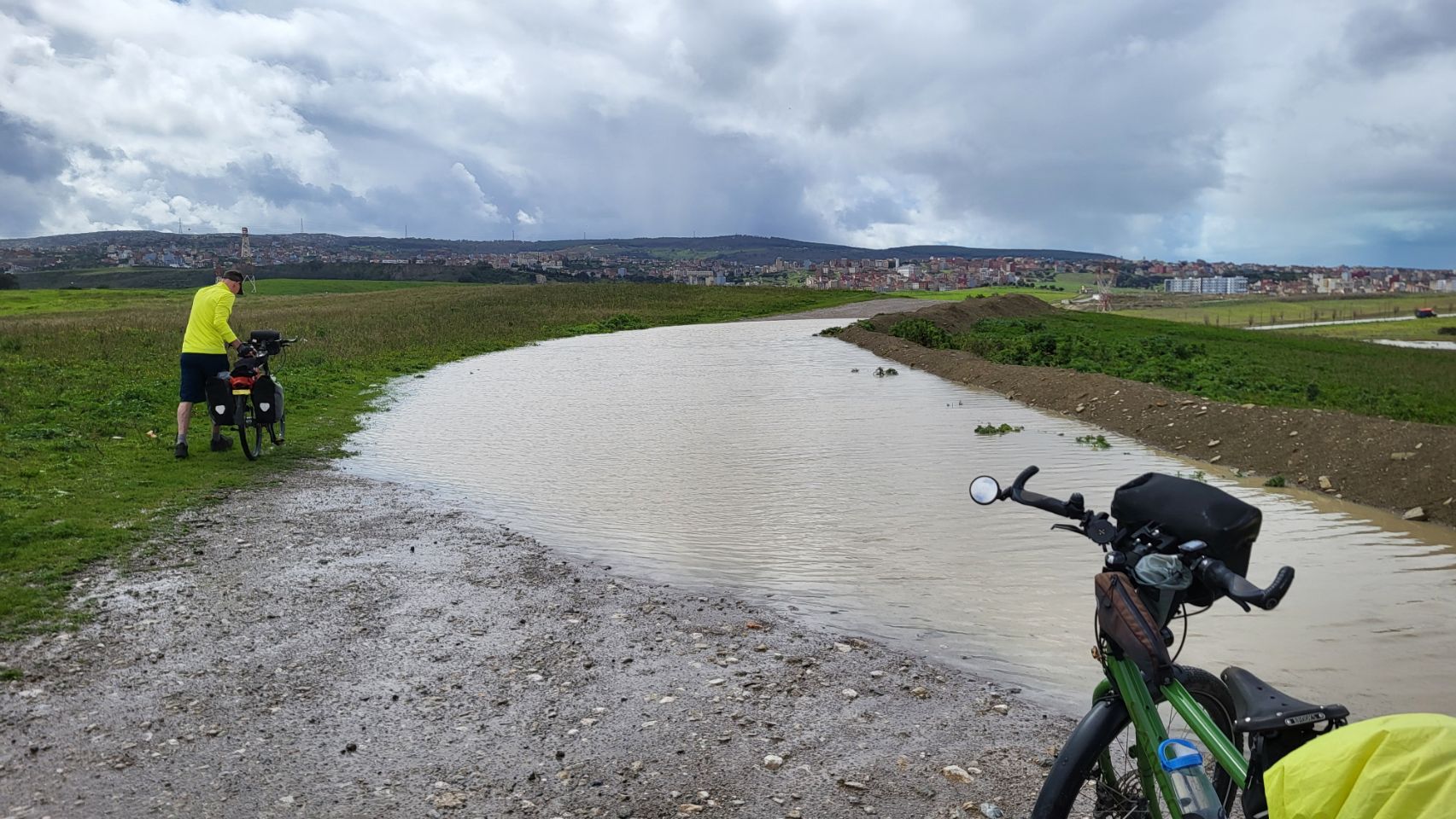 Na drie droge dagen worden we weer wakker met het vertrouwde geluid van de regen. De temperatuur zal vandaag niet boven de 12 graden uitkomen en daarom kiezen we voor de meest rechtstreekse route naar Fez. We wachten na het ontbijt tot het droog is en vertrekken dan via de smalle straatjes van de medina de stad uit. Al snel fietsen we alsnog in de regen. Ik stuur door diepe plassen om de ergste modder een beetje van mijn fiets te wassen. Er ligt zowaar een stuk fietspad langs de weg. Niet dat je daar blij van wordt, want bij elke zijstraat moet je de stoep op en af. Net zoals het lang bij ons in Nederland geweest is, tot ze door kregen dat doorgetrokken fietspaden veiliger en comfortabeler zijn.