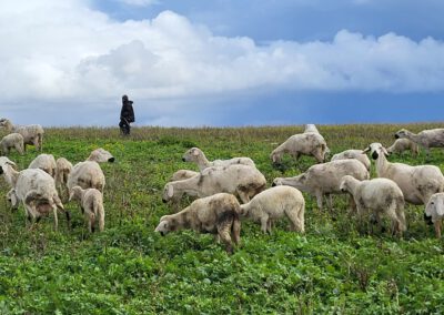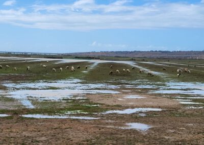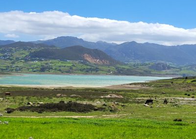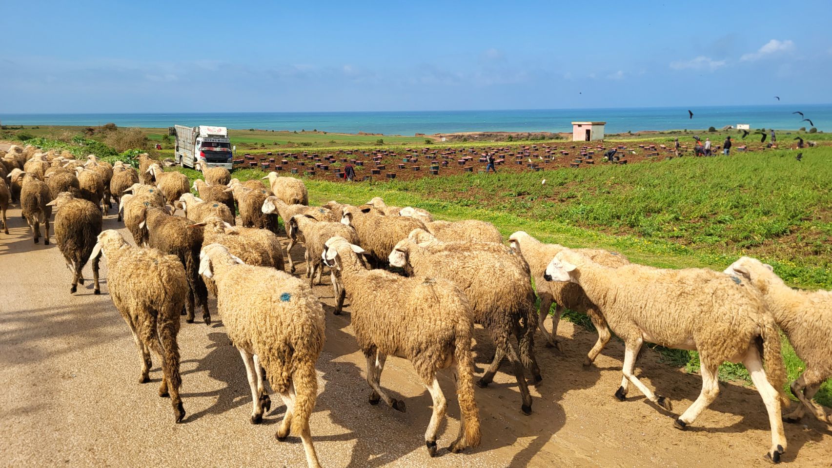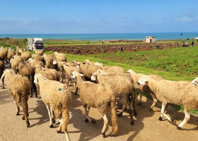 We zien verschillende schaapherders. De schapen grazen op heel drassige gronden met grote waterplassen. Ik las dat de Marokkaanse koning de burgers heeft opgeroepen niet massaal schapen te slachten voor het offerfeest in juni. Door zes te droge jaren op rij zijn er te weinig schapen waardoor de prijzen zijn geëxplodeerd. Voor veel mensen is het vlees nu al onbetaalbaar geworden. Het land heeft een deal met Australie voor de import van 100.000 schapen. Maar nu is het hier dus even niet zo heel droog.