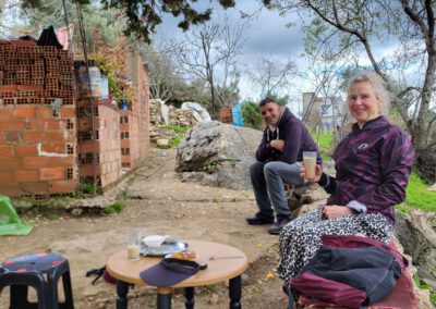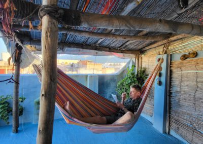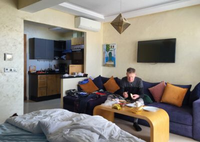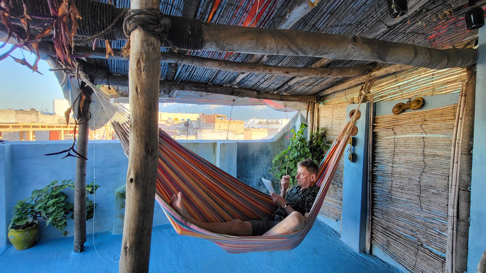 Tussen de bomen maken we onze eigen koffie dan maar, op het meegenomen brandertje. Even rustig genieten is er echter niet bij, want het begint weer te regenen. Onze geboekte studio in Asilah blijkt erg leuk, met uitzicht op de medina en de zee en met een balkon. We besluiten daarom morgen te blijven, dan kunnen we meteen wat was drogen op het balkon en administratie doen.