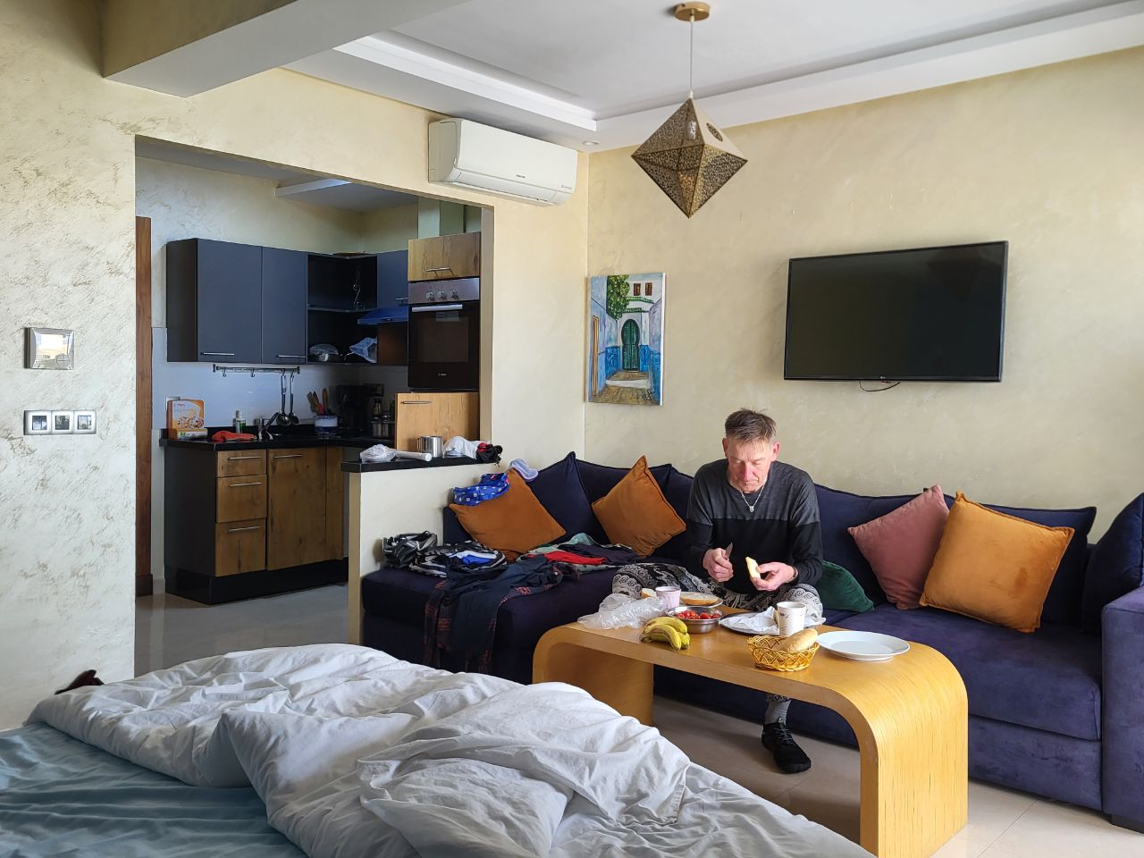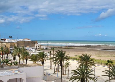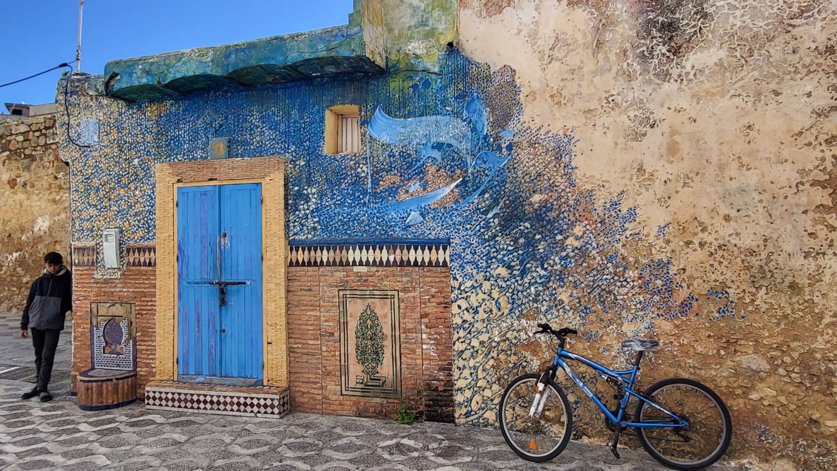 In een volgend stadje zien we een motor met laadbak stoppen langs de kant van de weg. Zijn lading plastic schuift hij vanuit de laadbak zo de berm in en rijdt vervolgens weer weg. In Larache hebben we een particulier appartementje geboekt. Het blijkt op de 5e etage en de enige veilige plek voor de fietsen is in ons appartement. Helaas passen ze niet in de minuscule lift, zelfs niet vertikaal. Dat wordt dus sjouwen. Niet heel handig in een trappenhuis waar het licht steeds maar 3 seconden aanblijft waarna je in complete duisternis de traptreden moet zien te vinden.