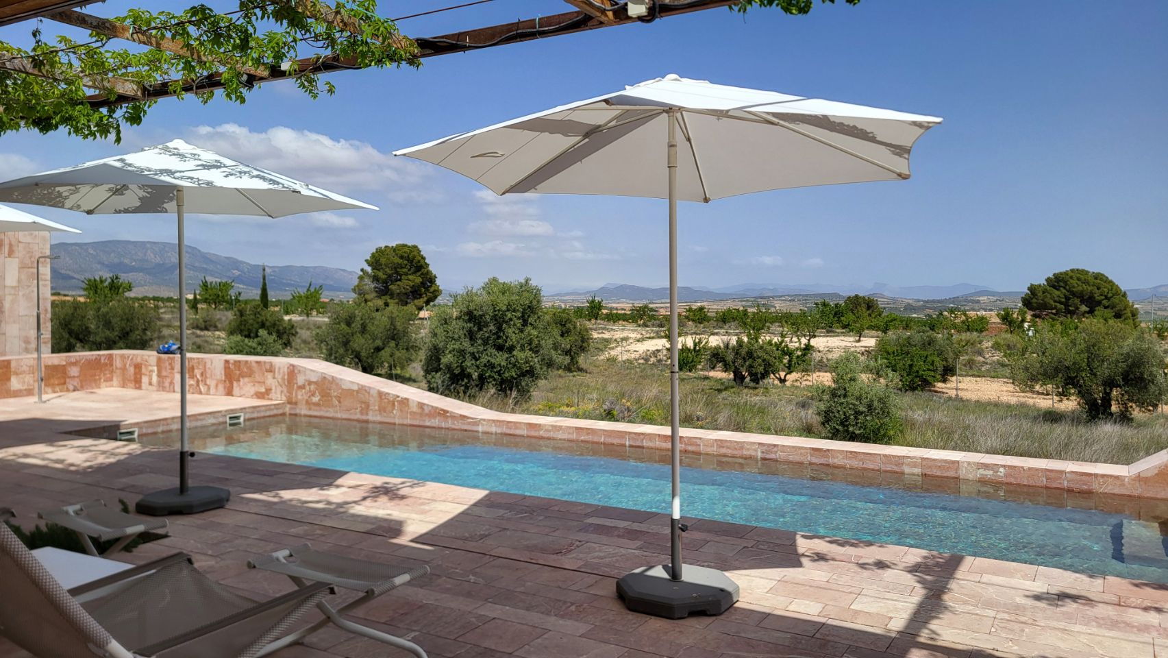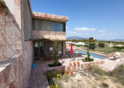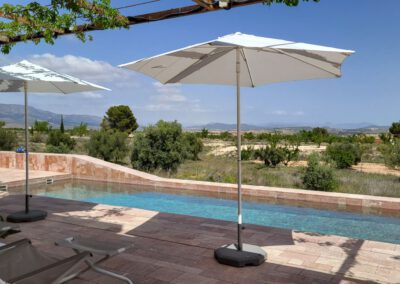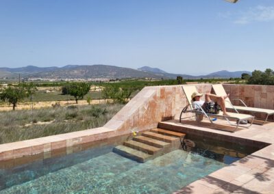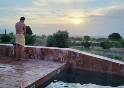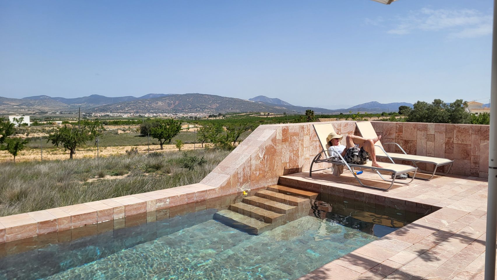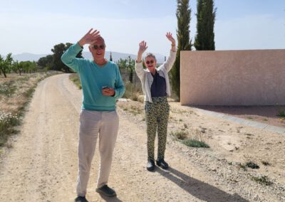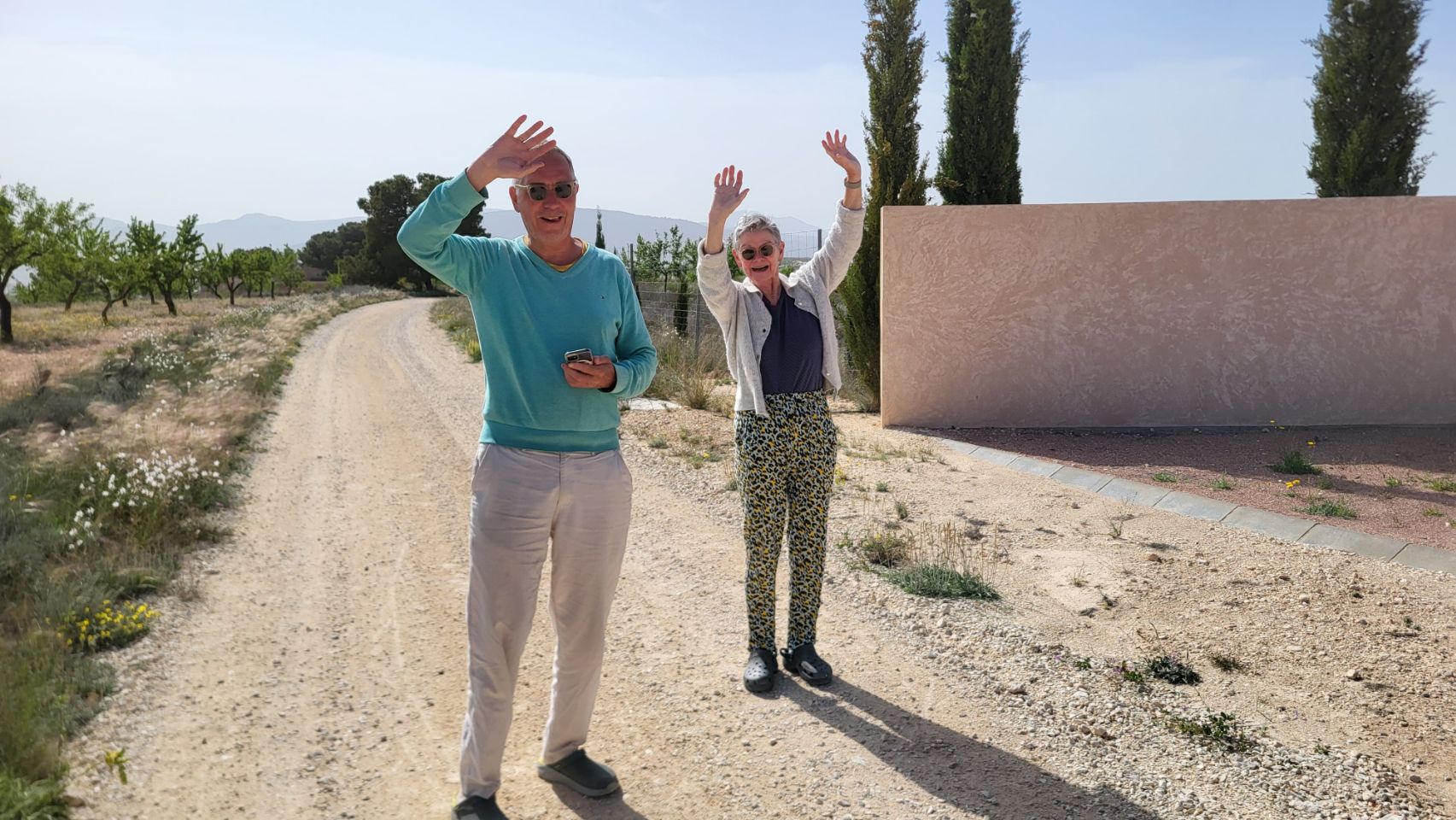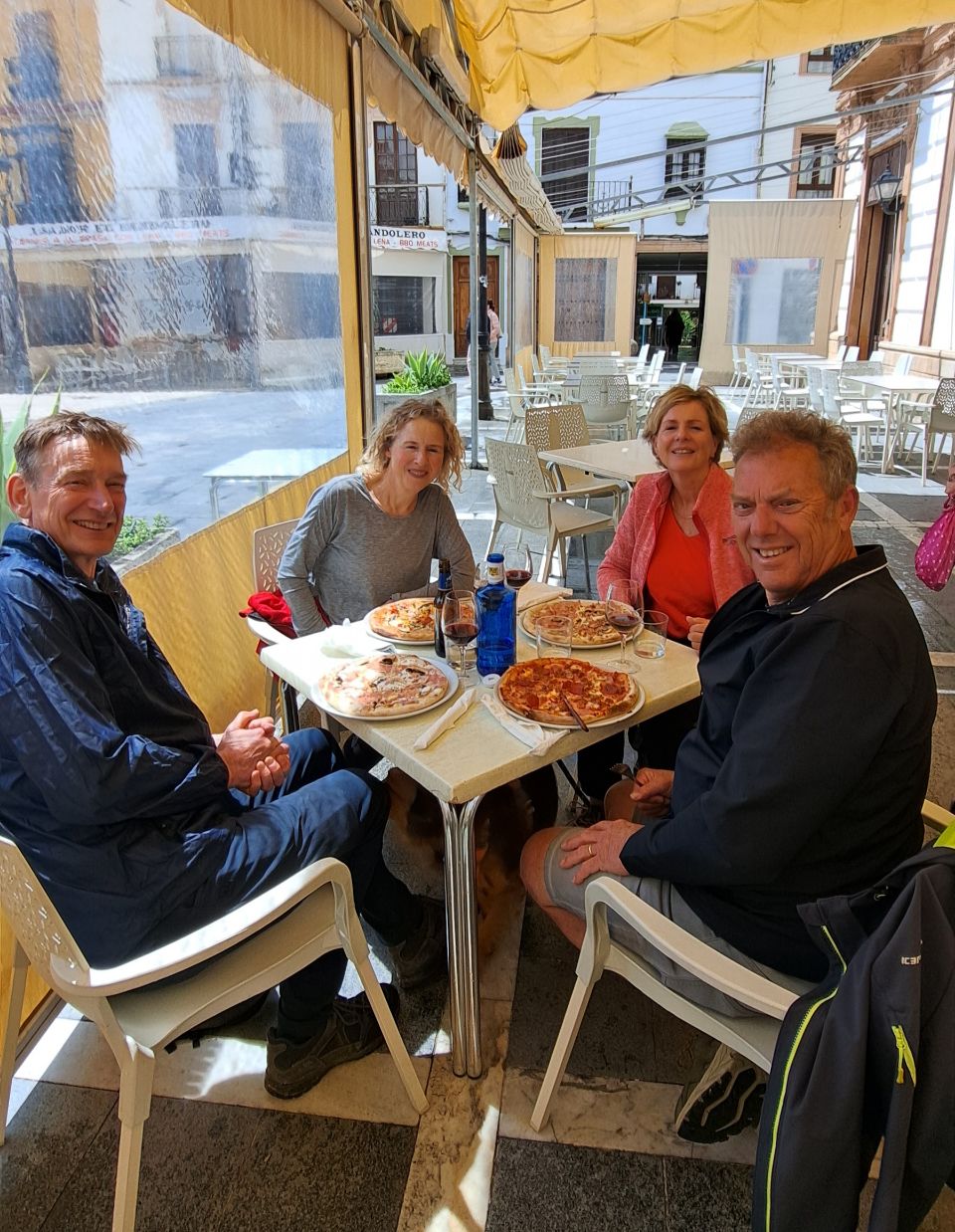 Internet doet het weer, al is het nog niet heel stabiel. Maar nu weten Kees en Anneke wel dat we er aan komen, want ook bellen ging gisteren niet meer. Het is een prachtige fietsroute naar Pinoso. Wel veel over hoofdwegen, maar het is vrij rustig. We komen langs fruitgaarden met citrusfruit, perzikken, abrikozen, pruimen en druiven. En natuurlijk ook hier weer veel amandel- en olijfbomen. En een ruimte! Je kan hier gewoon even 160.000 m2 kopen of huren. We fietsen zo’n 60 kilometer gestaag omhoog. We stijgen totaal 800 hoogtemeters en hoewel we om 9:00 uur al op de fiets zitten, komen we daardoor toch pas 17:00 uur aan. Kees en Anneke staan ons al op te wachten met hun camera gereed. Wat een schitterend huis met riant uitzicht over de omgeving. Hier houden we het wel enkele dagen uit!