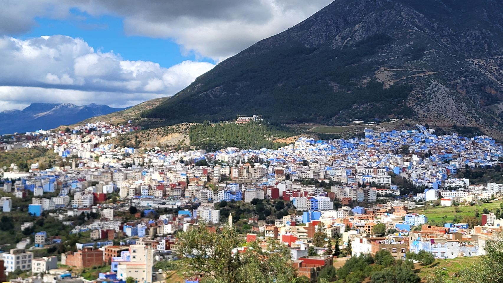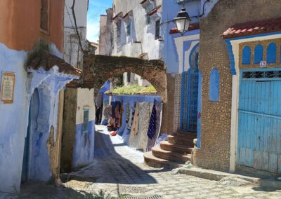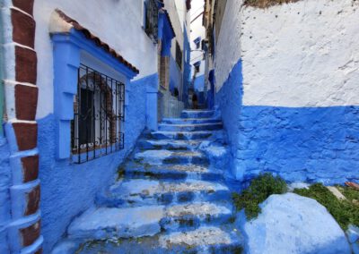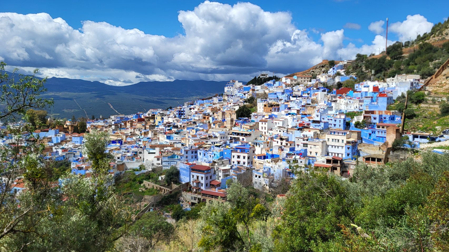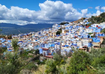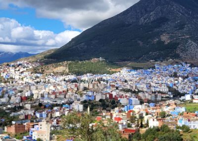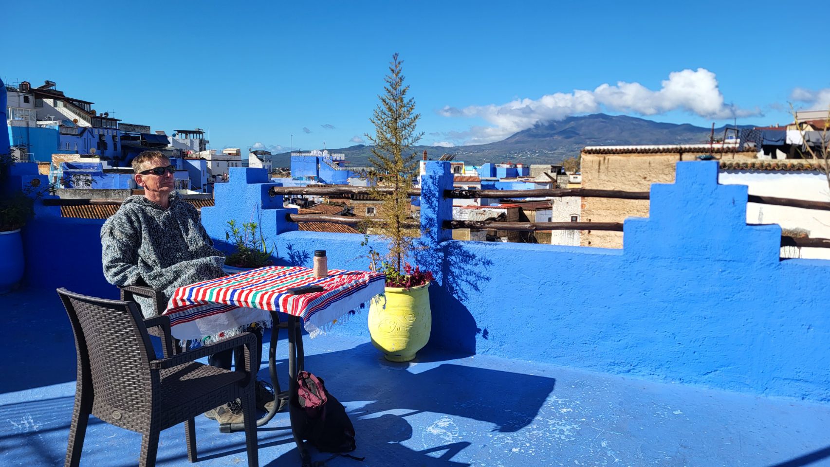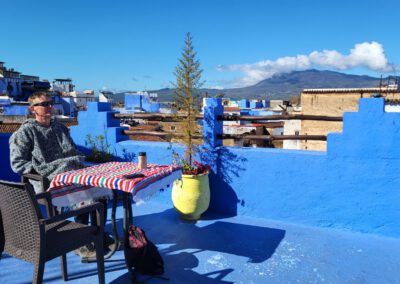 Het ontbijt is in de open lucht op het dakterras van onze riad. We zijn blij dat de zon schijnt waardoor het aangenaam is. Het uitzicht is prachtig. Over de kleurige huizen zien we de bergtoppen waar nog wat wolken omheen hangen. Via de blauwe straatjes van de medina wandelen we naar de voet van de berg en maken daar nog een rondwandeling. Aan de ene kant steken de bergen ruig omhoog en aan de andere kant ligt het stadje mooi blauw te wezen in de zon.