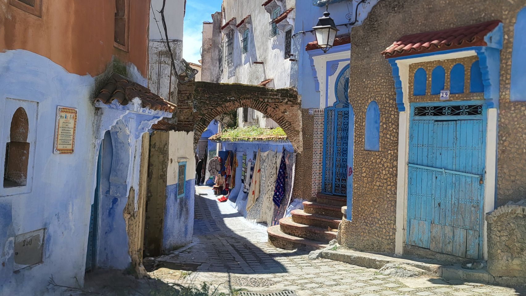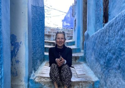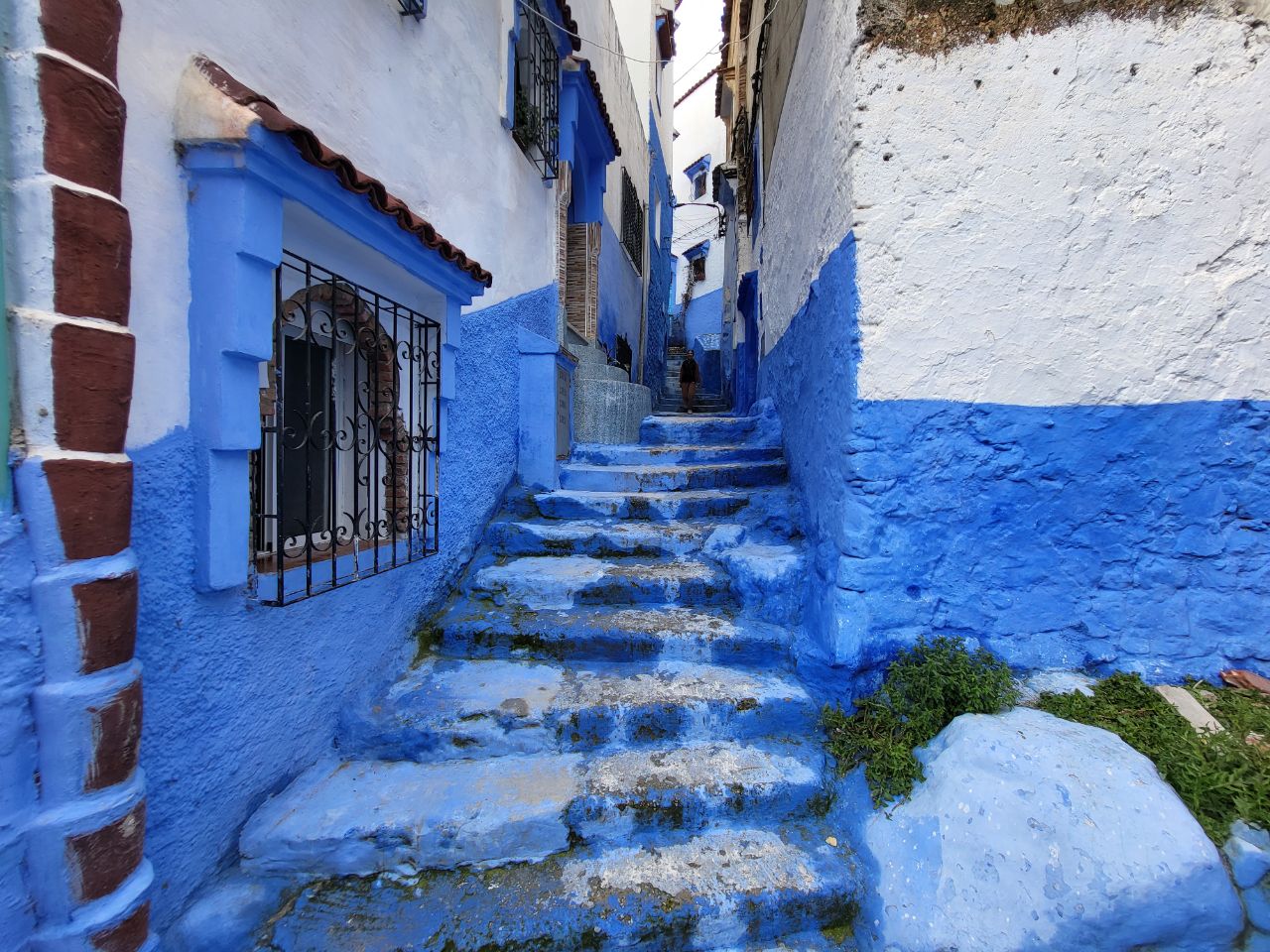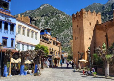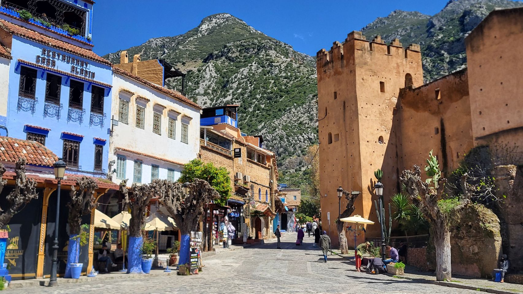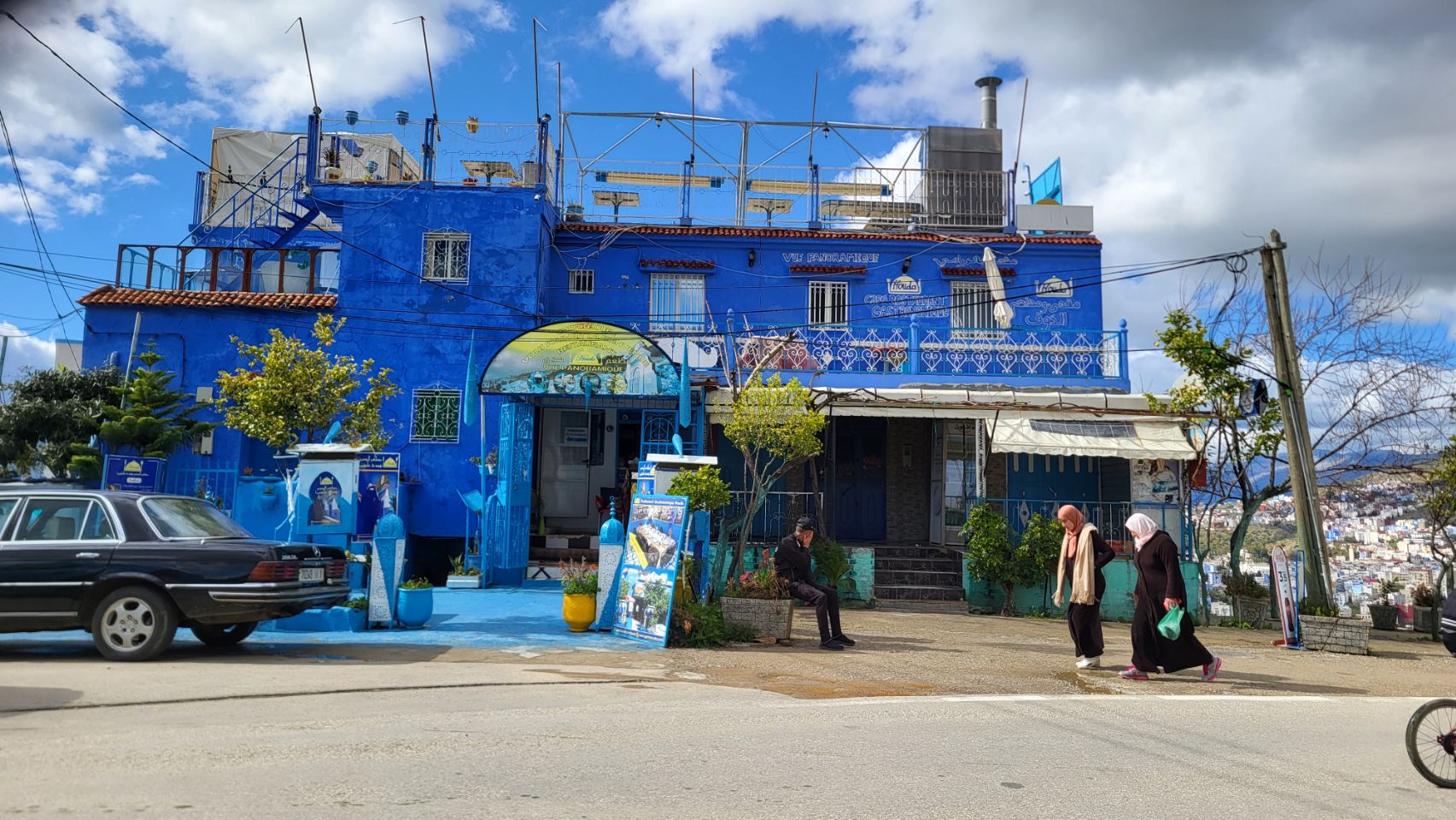 Het ontbijt is in de open lucht op het dakterras van onze riad. We zijn blij dat de zon schijnt waardoor het aangenaam is. Het uitzicht is prachtig. Over de kleurige huizen zien we de bergtoppen waar nog wat wolken omheen hangen. Via de blauwe straatjes van de medina wandelen we naar de voet van de berg en maken daar nog een rondwandeling. Aan de ene kant steken de bergen ruig omhoog en aan de andere kant ligt het stadje mooi blauw te wezen in de zon.