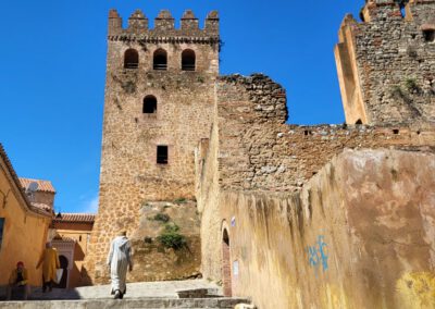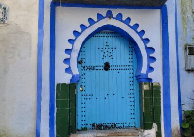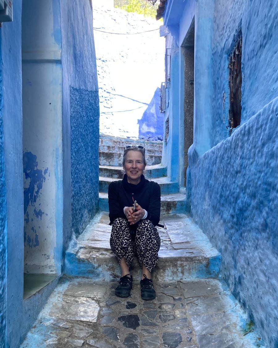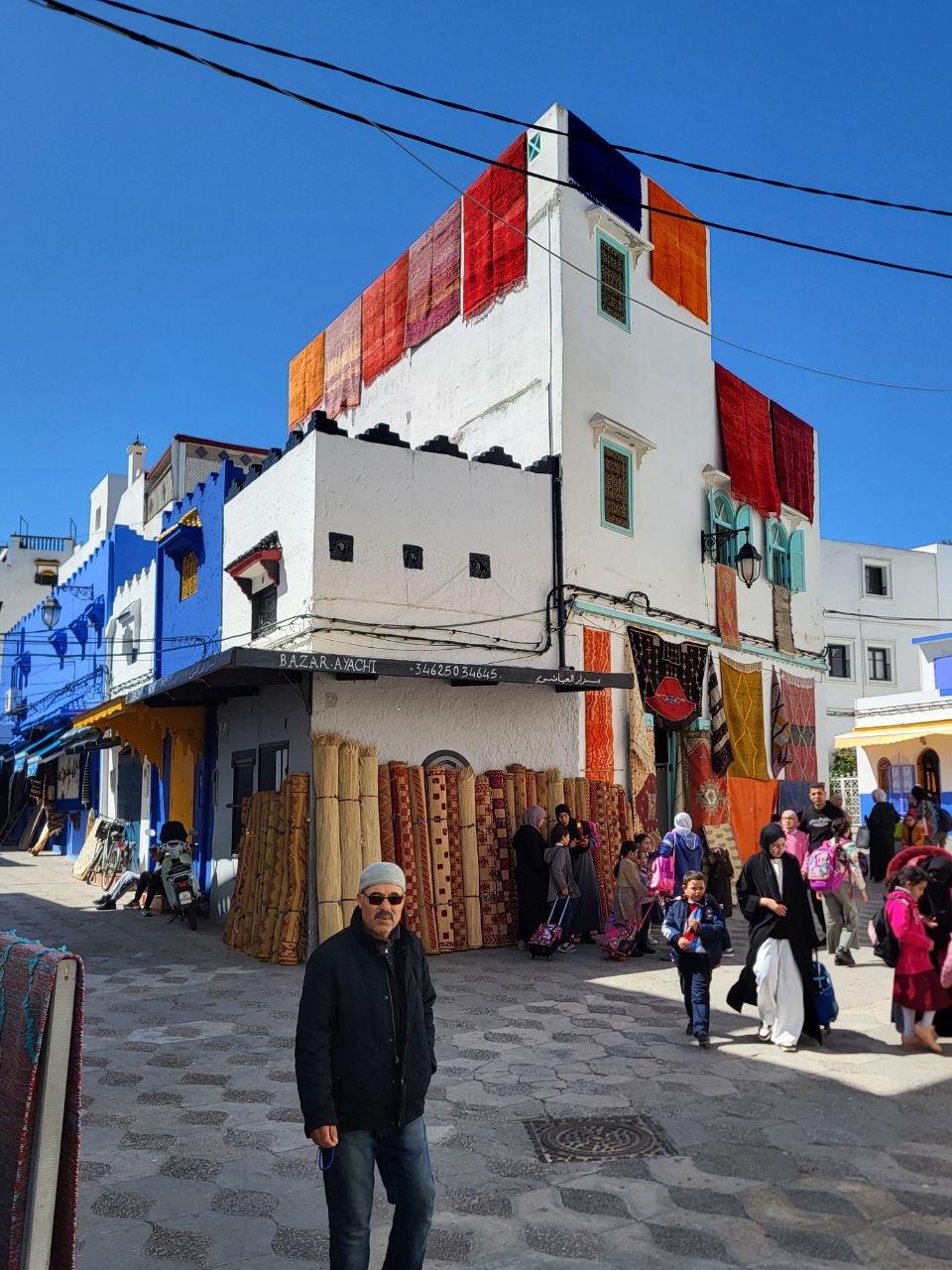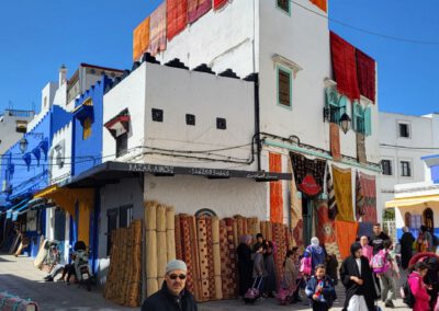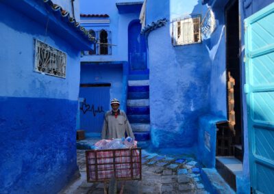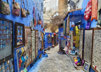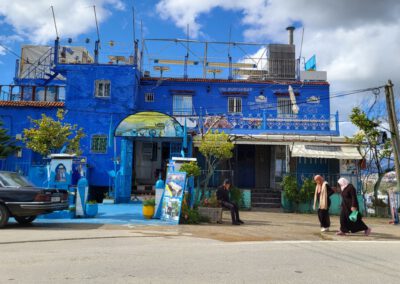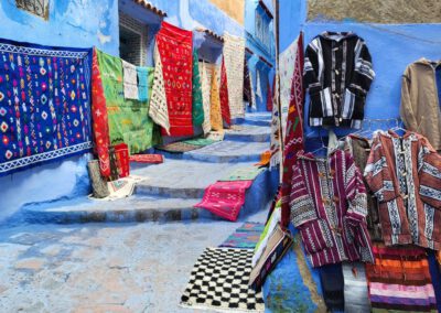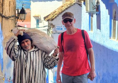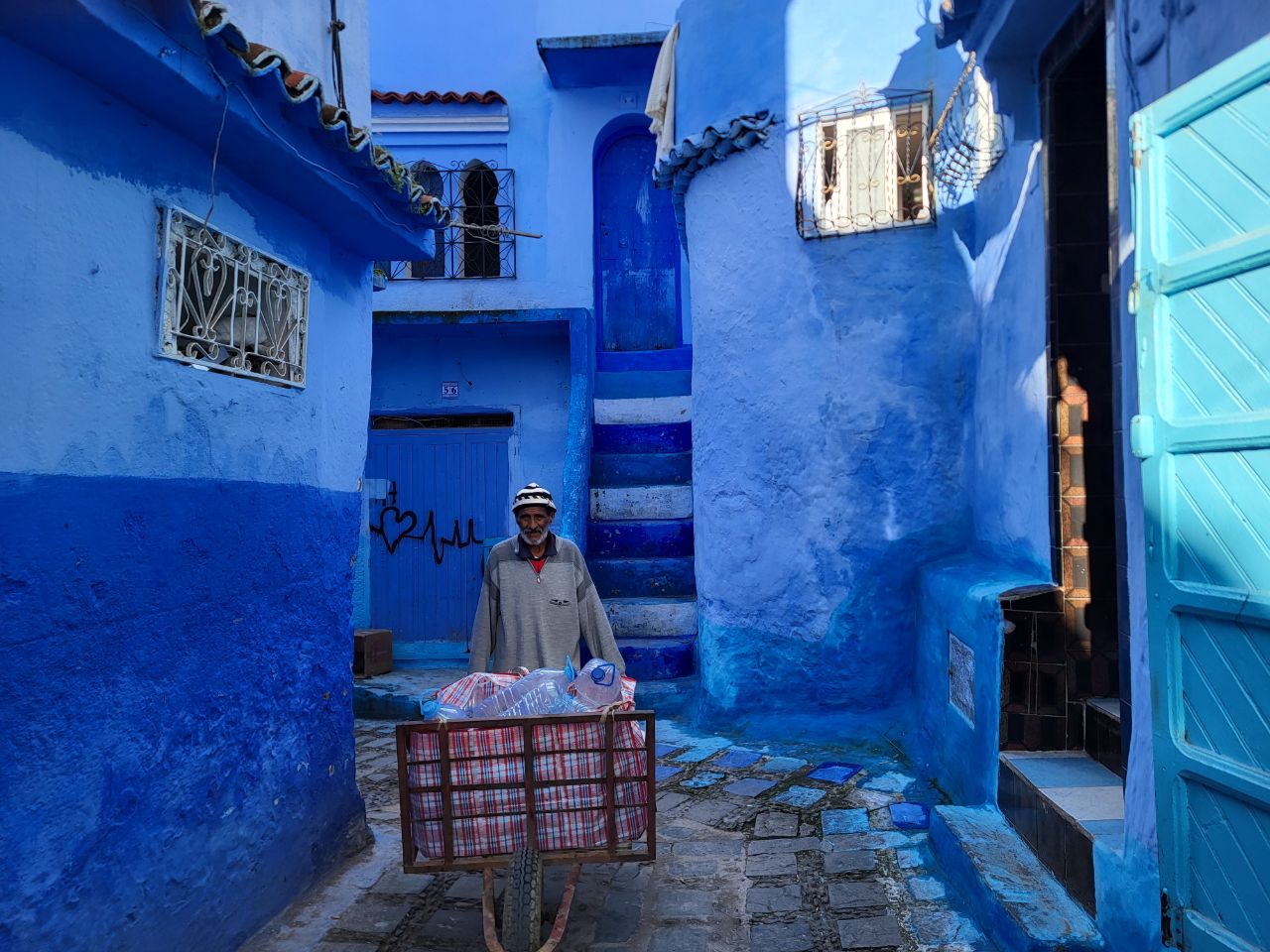 Het ontbijt is in de open lucht op het dakterras van onze riad. We zijn blij dat de zon schijnt waardoor het aangenaam is. Het uitzicht is prachtig. Over de kleurige huizen zien we de bergtoppen waar nog wat wolken omheen hangen. Via de blauwe straatjes van de medina wandelen we naar de voet van de berg en maken daar nog een rondwandeling. Aan de ene kant steken de bergen ruig omhoog en aan de andere kant ligt het stadje mooi blauw te wezen in de zon.