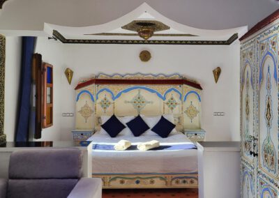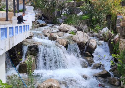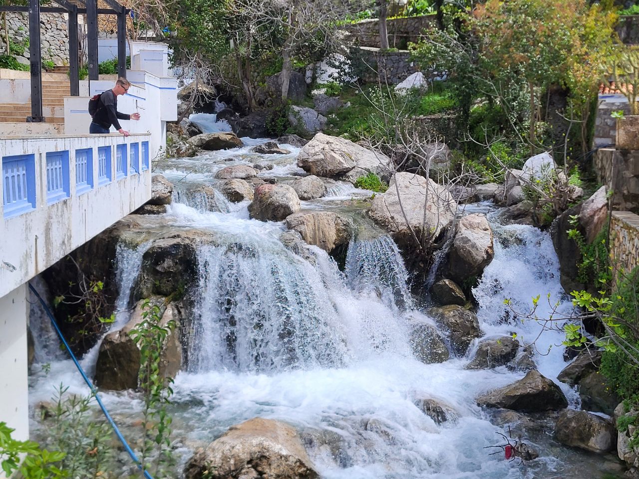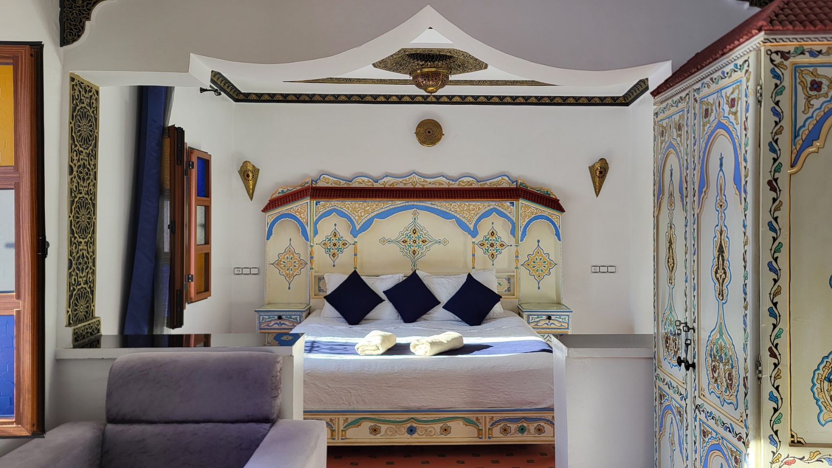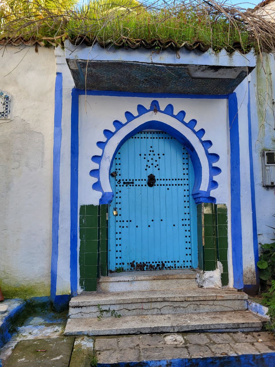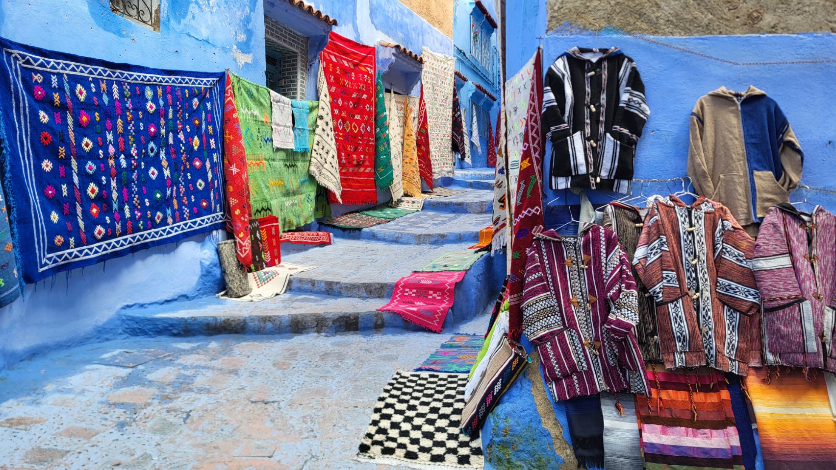 Het ontbijt is in de open lucht op het dakterras van onze riad. We zijn blij dat de zon schijnt waardoor het aangenaam is. Het uitzicht is prachtig. Over de kleurige huizen zien we de bergtoppen waar nog wat wolken omheen hangen. Via de blauwe straatjes van de medina wandelen we naar de voet van de berg en maken daar nog een rondwandeling. Aan de ene kant steken de bergen ruig omhoog en aan de andere kant ligt het stadje mooi blauw te wezen in de zon.