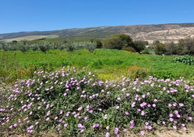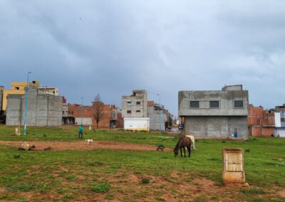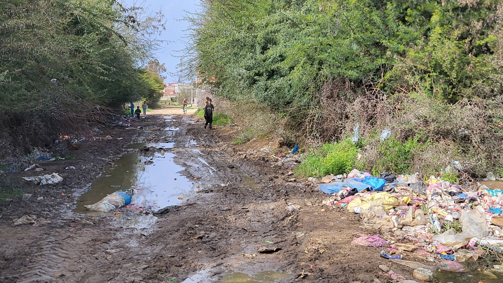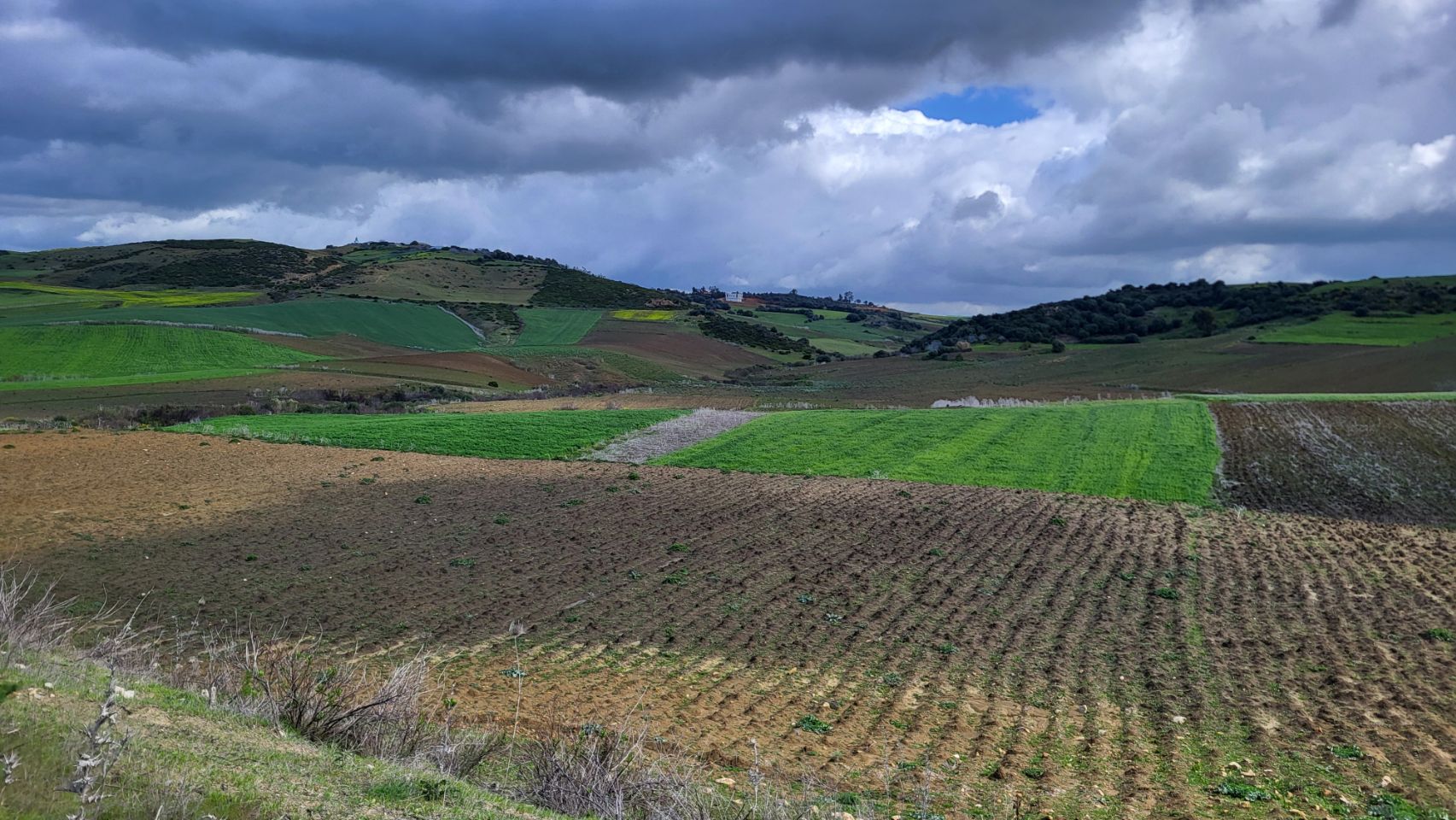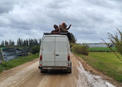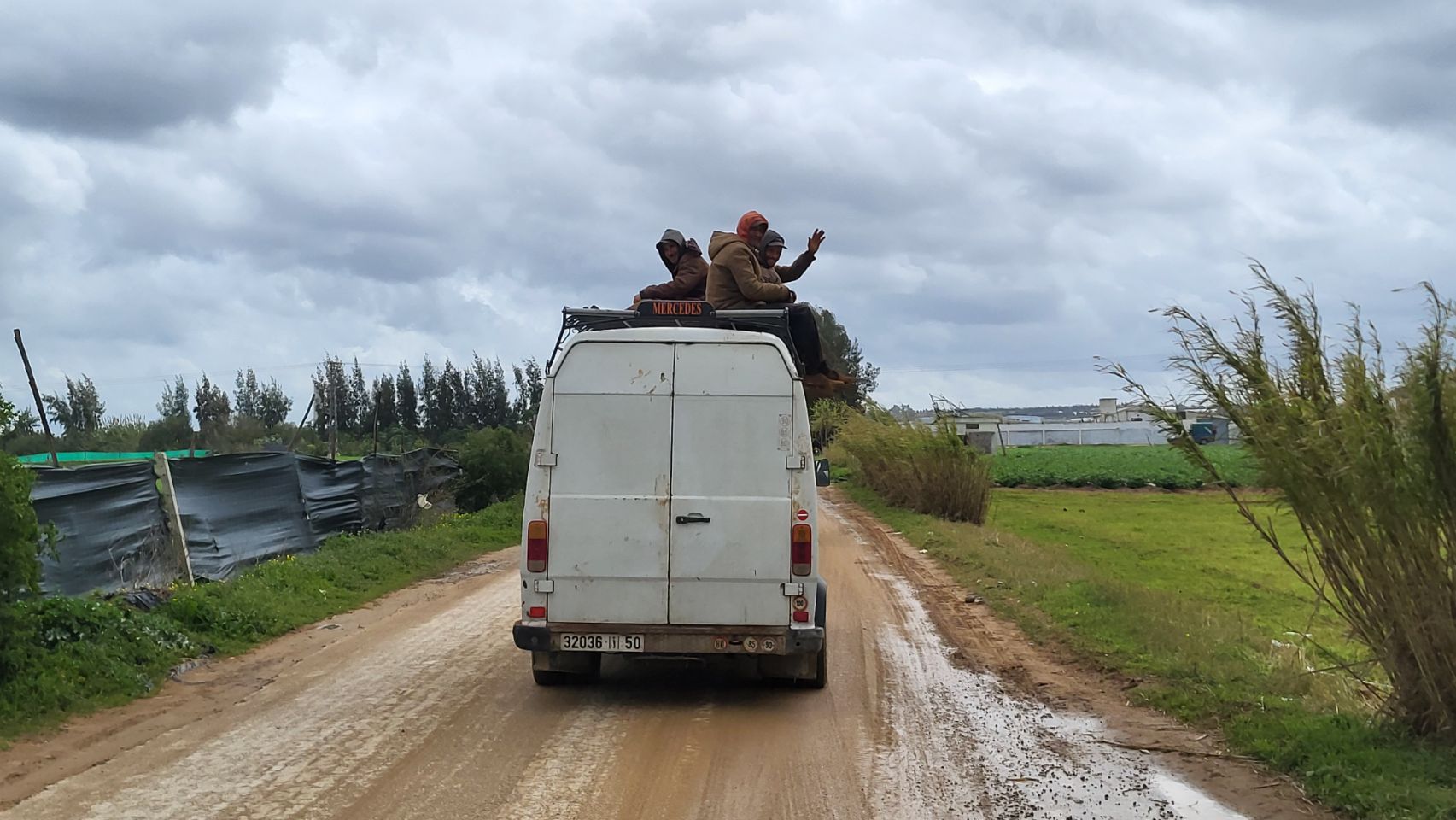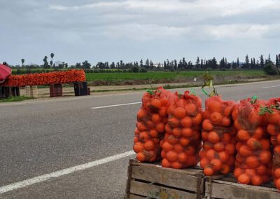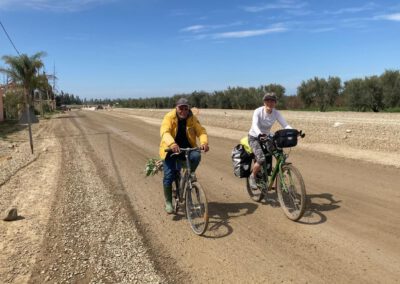 En weer vertrekken we in de regen. De harde wind hadden we al om het appartementencomplex horen gieren. Maar koud is het niet en het regent steeds maar heel kort. Veel oude appartementsgebouwen in de buitenwijk van Larache staan leeg en aan de rand ligt een uitgestrekte open vuilnisbelt. Daarna is het gedaan met het asfalt en komen we op bultige modderige landweggetjes terecht. We fietsen tientallen kilometers door land- en tuinbouwgebied. Aardbeien, bosbessen, frambozen, fruitbomen, notenbomen, tomaten, aardappels, uien, wortels, bonen en meer. Deels wordt dit in plastic tunnelkassen geteeld.