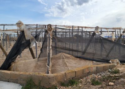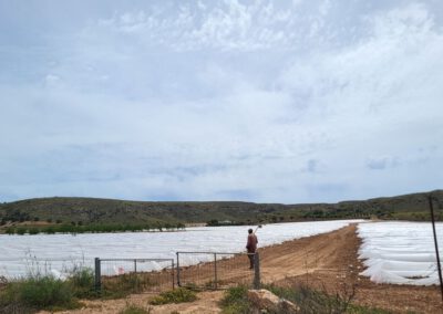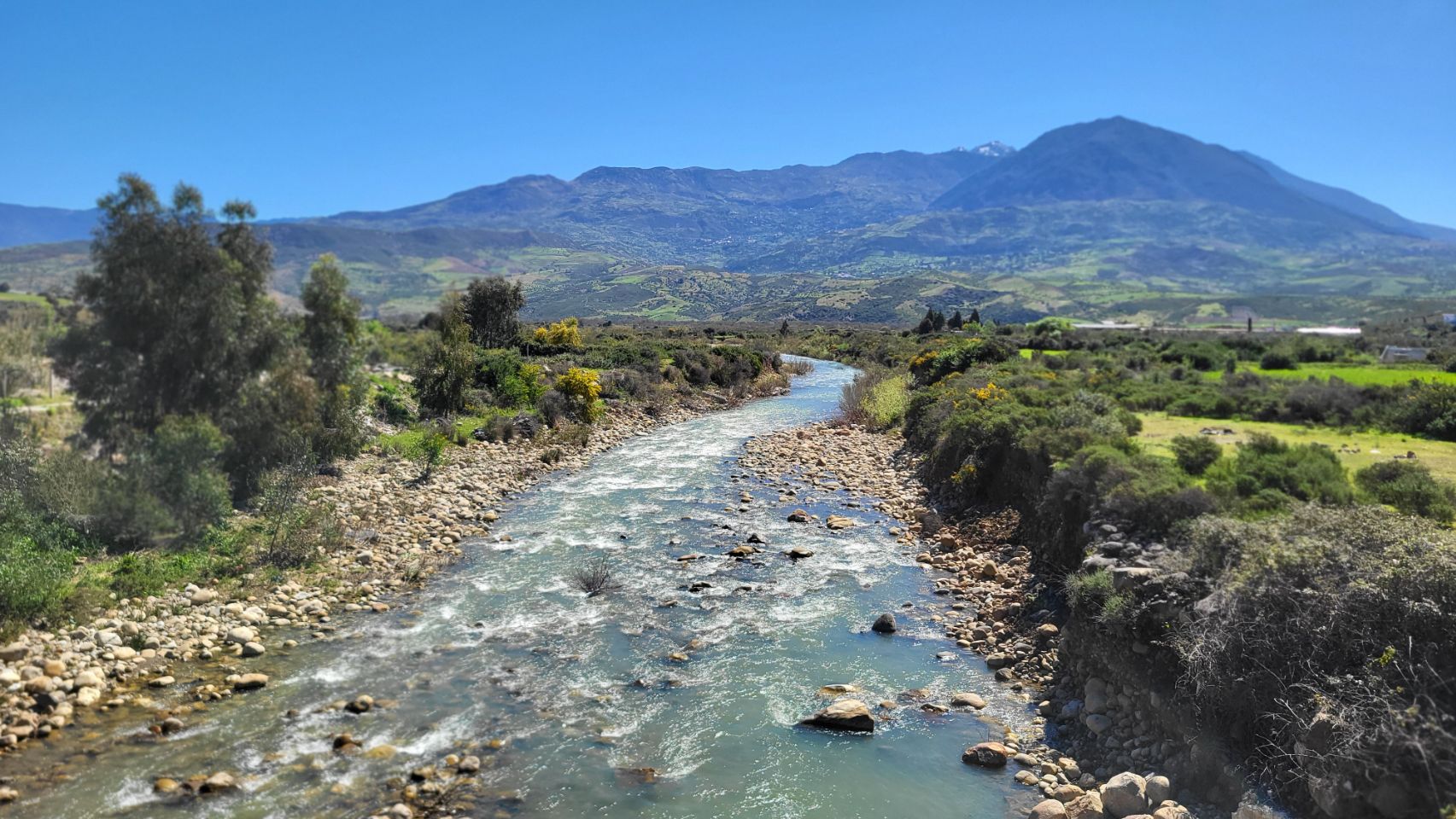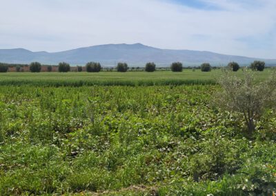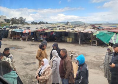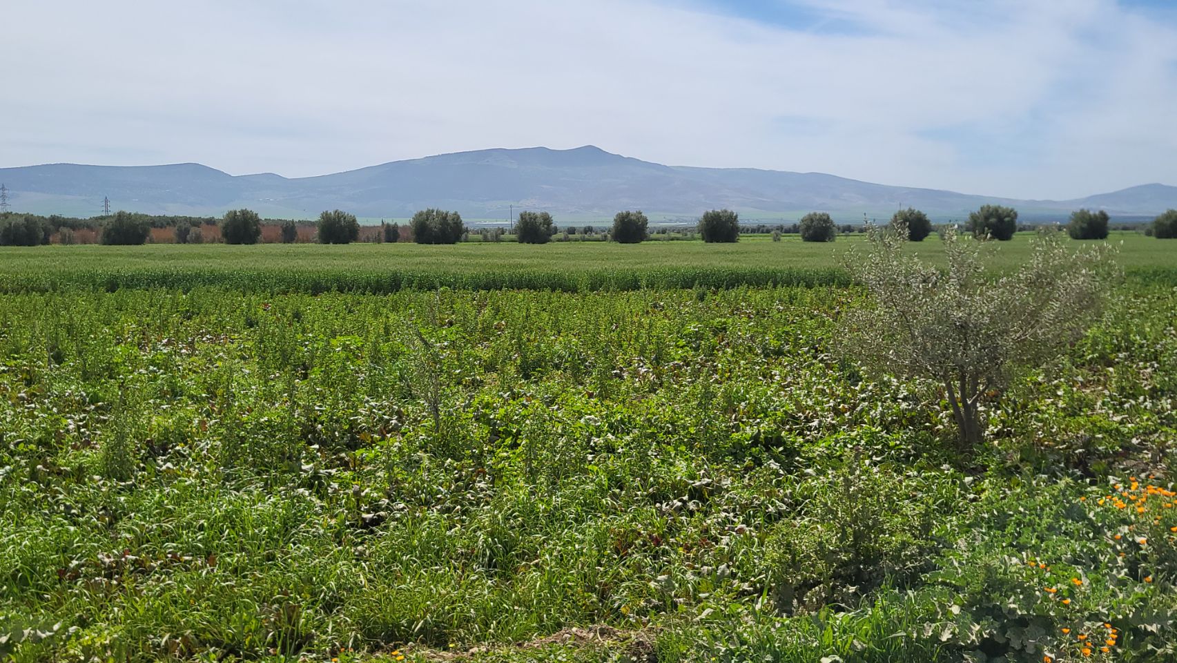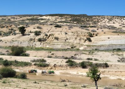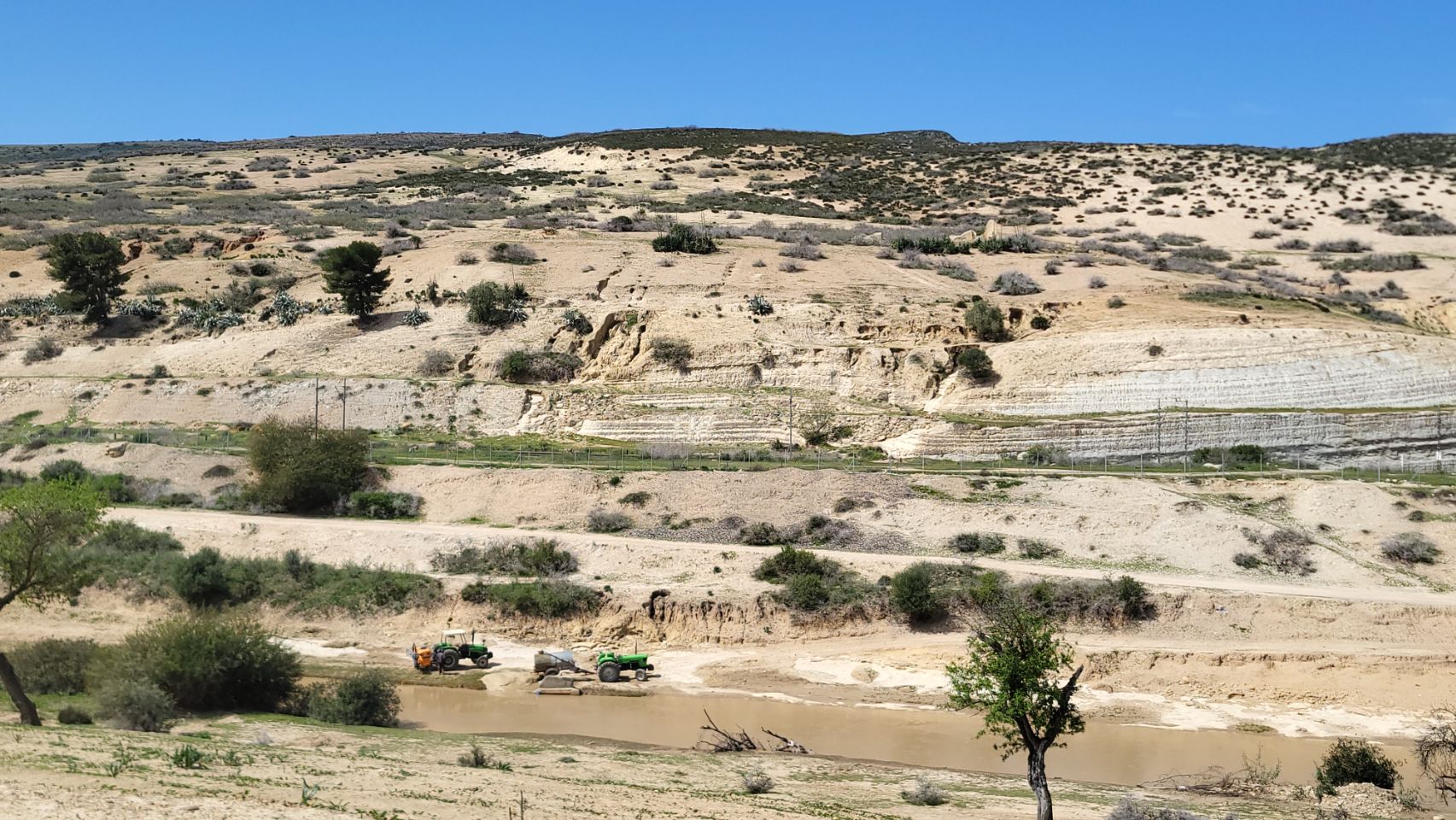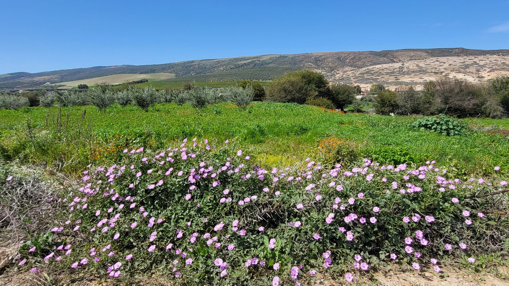 En weer vertrekken we in de regen. De harde wind hadden we al om het appartementencomplex horen gieren. Maar koud is het niet en het regent steeds maar heel kort. Veel oude appartementsgebouwen in de buitenwijk van Larache staan leeg en aan de rand ligt een uitgestrekte open vuilnisbelt. Daarna is het gedaan met het asfalt en komen we op bultige modderige landweggetjes terecht. We fietsen tientallen kilometers door land- en tuinbouwgebied. Aardbeien, bosbessen, frambozen, fruitbomen, notenbomen, tomaten, aardappels, uien, wortels, bonen en meer. Deels wordt dit in plastic tunnelkassen geteeld.