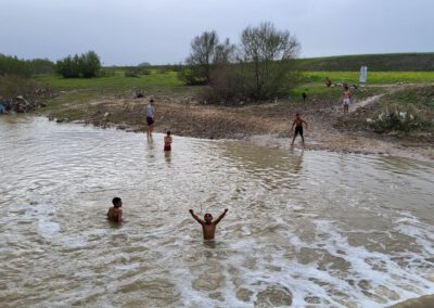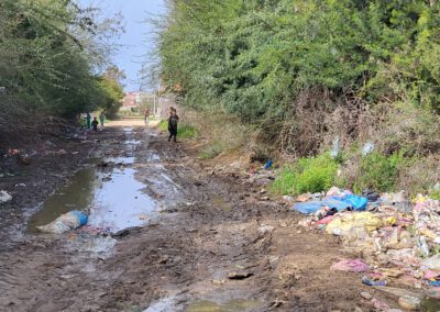 Vele grote witte personenbusjes brengen en halen personeel. Net als de vrachtwagens, paard en wagen, ezels en motoren slalommen ze om de vele grote gaten in de kapotte weg. Door alle modder kan je nauwelijks nog het asfalt zien. Op veel vrachtwagens zitten werklui op het dak van het vervaarlijk heen en weer zwaaiende voertuig. We komen door een stuk natuurgebied, dat ook weer vol met afval ligt. Daarna fietsen we door enkele erg armoedige plaatsen. Hier ligt al helemaal enorm veel troep, de mensen leven letterlijk tussen hun afval. We worden er niet echt vrolijk van.