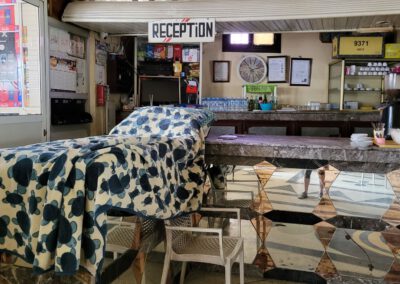 We hebben brood, jam en noten gekocht gisteravond. Water voor de thee koken we in de kamer op het gaspitje en dan kunnen we zittend op het bed ons ontbijt eten. Daarna koken we nogmaals water maar dan voor de koffie. Dan zijn we klaar om in te pakken en te vertrekken. Als we beneden komen ligt een van de uitbaters van het hotel op een matras boven op de bar. Die heeft na zijn vroege zonsopgangsontbijt nog een paar uurtjes slaap gepakt.
