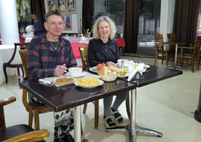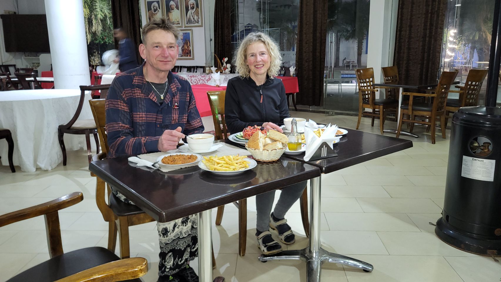 Het hotel blijkt stokoud en alles is viezig. Als ik de douche aanzet, springt meteen de slang los en spuit het water via het plafond de badkamer, of beter badhok, in. Het hotel heeft een klein restaurant en daar gaan we eten. We zijn de eersten, maar de obese serveerster heeft er nu al geen zin meer in en komt verveeld aansloffen. Ze verdwijnt de keuken in en komt al snel de gegrilde paprika met gebakken ei en patat brengen. Ik verheug mij op de “eindelijk!!” gegrilde paprika. Dit blijken enkele vliesdunne plakjes van een slechte versie uit een pot te zijn, volledig bedolven onder een hoeveelheid slappe patat.