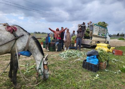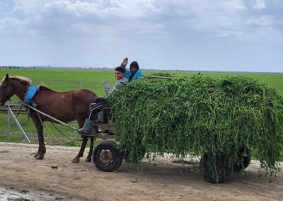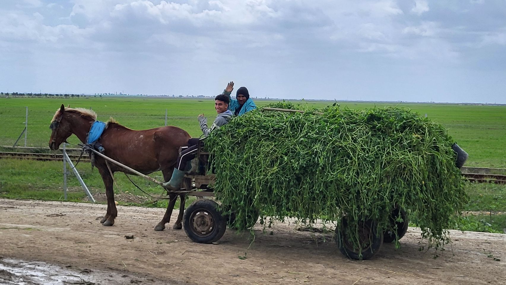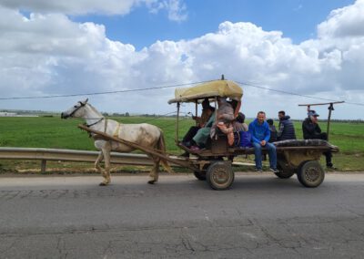 De 68 kilometer (inclusief 12 verkeerd gereden) zijn grotendeels vlak. We volgen een vrij rustige hoofdweg waar behalve auto’s en vrachtverkeer ook veel paardenwagens en tuktuks (al heten die hier waarschijnlijk anders) rijden. Maar ook fietsers komen ons regelmatig tegemoet. Er wordt veel gezwaaid, getoeterd en zelfs geapplaudiseerd naar ons en we zwaaien vrolijk terug. De artisjokken worden geoogst. Het zijn heel zware vruchten dus het stapelen op de wagen is een zware klus voor de mannen met een lege en dorstige maag.