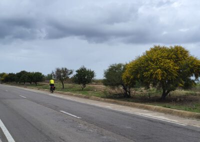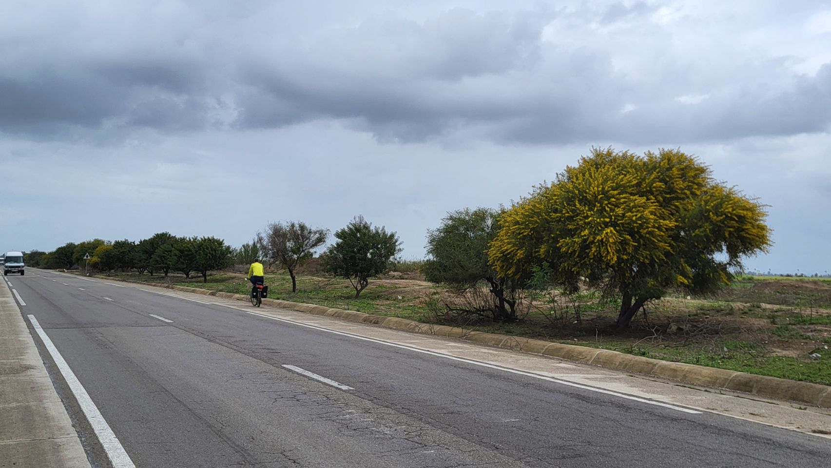 Vanwege de voorspelde harde tegenwind, staan we bijtijds op zodat we rond 8:00 kunnen vertrekken. De komende week gaat het veel regenen en deze laatste droge dag willen we daarom maar meteen 90 km wegtrappen. Het eerste uur rijden we nog door de verkeersdrukte van Sevilla. Het is steeds speuren naar het groene fietspad, dat slingert van links naar rechts van de weg en terug en soms door een middenberm.