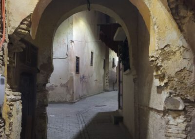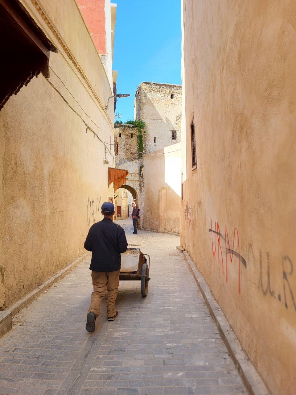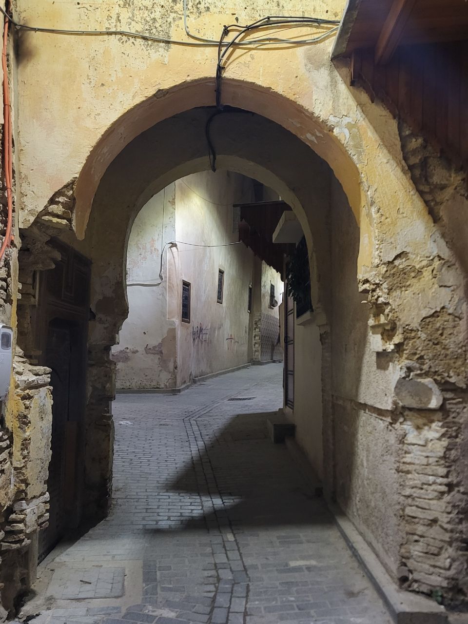 Ook vandaag wordt weer veel getoeterd en gezwaaid. Nog een laatste stevige klim en we arriveren in Meknes. We hebben een kamer in een riad gereserveerd die in de medina blijkt te liggen. Een riad is een oorspronkelijk groot familiehuis rond een binnenplaats. Met de fiets aan de hand lopen we door het doolhof aan smalle gangetjes vol kraampjes en mensen op zoek naar onze riad. Een uurtje later is alles stil en uitgestorven…zonsondergang, dus etenstijd. Wij zijn eerst aan koffie toe. De koffietentjes worden bevolkt door rokende mannen. Overdag mogen ze nu niet roken dus na zonsondergang hebben ze wat in te halen. Buiten de medina in een duister straatje vinden we een piepklein restaurantje waar we wat kunnen eten.