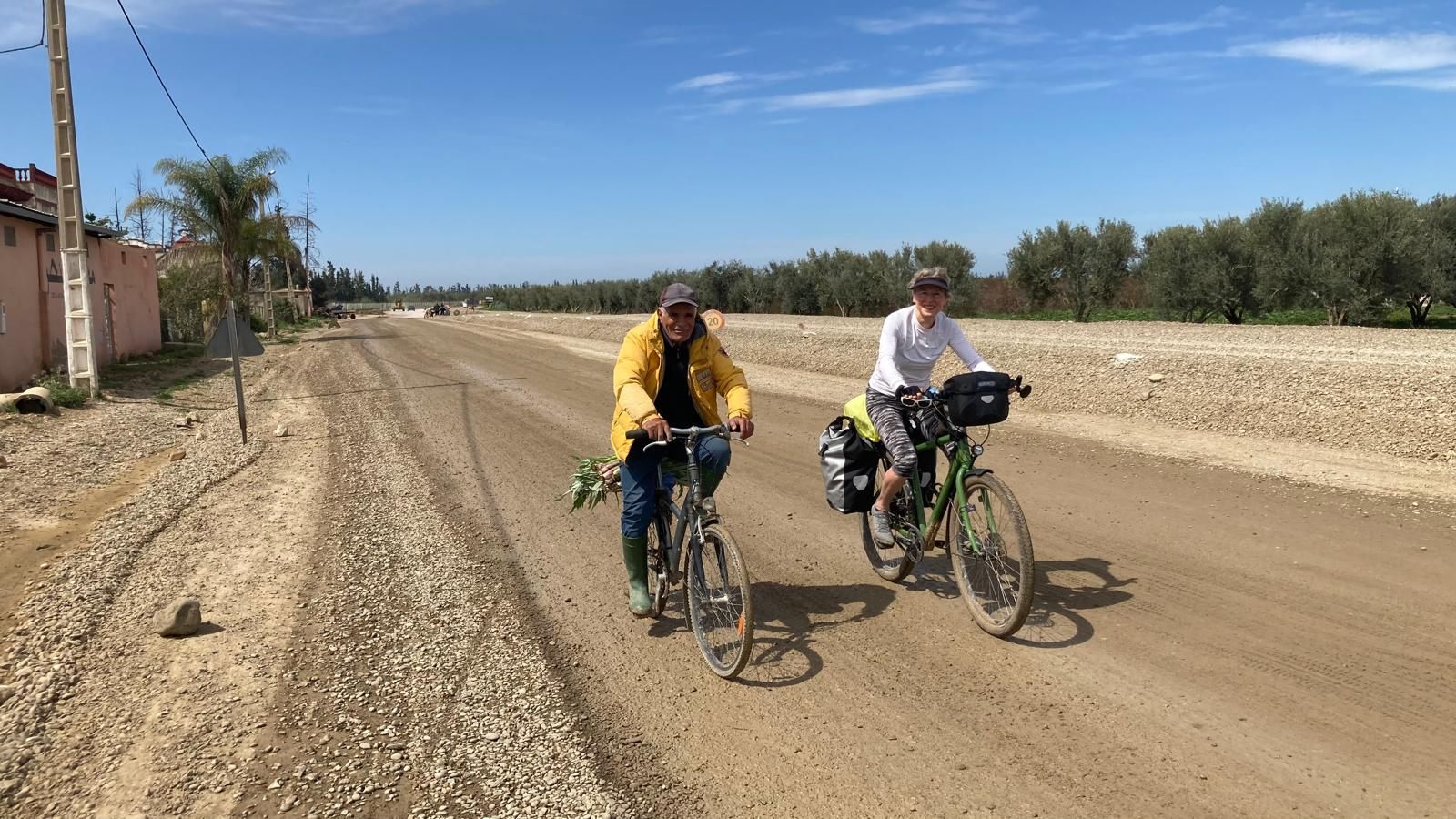 De werkloosheid in Marokko is torenhoog. Maar er zijn heel wat handjes nodig in dit uitgestrekte land- en tuinbouwgebied, waardoor hier de werkloosheid een stuk lager ligt. En we zien nog veel meer werk dat gedaan kan worden, maar daar zal wel onvoldoende geld voor zijn. Via een brug over de rivier en spoorlijn arriveren we in Sidi Slimane midden in de chaos van druk verkeer en een markt. We vinden een hotel, wassen wat kleding, kopen eten voor morgen en twee gebakjes die er heel lekker uitzien. Omdat we nog even moeten wachten op de zonsondergang eten we de gebakjes alvast op onze kamer. We kunnen daarna in ons eigen hotel eten en worden verrast met een heerlijke maaltijd in een verder lege eetzaal.