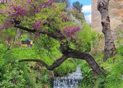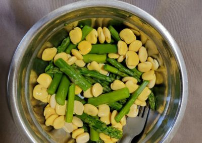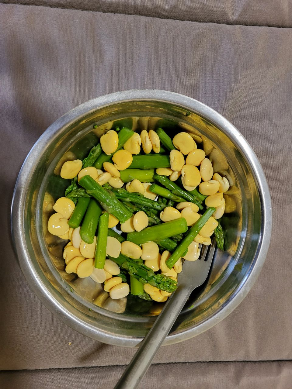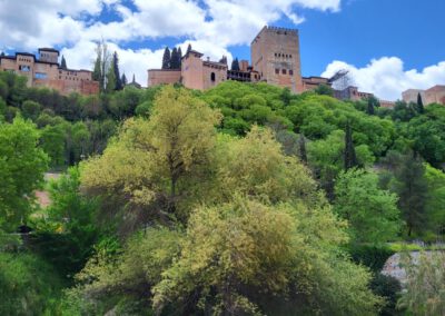 In Granada parkeren we onze fiets met bagage op een druk punt zodat er veel sociale controle is. We wandelen door het centrum waar het megadruk is met toeristen. De winkeltjes verkopen Marokkaanse spullen en kleding, geheel in lijn met het Moorse Alhambra. Er worden inderdaad nog last-minute tickets verkocht, voor 195 euro p.p. kunnen we naar binnen. Toch maar niet, we wandelen er wel omheen en doen het met de buitenkant en de tuinen. Onderweg naar ons hotel in een bergdorp kopen we een bosje verse groene asperges en ingemaakte lupineboontjes. We zagen vanmorgen de asperges op de velden waar ze werden geoogst. Omdat de restaurants zelden andere groente serveren dan een salade, koken we vanavond in de badkamer van ons hotel onze eigen groente op het campinggasje. Het is een heerlijke combinatie, de zoute boontjes met de knapperige asperges. Beetje olijfolie er over en genieten!