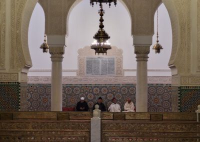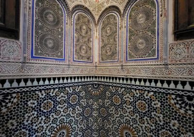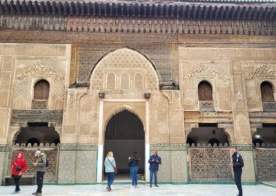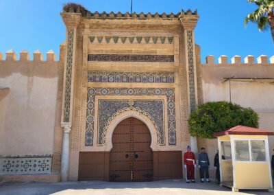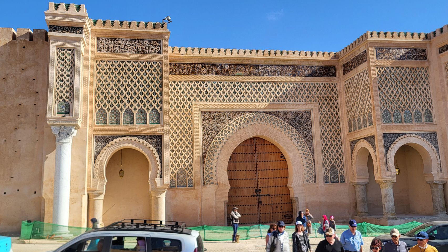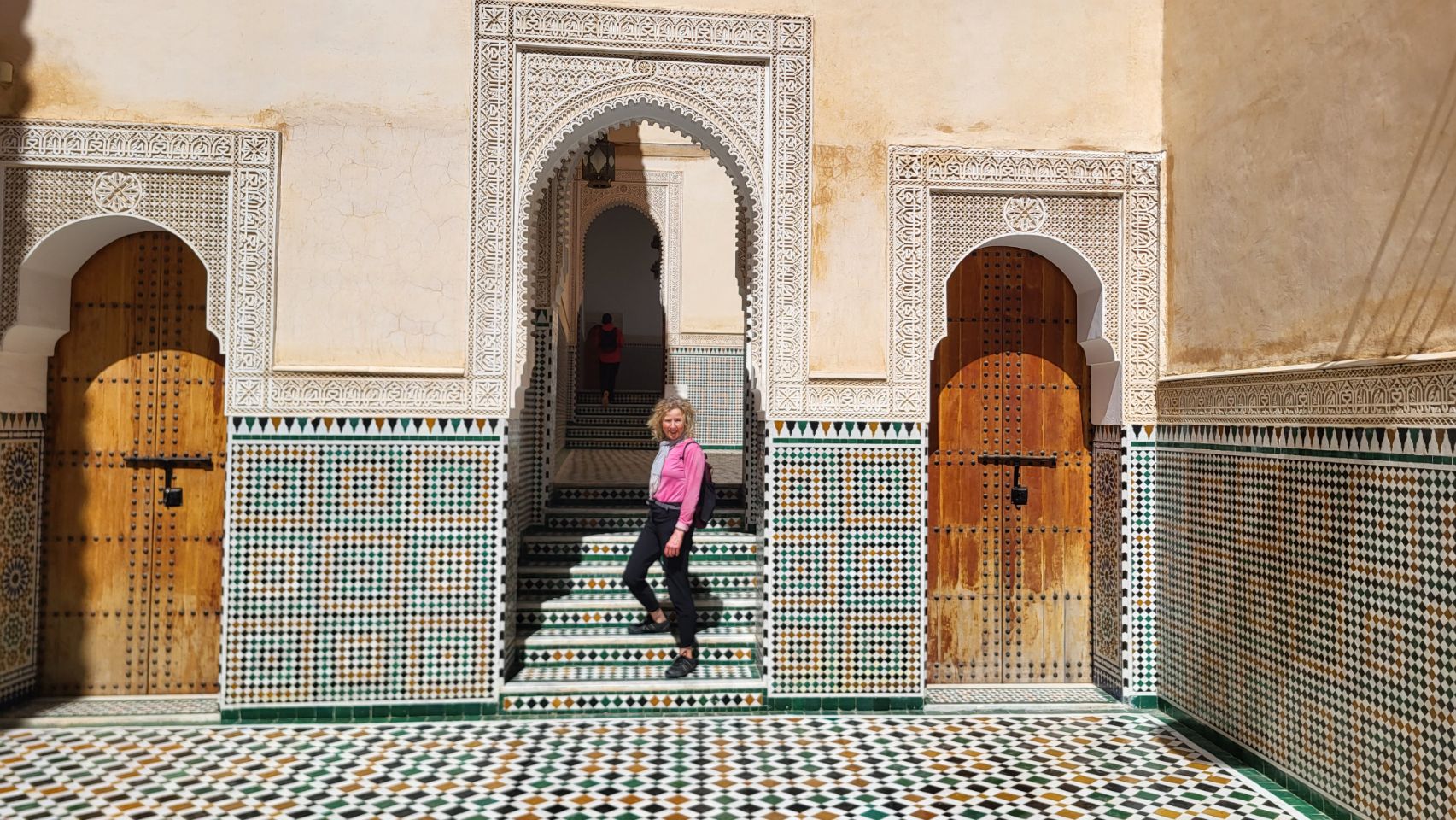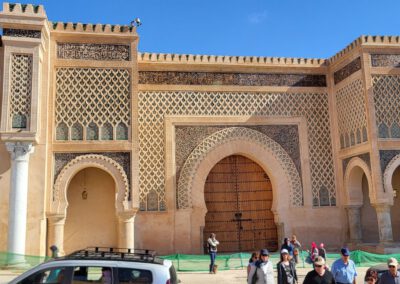 Het is vrijdag gebedsdag en ons is verteld dat alles dicht is tot 14:00 uur. We doen dus rustig aan na het ontbijt en bereiden ons verblijf in Fez alvast voor. ’s Middags gaan we de deur uit voor een bezoek aan het mausoleum van de sultan Moulay Ismaïl, de koning van Meknes die in 1727 overleed. In zijn nadagen richtte hij zich volledig op de bouw van zijn eigen graf dat groots en schitterend moest worden. Hij zou 500 vrouwen hebben gehad en 667 kinderen verwekt, dan kan je wel een goede rustplaats gebruiken. Het is een prachtig gebouw geheel in stijl van de islamitische architectuur.