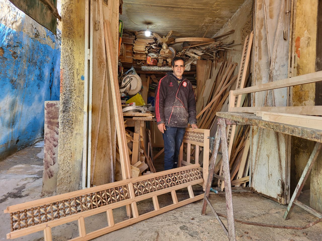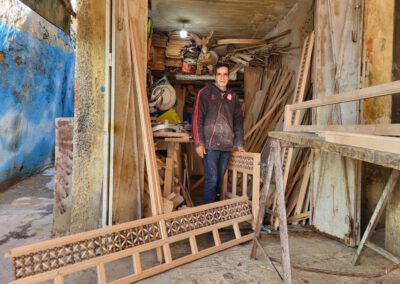 Het riad serveert een goed ontbijtbuffet. Een groepje Duitsers zit echter zo te schranzen dat er voor anderen weinig over blijft. We struinen daarna een beetje door de stad. We komen langs ambachtelijke werkplaatsjes en verbazen ons over het vakmanschap. Wat een prachtige dingen maken ze met de hand van hout en metaal. We kopen een klein souvenier en armband van metaal dat met zilverdraad is bewerkt.